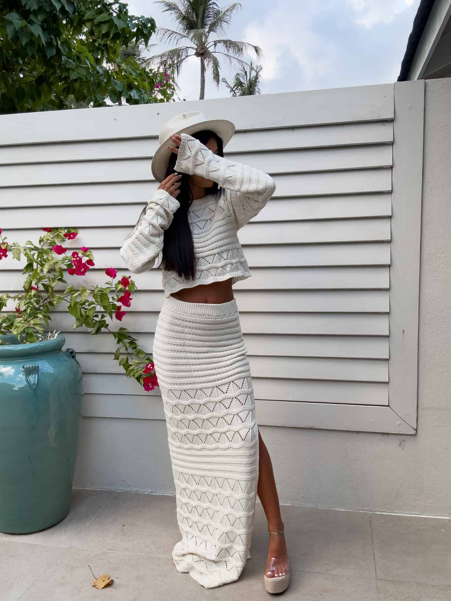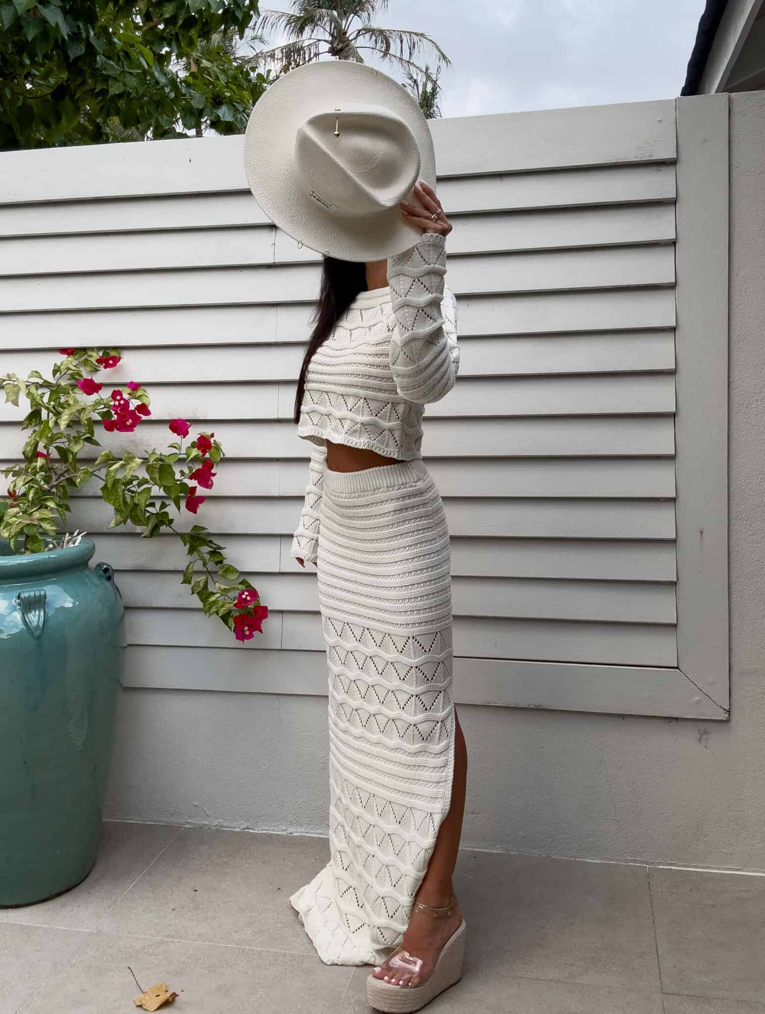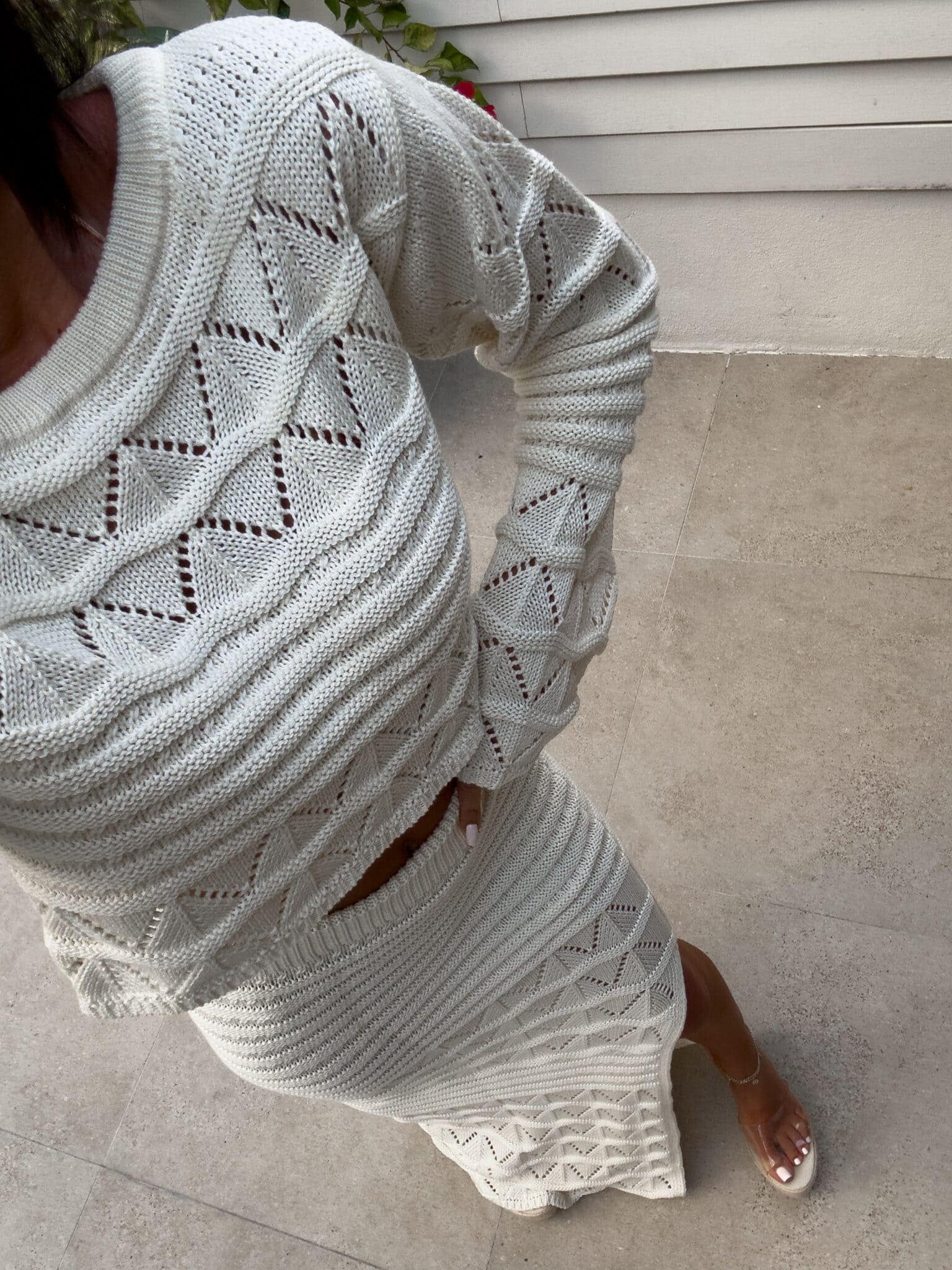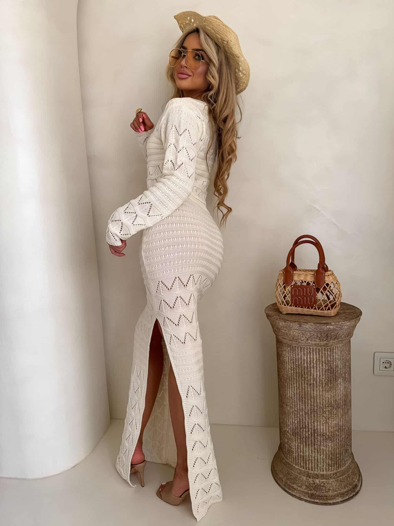 Dzianinowy komplet z ażurowym wzorem. Zestaw składa się z krótkiego swetra z długim rękawem oraz dopasowanej spódnicy maxi z wysokim stanem i efektownym rozcięciem na nodze. Kobiecy, stylowy komplet idealny na letnie stylizacje,