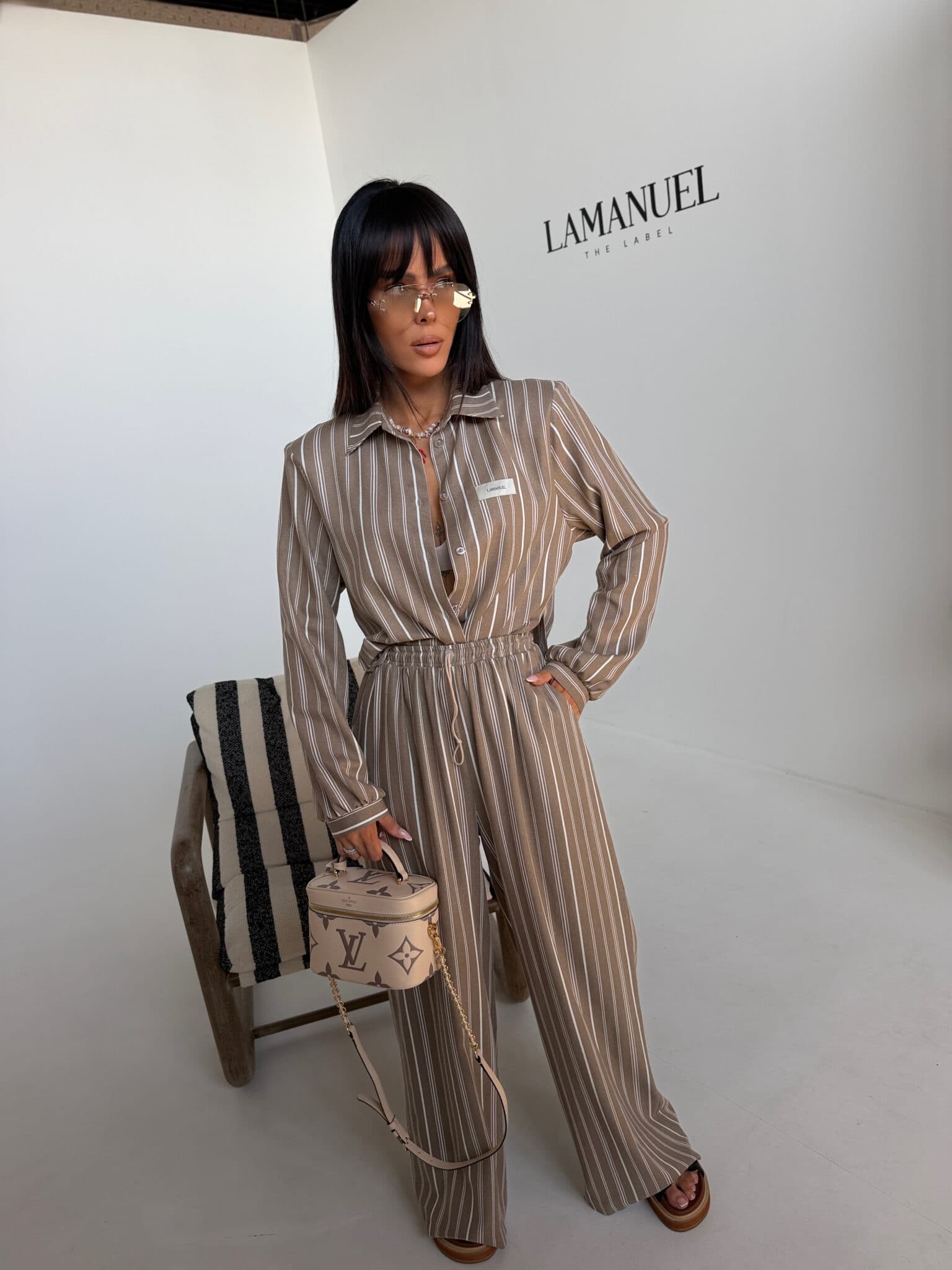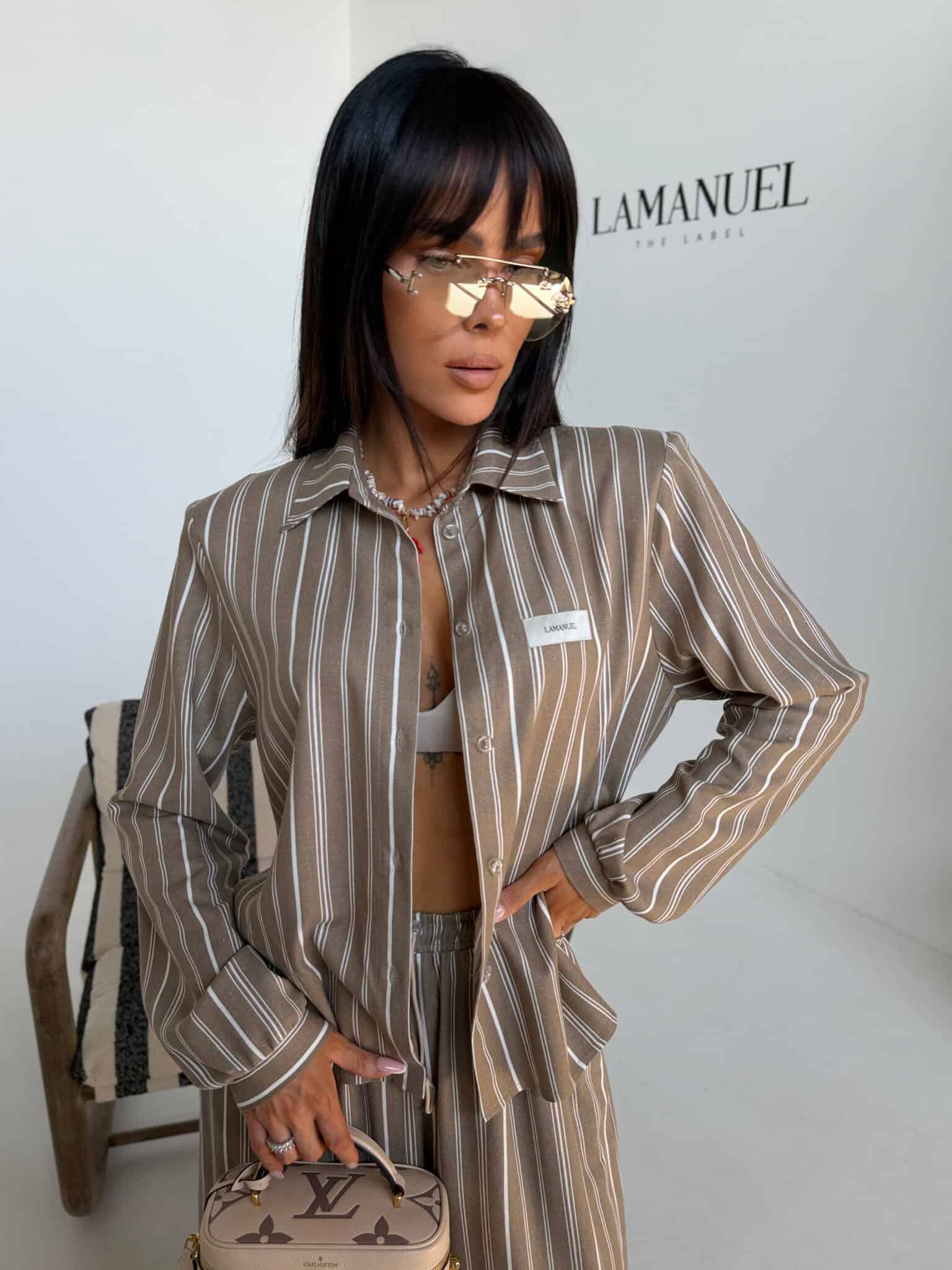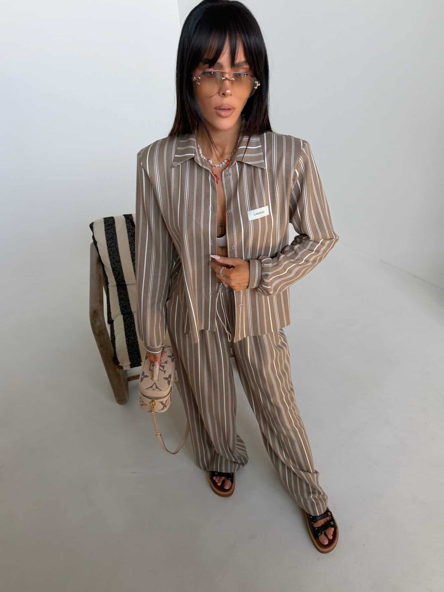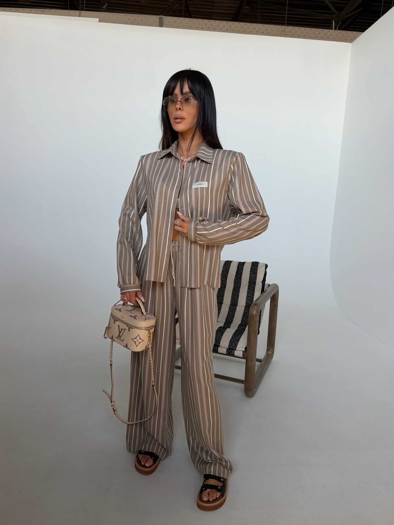 Elegancja w swobodnym wydaniu, która buduje sylwetkę już samą formą. Strukturalna góra z wyraźnie zaznaczoną linią ramion nadaje całości charakteru i pewności siebie. Koszula o dopracowanym kroju idealnie współgra ze spodniami z wysokim stanem, tworząc proporcje, które wydłużają i wysmuklają sylwetkę. Naturalna tkanina na bazie wiskozy, bawełny i lnu zapewnia lekkość oraz komfort noszenia nawet w cieplejsze dni. Subtelny wzór w pionowe pasy dodaje elegancji, a jednocześnie zachowuje nowoczesny, niewymuszony styl. Komplet, który sprawdzi się zarówno w codziennym ruchu, jak i w bardziej dopracowanych stylizacjach.Skład: 60% wiskoza 25% bawełna 15% len