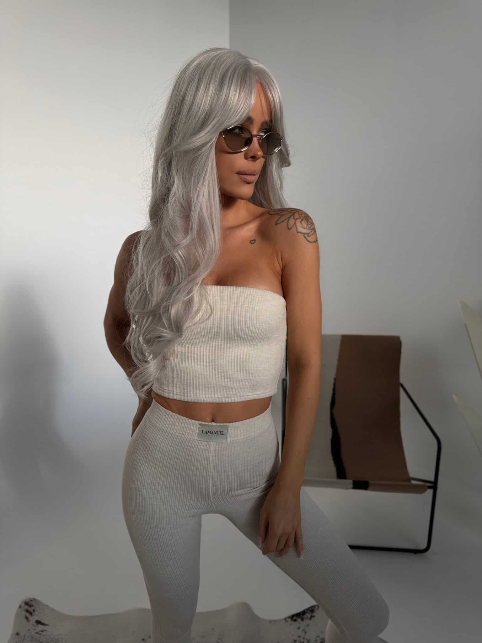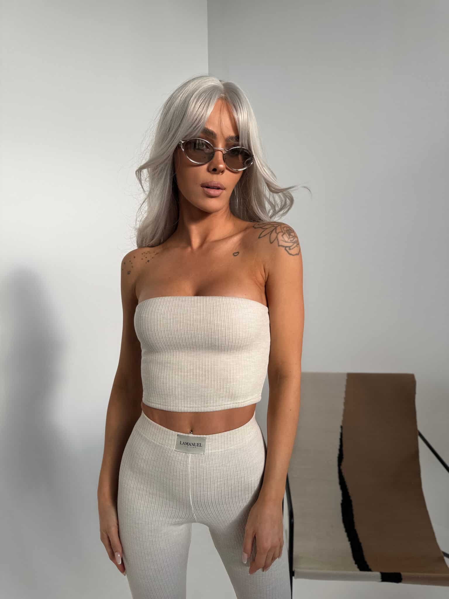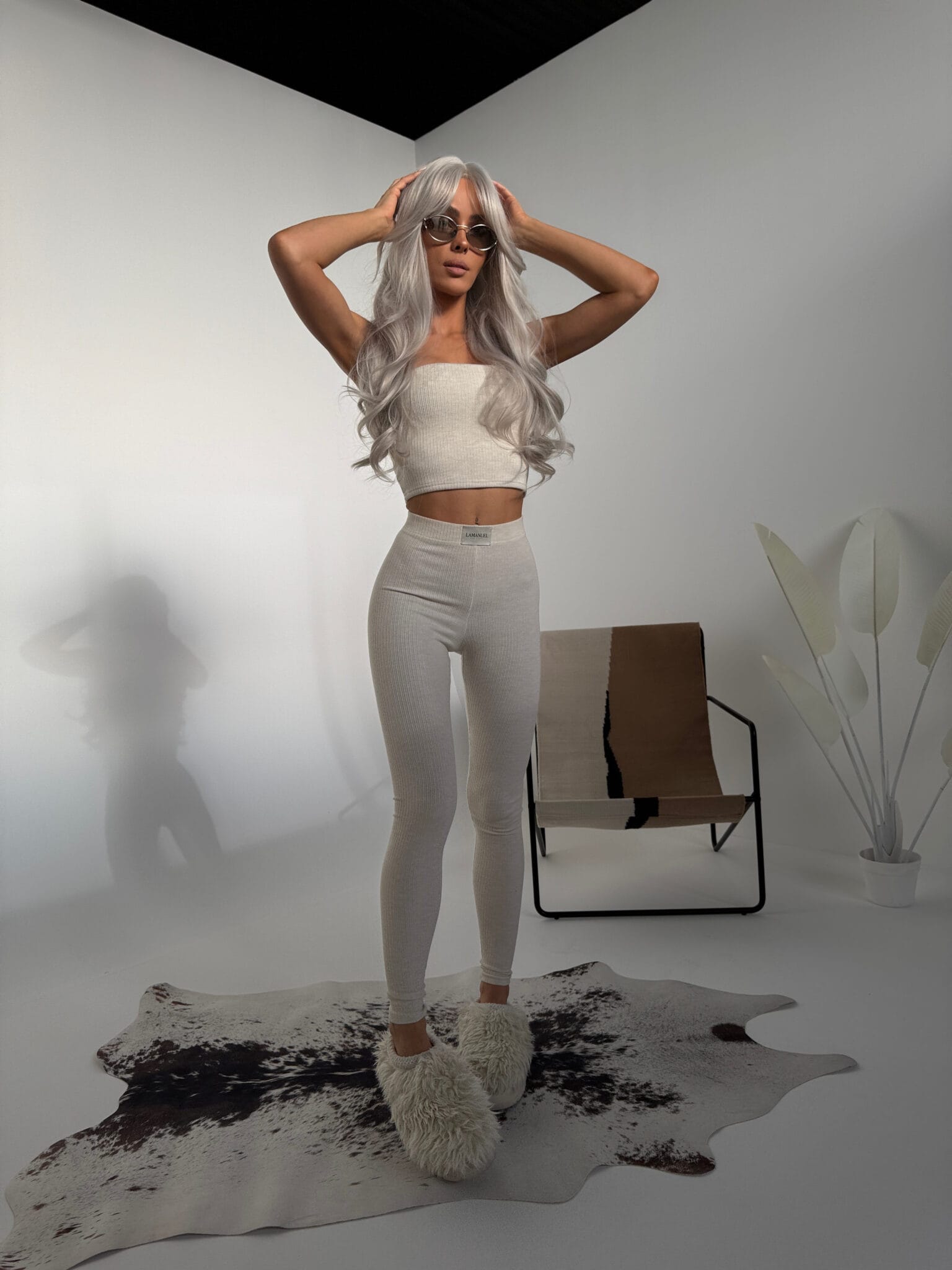 Komplet z prążkowanej dzianiny, który łączy wygodę z dopracowaną prostotą. Top bez ramiączek i legginsy z wysokim stanem tworzą zestaw, który idealnie układa się na sylwetce i sprawdza się zarówno w domu, jak i poza nim. Elastyczny materiał pracuje z ciałem, a minimalistyczne metki z logo dodają całości spójności i charakteru. Nonszalancki, ale przemyślany – dokładnie taki, jak lubimy.Skład: 75% nylon 22% wiskoza 3% spandex