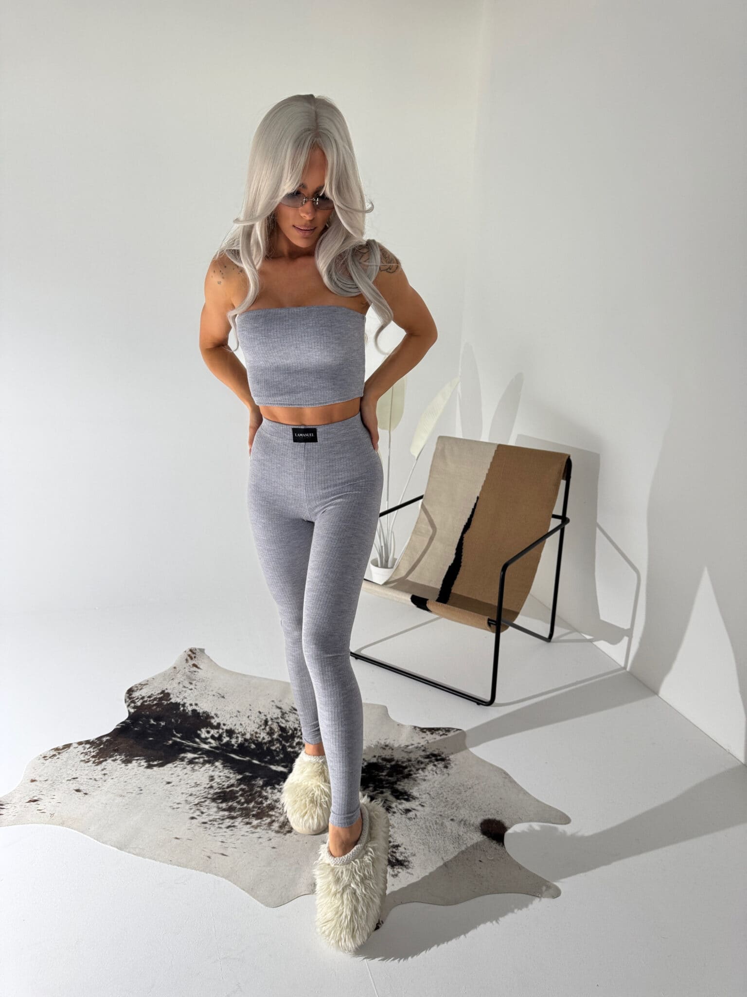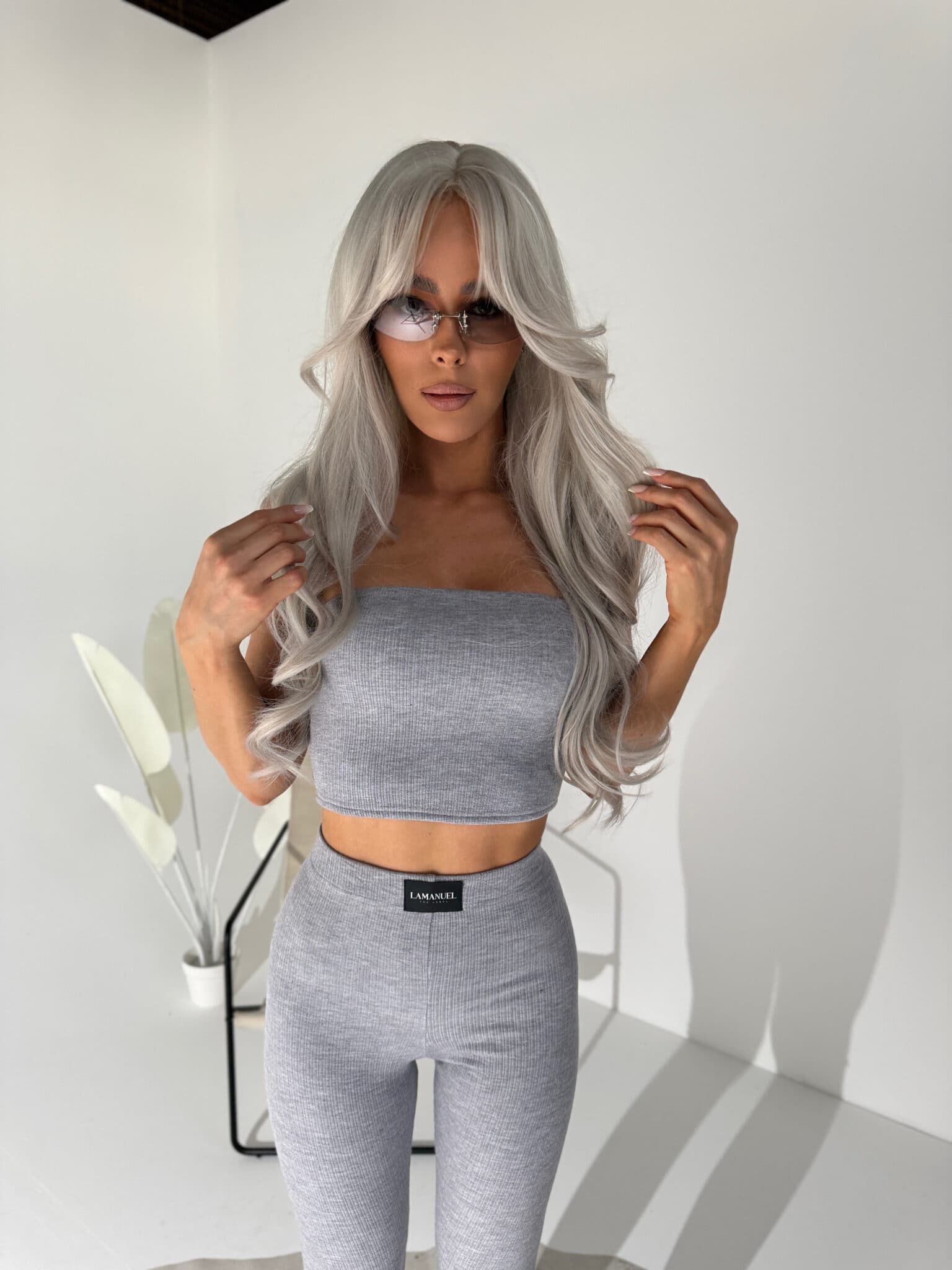 Komplet z prążkowanej dzianiny, który łączy wygodę z dopracowaną prostotą. Top bez ramiączek i legginsy z wysokim stanem tworzą zestaw, który idealnie układa się na sylwetce i sprawdza się zarówno w domu, jak i poza nim. Elastyczny materiał pracuje z ciałem, a minimalistyczne metki z logo dodają całości spójności i charakteru. Nonszalancki, ale przemyślany – dokładnie taki, jak lubimy.Skład: 75% nylon 22% wiskoza 3% spandex