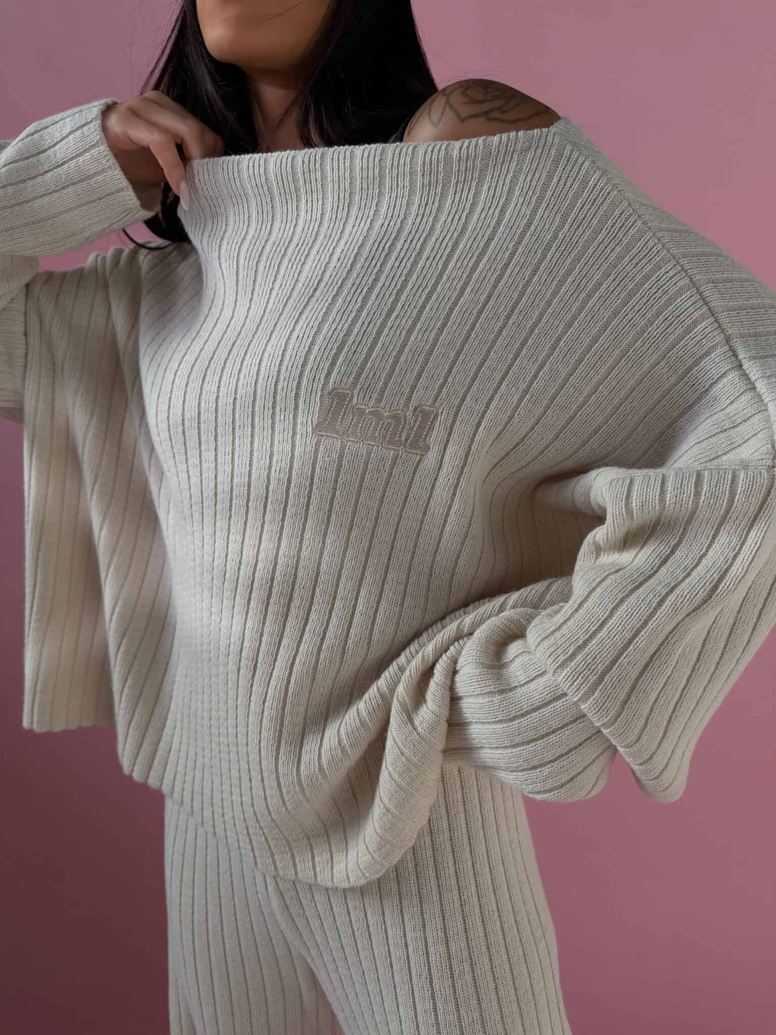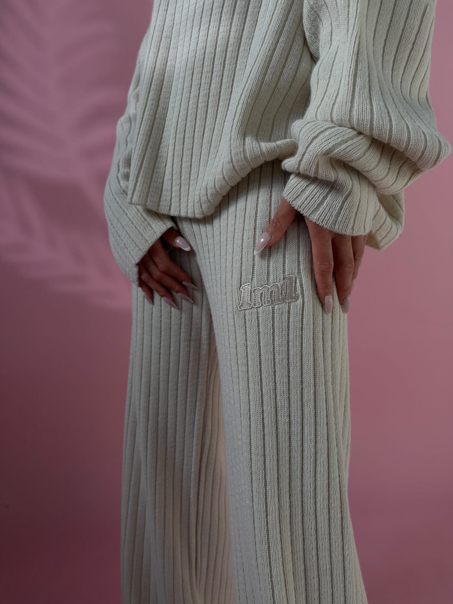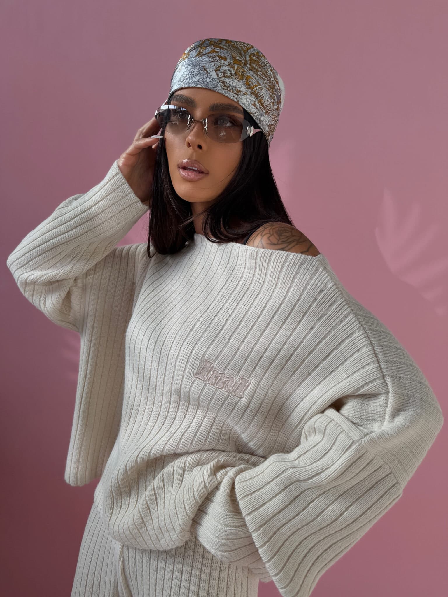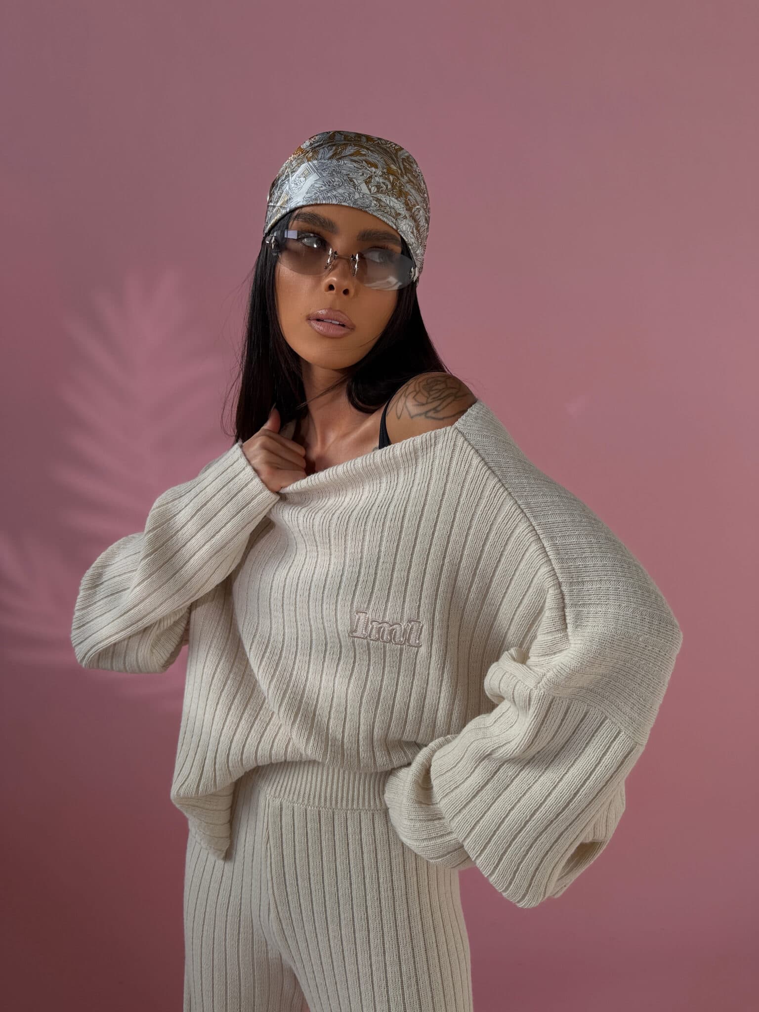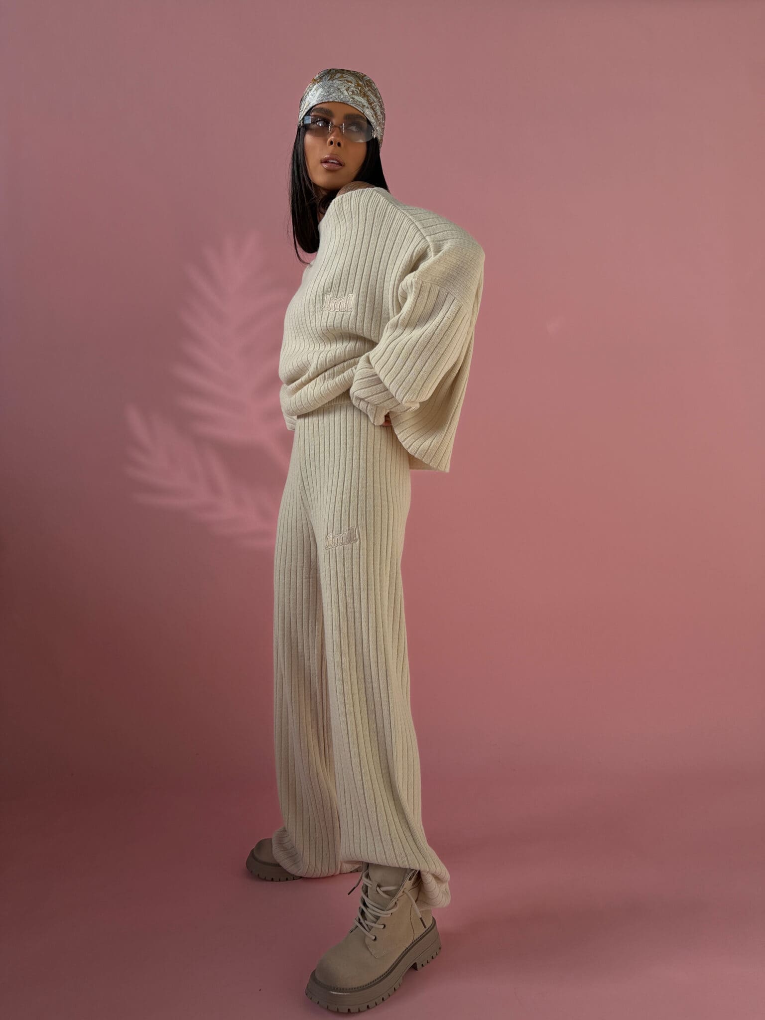 Nasz kultowy komplet wraca w nowych kolorach i z nowym haftem. Charakterystyczna prążkowana struktura pięknie buduje sylwetkę i nadaje całości wyrazistości. Dzianina jest miękka, sprężysta i otulająca, wygląda szlachetnie i trzyma formę. Sweter ma szeroką, mocną linię z obszernymi rękawami, które nadają mu modowego charakteru. Spodnie z wysokim stanem i prostą nogawką wydłużają proporcje i podkreślają talię. To model, który daje mocny, elegancki efekt bez przesady i dokładnie za to go kochacie.Skład: 85% akryl 15% nylon