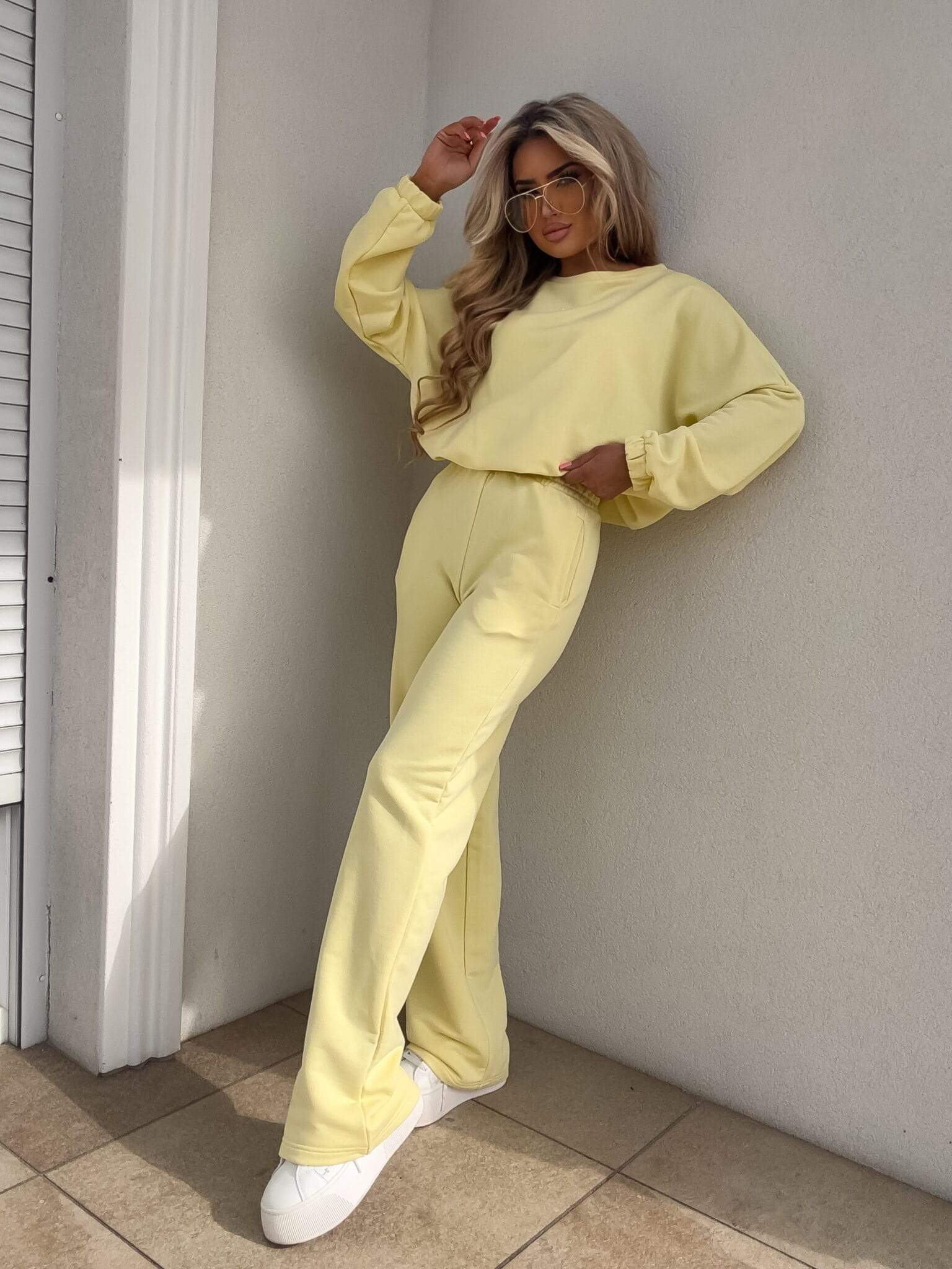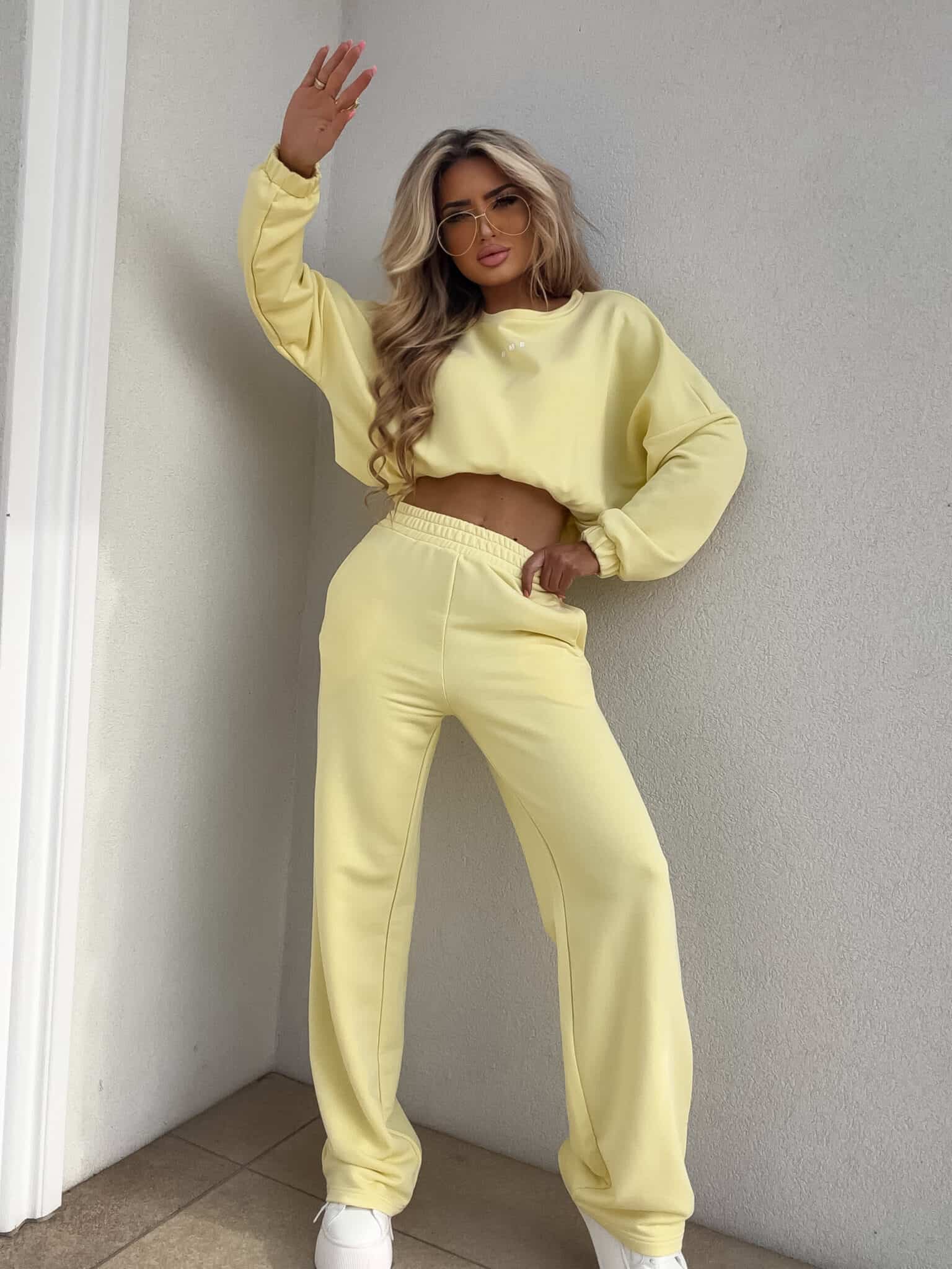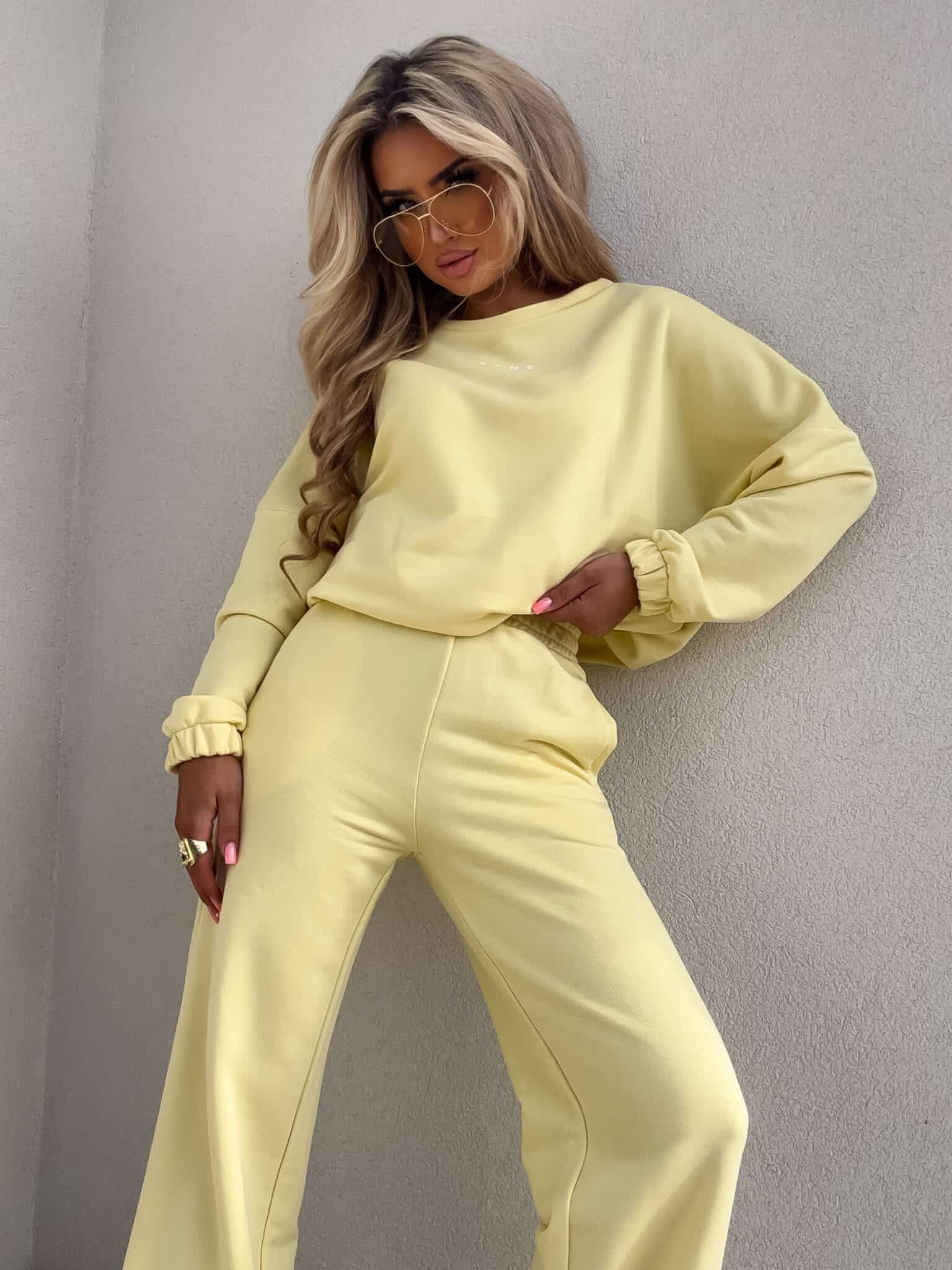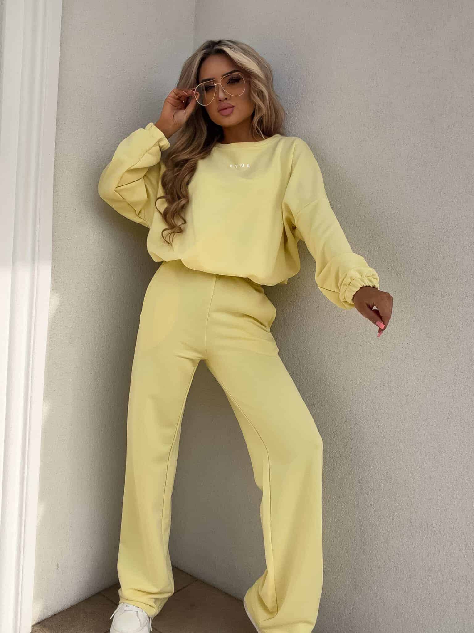 Komplet Sydney składający się z bluzy i spodni. Bluza o prostym, luźnym kroju, z długim rękawem zakończonym gumą. Szerokie spodnie z gumką w pasie