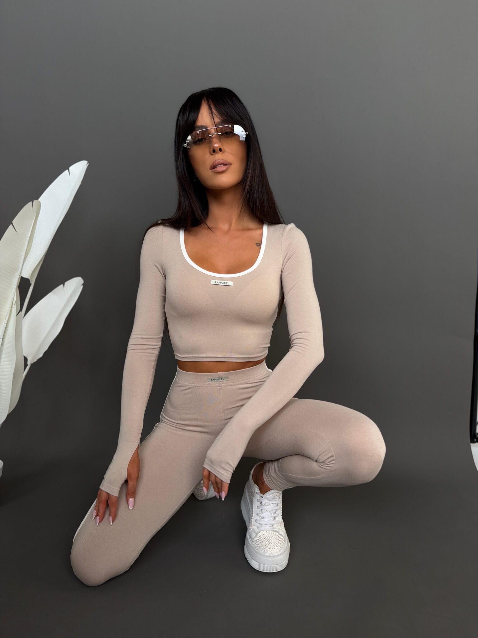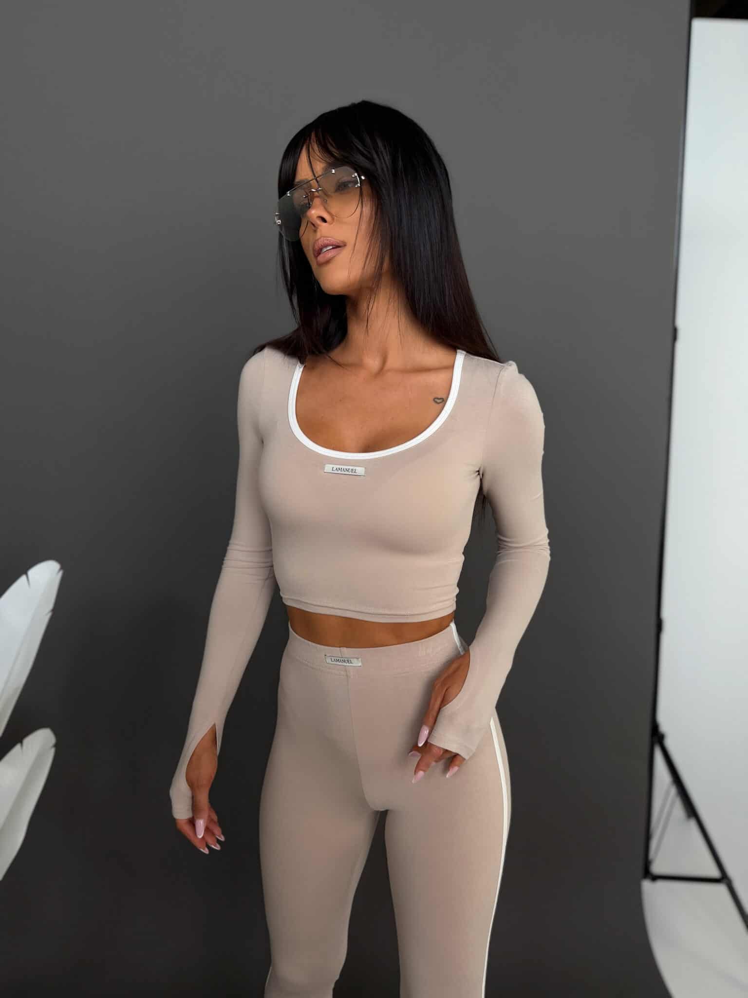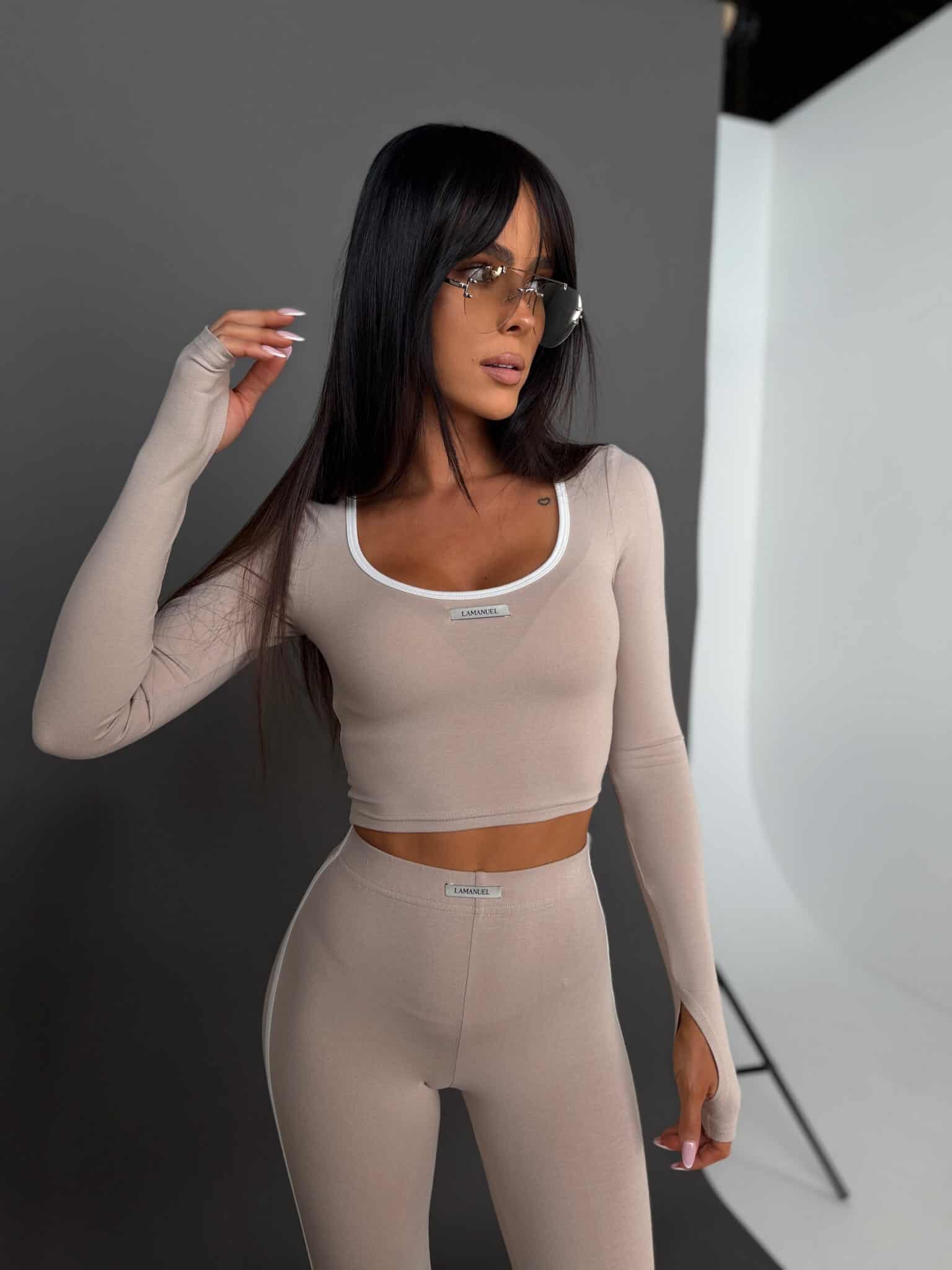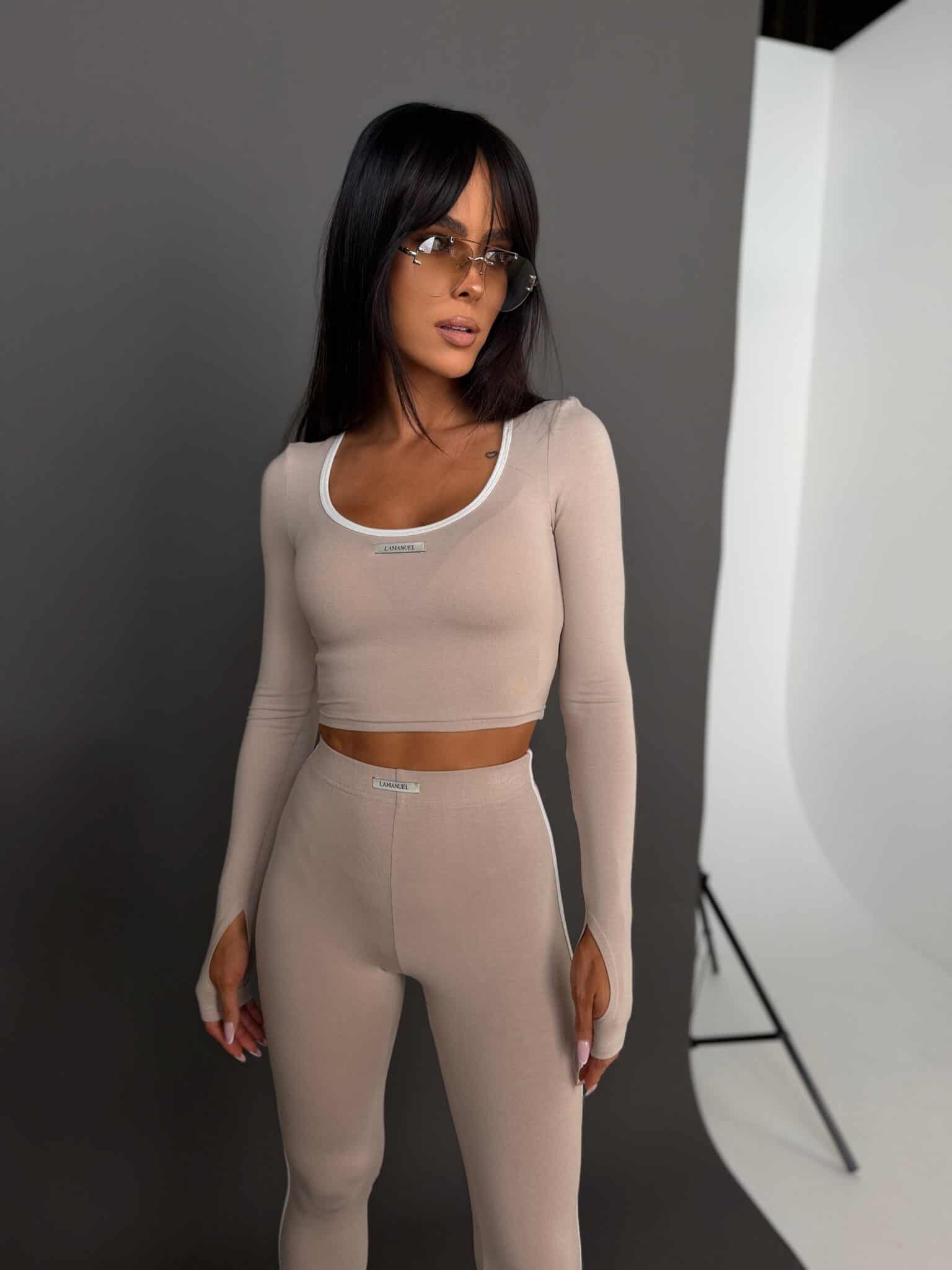 Dopasowany komplet wykonany z elastycznej, miękkiej wiskozy, która przyjemnie otula sylwetkę i zapewnia wysoki komfort noszenia. Top o skróconym kroju podkreśla talię i eksponuje linię ramion, a legginsy z wysokim stanem modelują figurę i dobrze dopasowują się do ciała. Kontrastowe lamówki nadają całości sportowej lekkości i nowoczesnego charakteru. Zestaw idealnie sprawdza się w codziennych stylizacjach, podróży oraz wygodnych miejskich outfitach.Skład: 95 % wiskoza 5% elastan