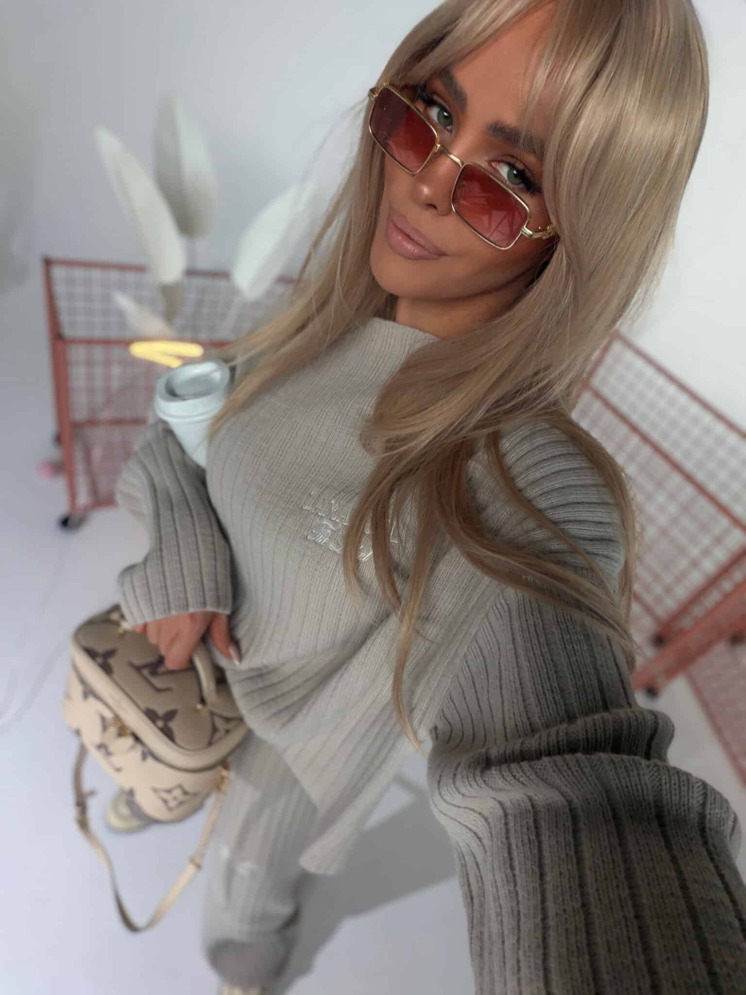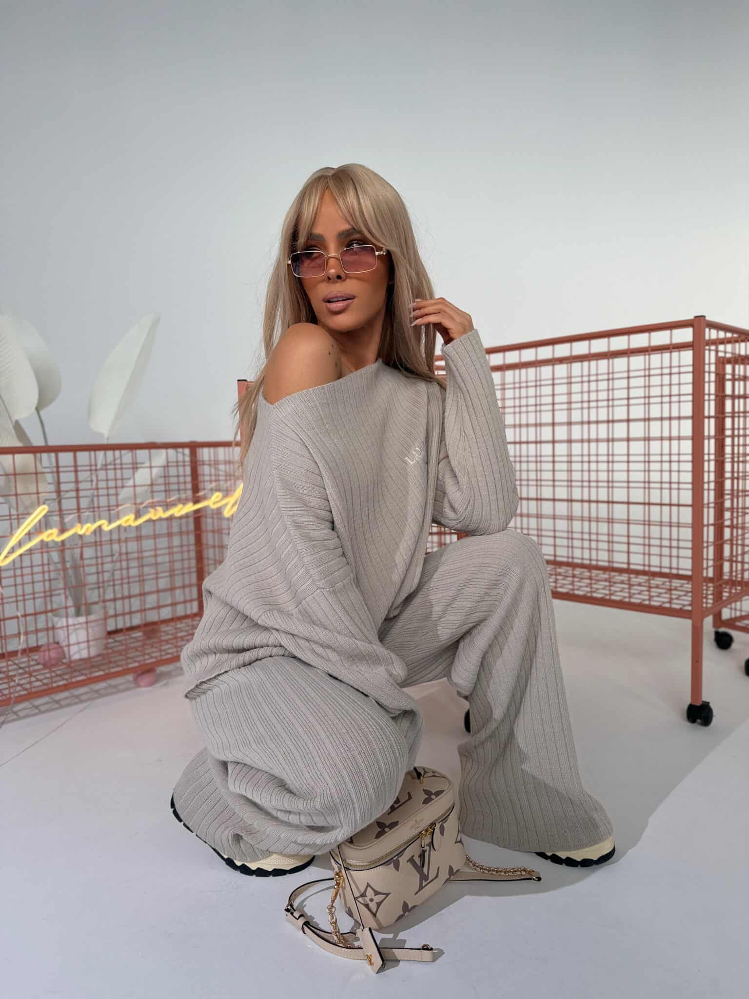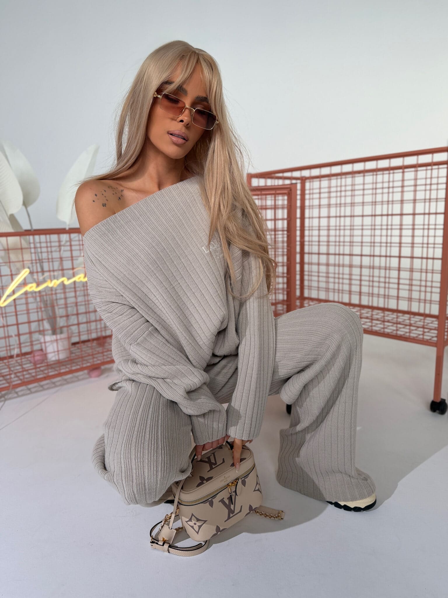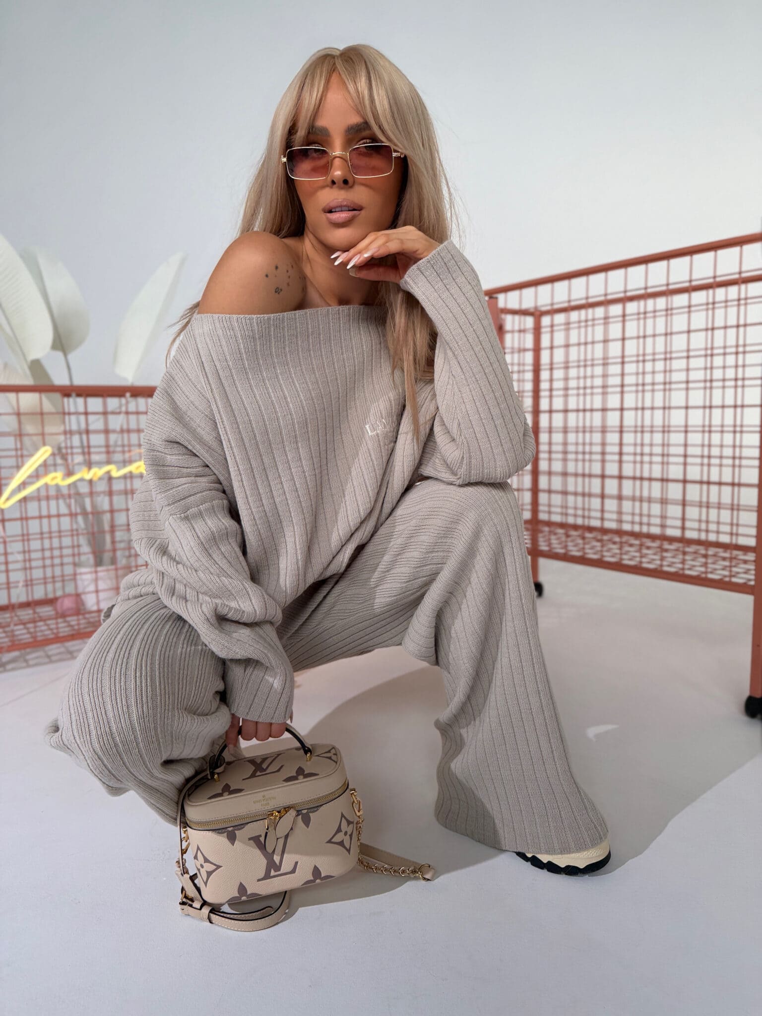 Komplet sweterkowy z dzianiny prążkowanejDzianina o wyraźnym, pionowym prążku – miękka, elastyczna, dobrze układająca się w ruchu. Góra z opuszczoną linią ramion, szerokim rękawem i lekko oversize’owym krojem. Można nosić klasycznie lub opuścić na jedno ramię. Spodnie z wysokim stanem i prostą nogawką. Pas szeroki, elastyczny – bez widocznych sznurków czy zapięć. Na piersi i biodrze haftowane logo w minimalistycznym stylu. Całość tworzy sylwetkę, ale nie opina. Miękkość dzianiny + struktura prążka = zestaw, który nie wygląda jak homewear, ale nosi się jak homewear.Skład: 85% akryl 15% nylon