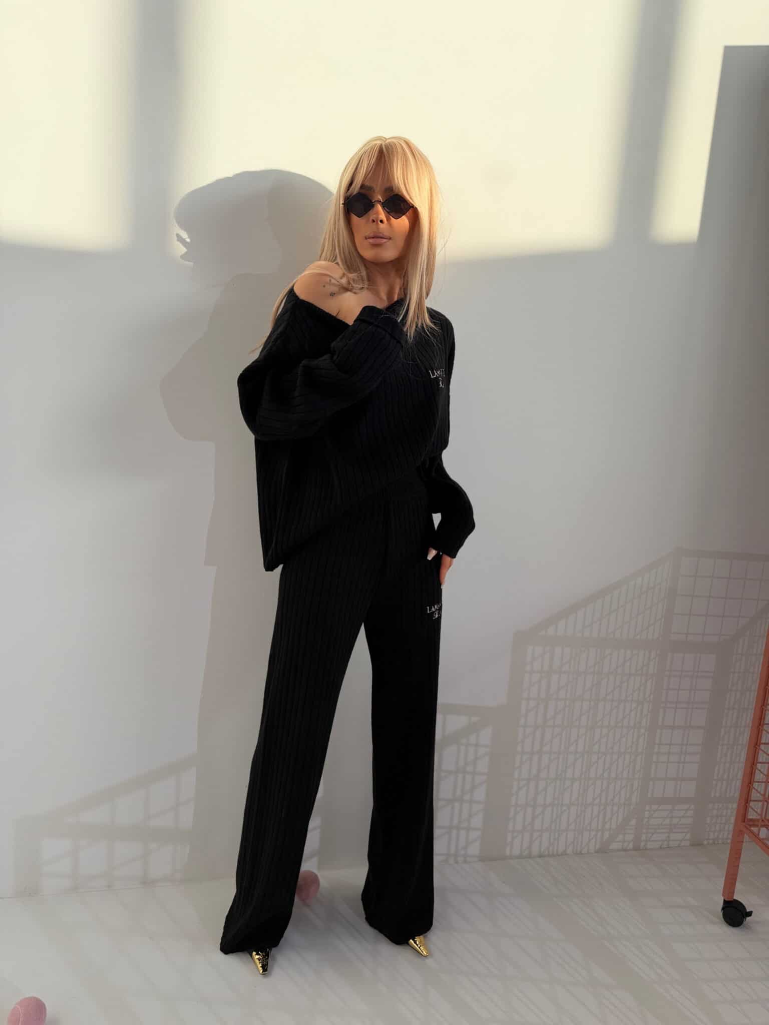 Komplet sweterkowy z dzianiny prążkowanejDzianina o wyraźnym, pionowym prążku – miękka, elastyczna, dobrze układająca się w ruchu. Góra z opuszczoną linią ramion, szerokim rękawem i lekko oversize’owym krojem. Można nosić klasycznie lub opuścić na jedno ramię. Spodnie z wysokim stanem i prostą nogawką. Pas szeroki, elastyczny – bez widocznych sznurków czy zapięć. Na piersi i biodrze haftowane logo w minimalistycznym stylu. Całość tworzy sylwetkę, ale nie opina. Miękkość dzianiny + struktura prążka = zestaw, który nie wygląda jak homewear, ale nosi się jak homewear.Skład: 85% akryl 15% nylon