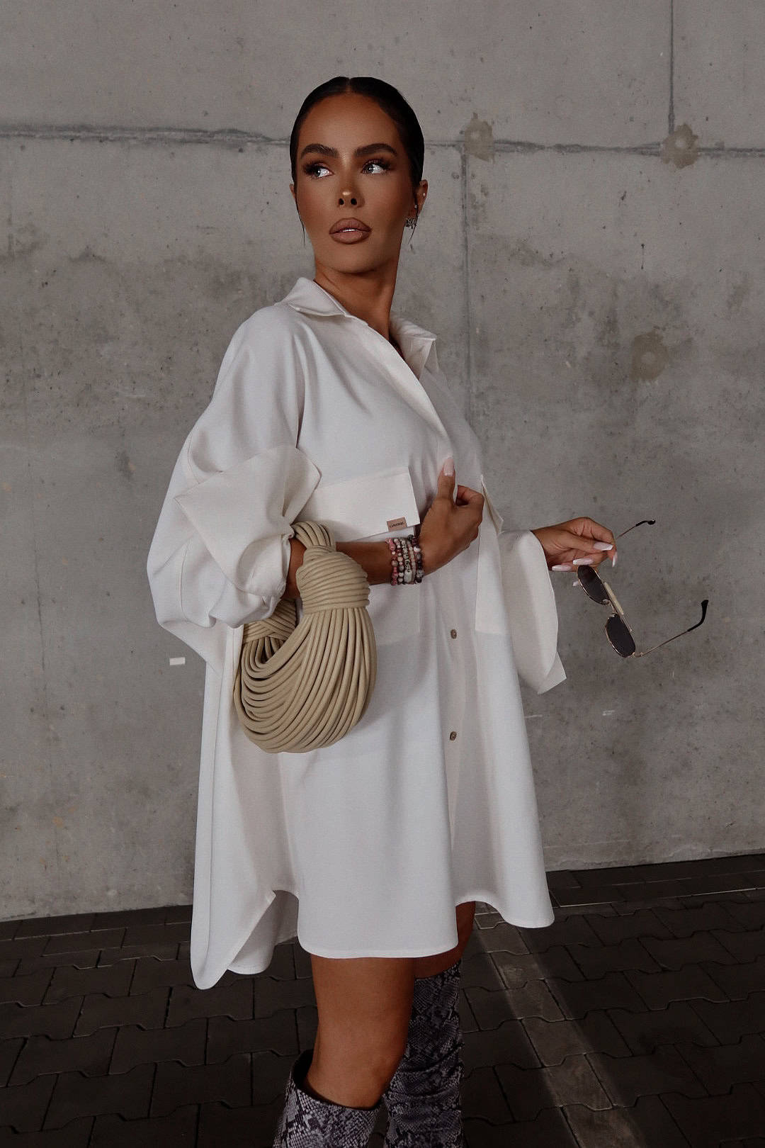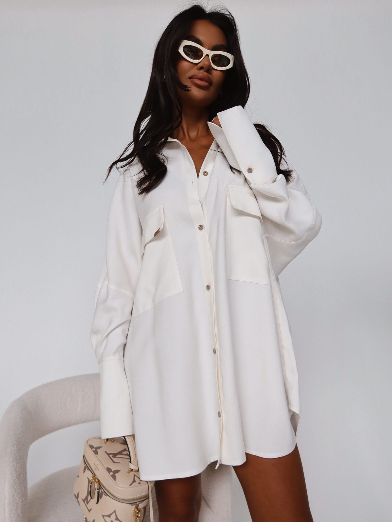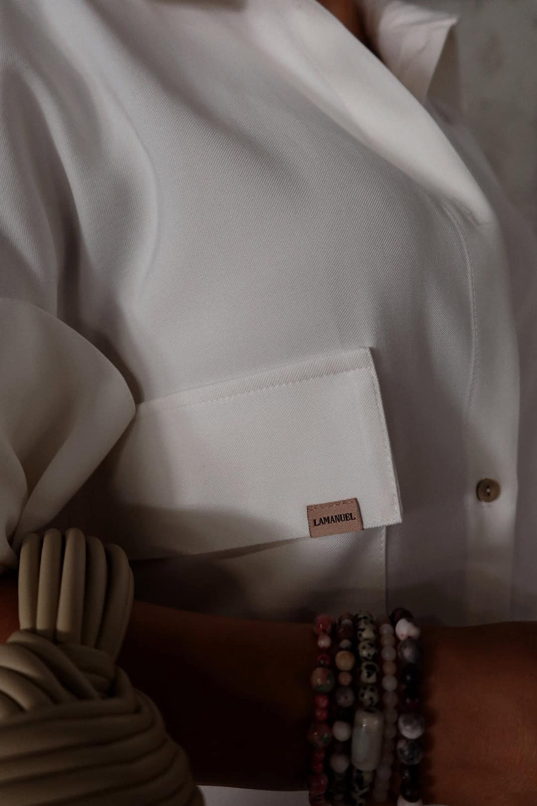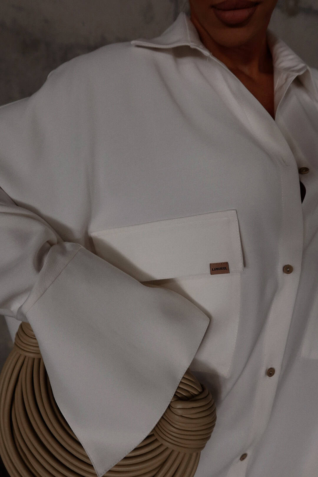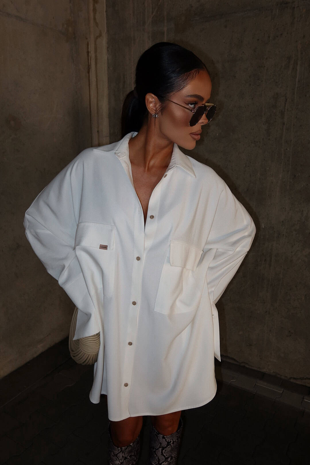 Nowoczesna, oversize’owa koszula o długości pozwalającej nosić ją również jako sukienkę. Luźny krój, obniżona linia ramion i szerokie rękawy z mankietami tworzą nonszalaną, ale bardzo stylową sylwetkę. Model zapinany na napy z przodu, z dużymi kieszeniami na biuście i minimalistyczną metką LAMANUEL. Świetnie wygląda zarówno solo, jak i narzucona na top czy dopasowane body. Idealna opcja na stylizację, która łączy luz z elegancją. Świetnie pasuje na każdą sylwetkę, nawet do rozmiaru XXL.Skład: 92% wiskoza 8% poliester