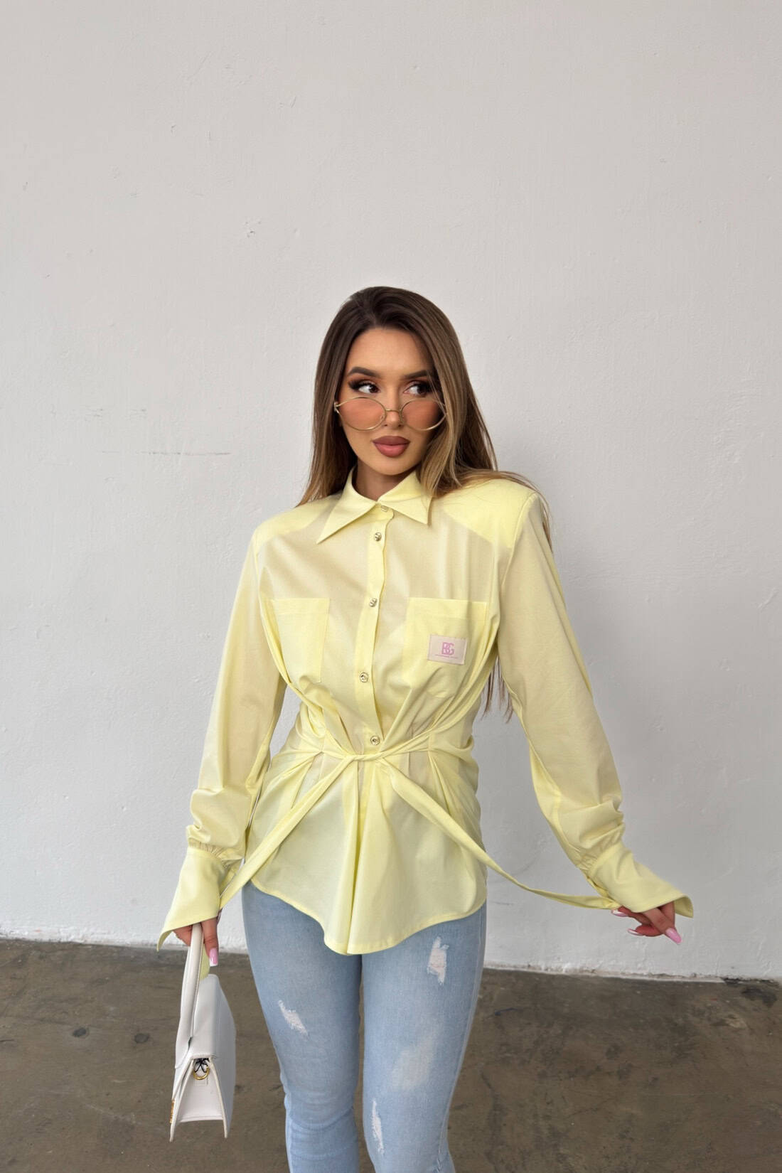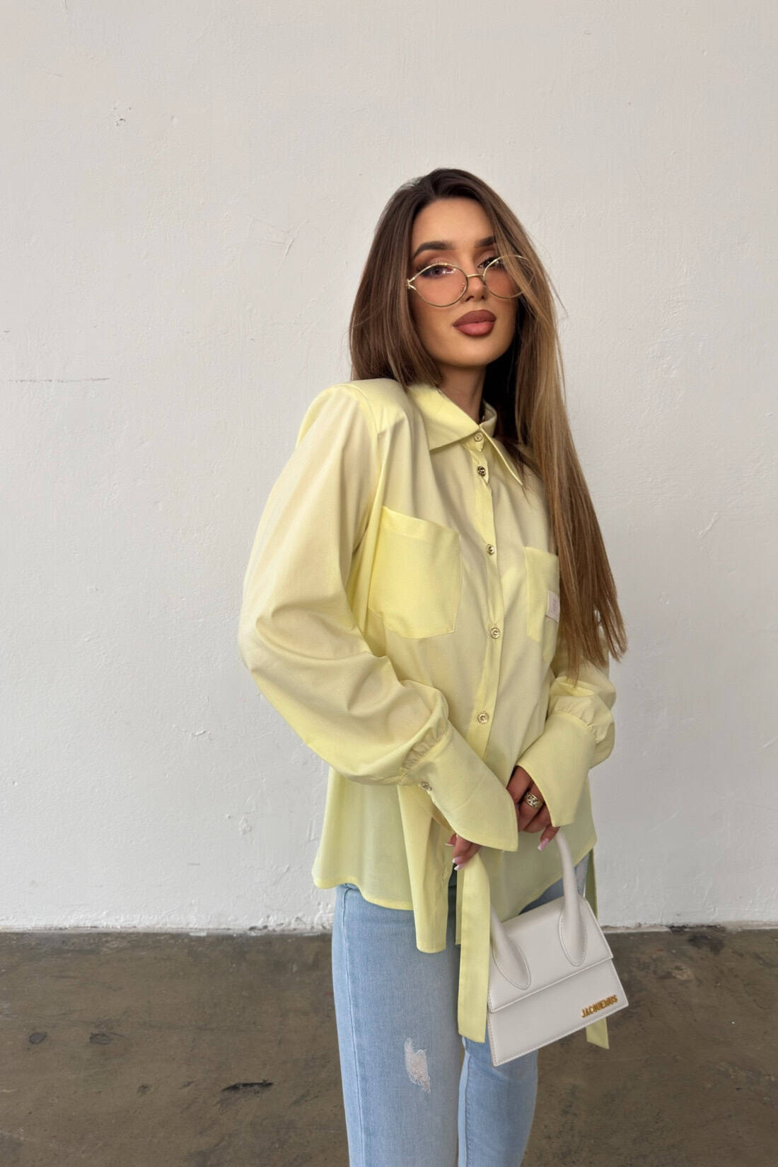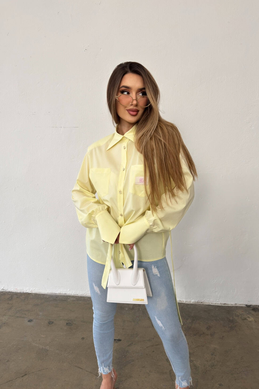 Opis produktu: Koszula gładka BG ORA. Fantastyczny model który możemy nosić na 3 sposoby, luźną, związaną z przodu oraz z tyłu. Koszula posiada efektowne mankiety, przezroczyste guziki ze złotą obramówką oraz poduszki w ramionach, które podkreślą Twoją sylwetkę. Noś do szpilek lub do sportowego obuwia!