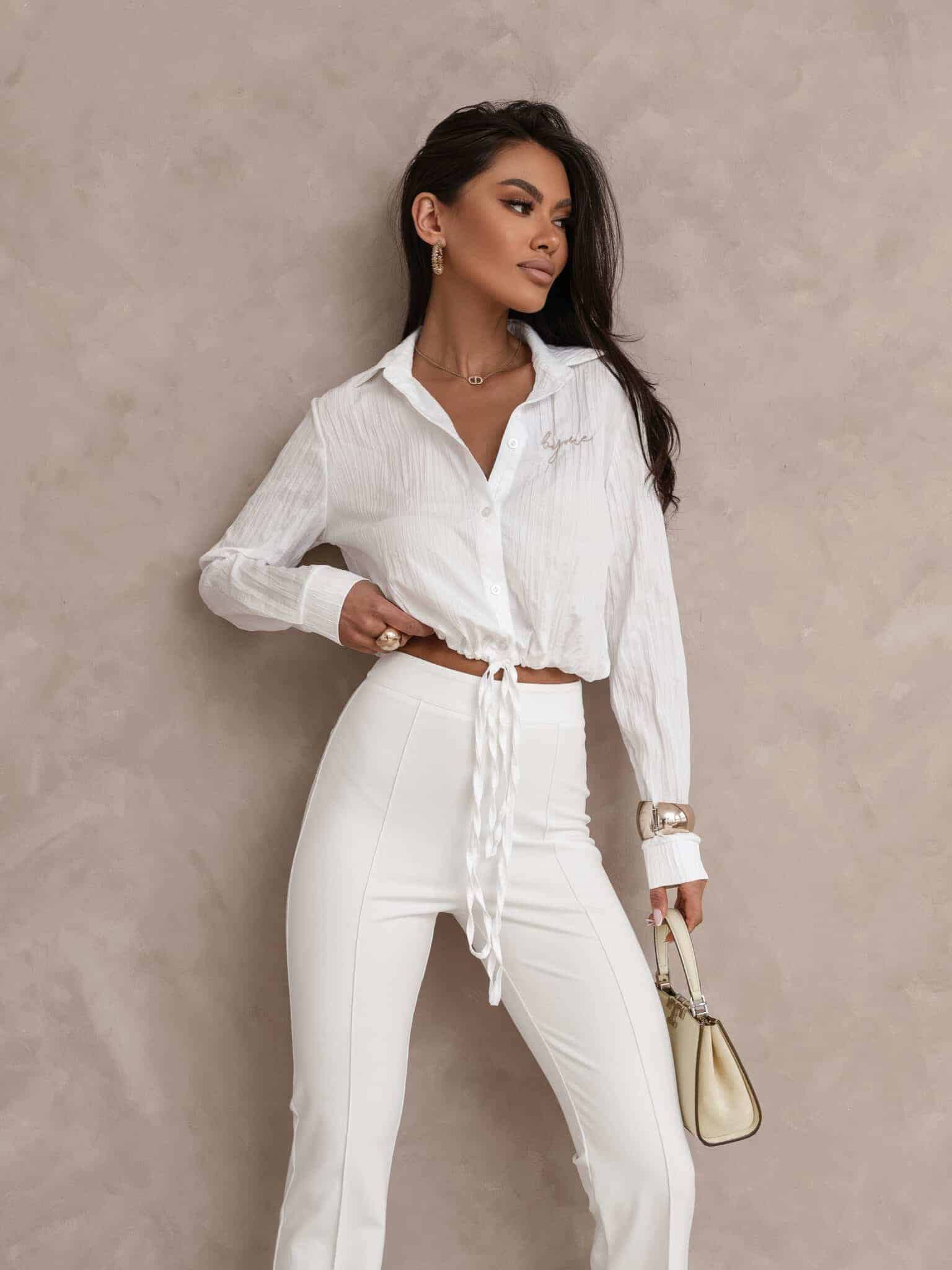 Koszula o krótkim kroju, zapinana na guziki. Wyposażona w troczki, które umożliwiają wiązanie jej na różne sposoby, pozwalając dopasować styl do okazji i sylwetki.