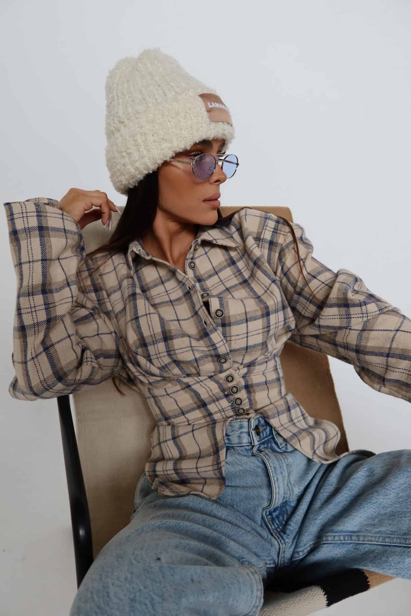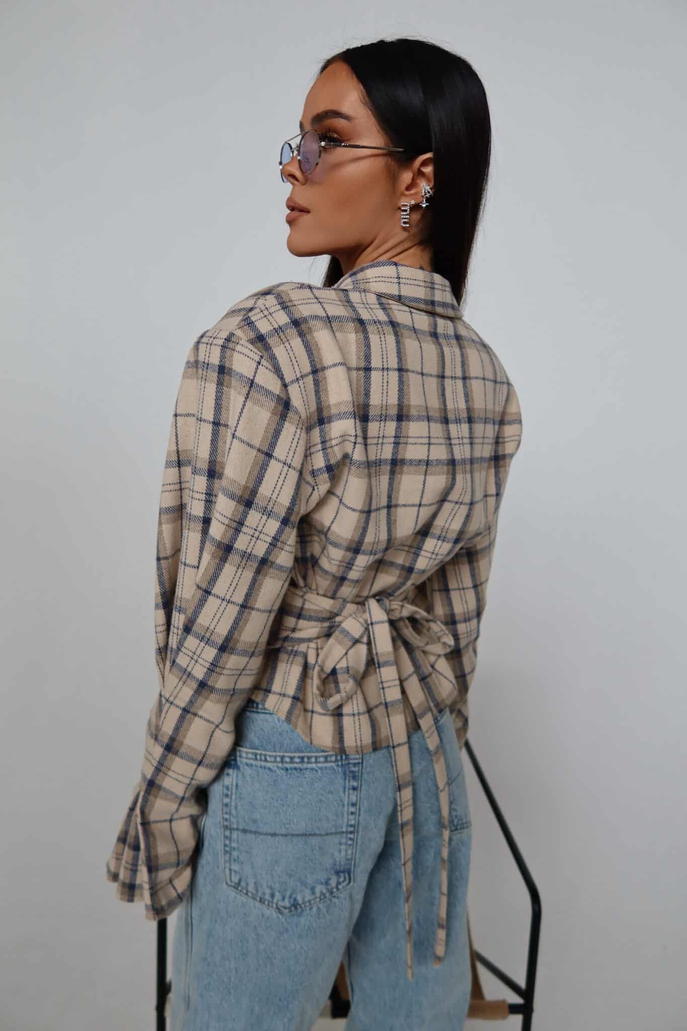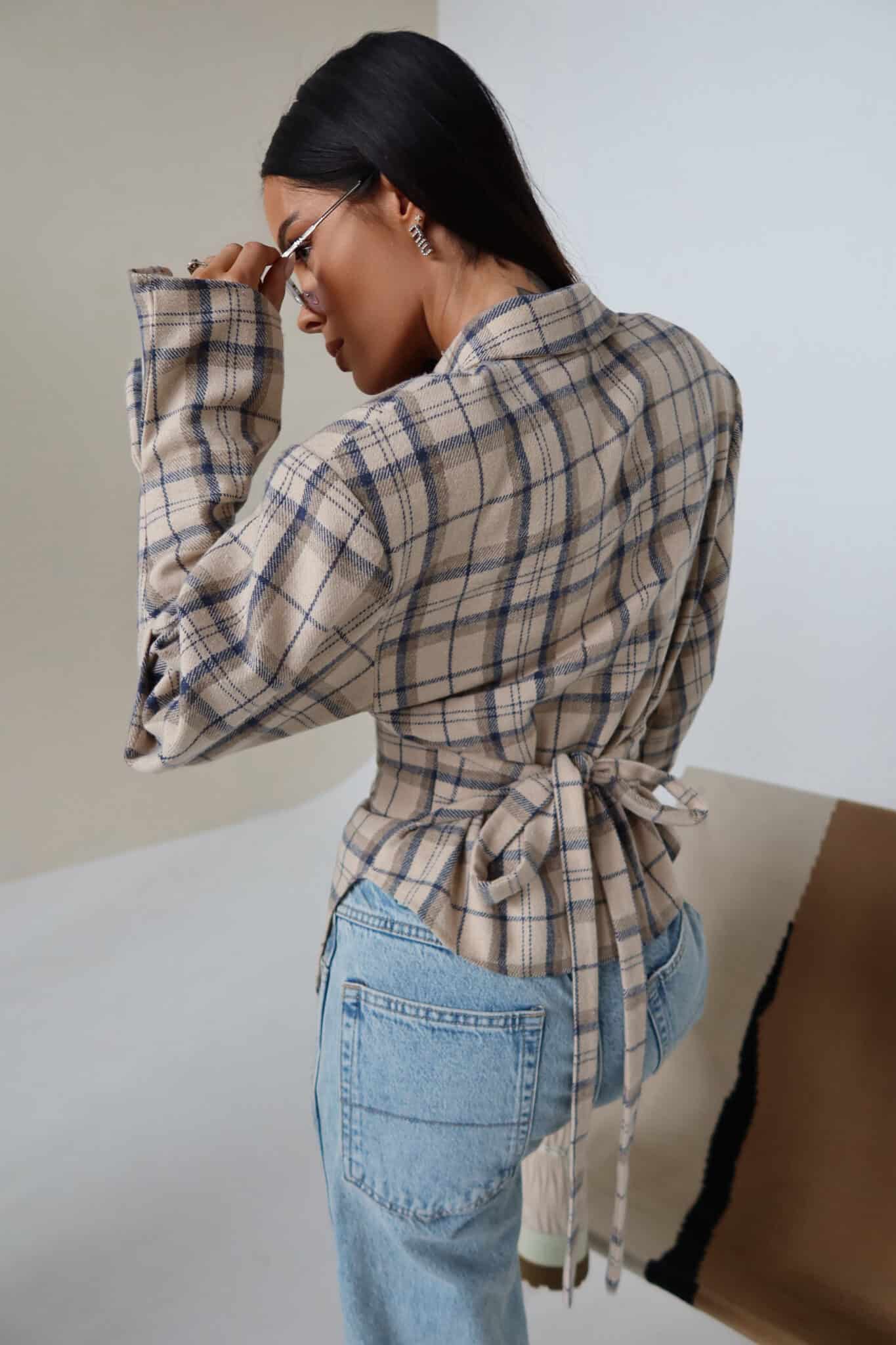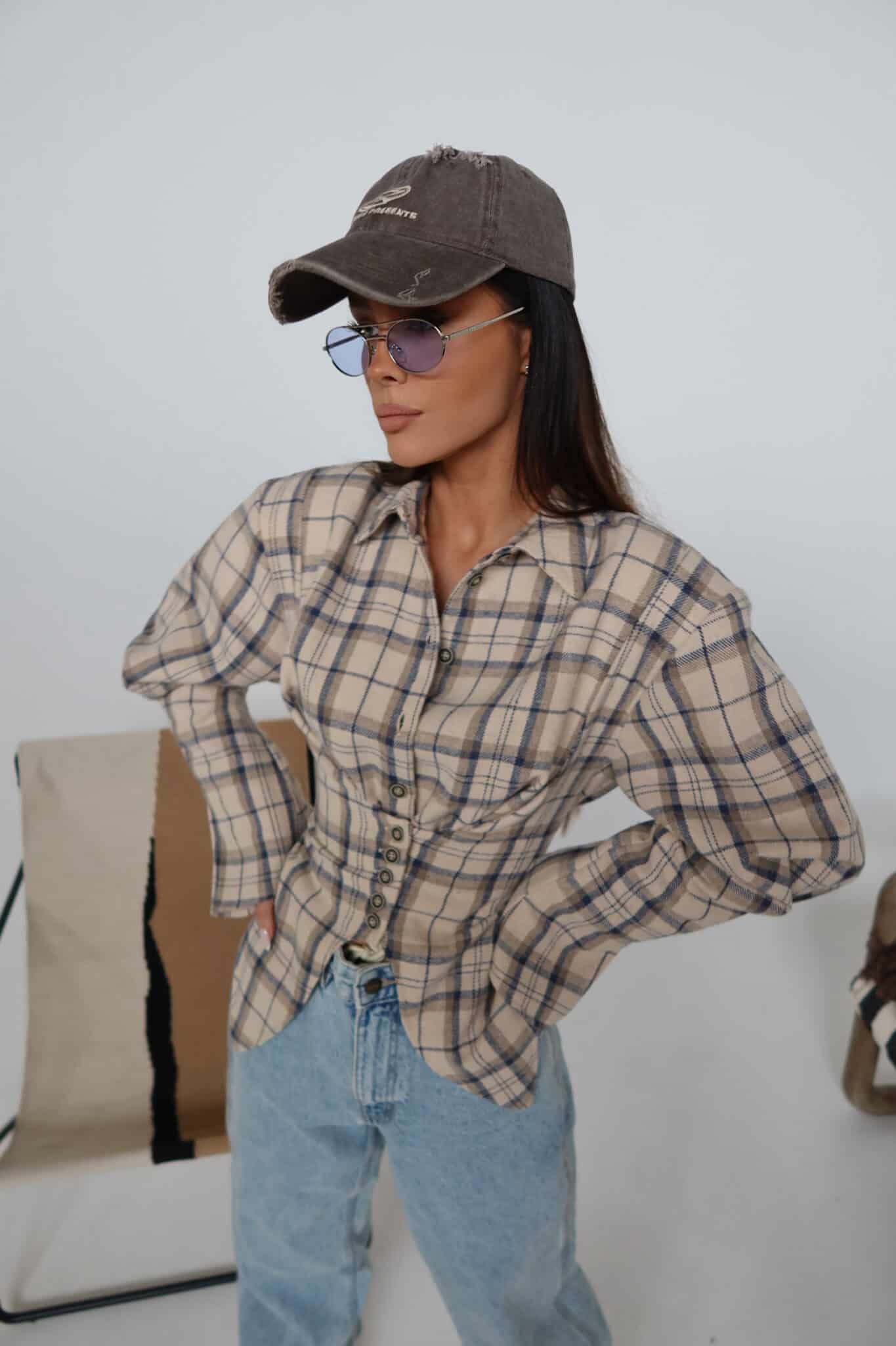 Koszula z wyraźnie zaznaczoną talią o kroju przypominającym gorset. Konstrukcja z poduszkami w ramionach podkreśla sylwetkę, a dopasowany dół pięknie ją modeluje. Z przodu klasyczne zapięcie na guziki, z tyłu wiązanie umożliwiające regulację dopasowania. Uszyta z miękkiej tkaniny w kratę – połączenie klasyki z nowoczesną formą.Skład: 50% bawełna 50% poliester