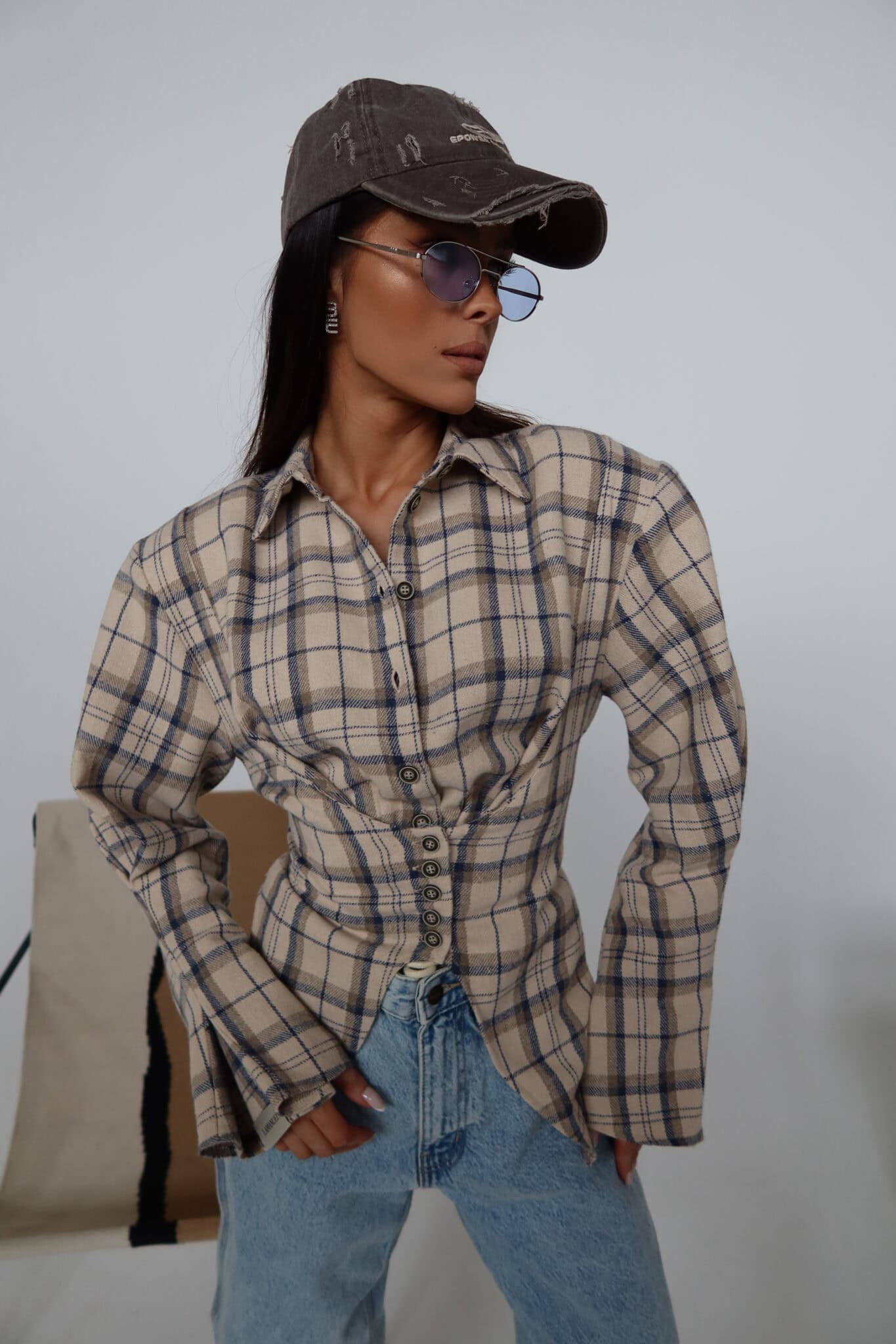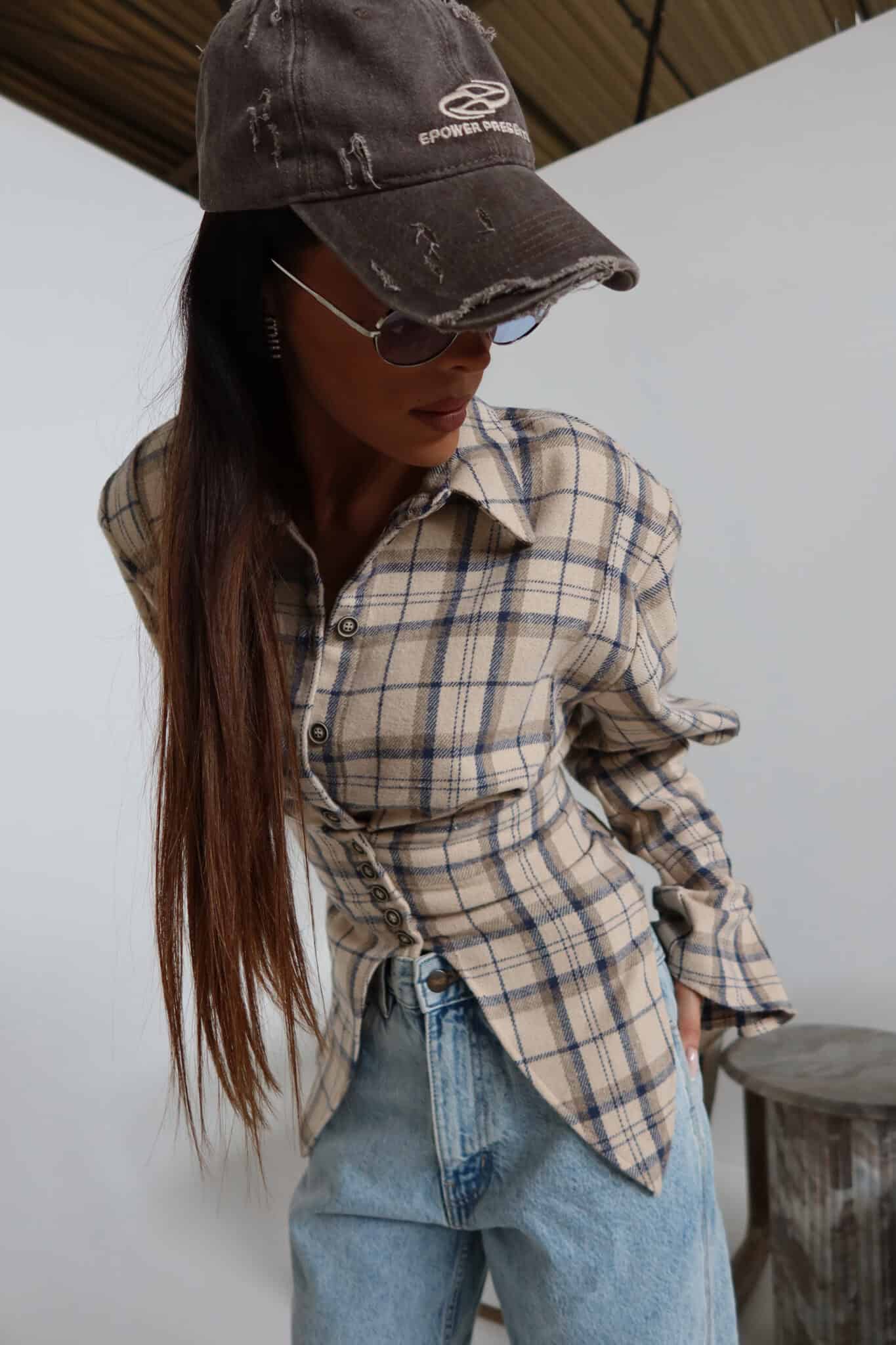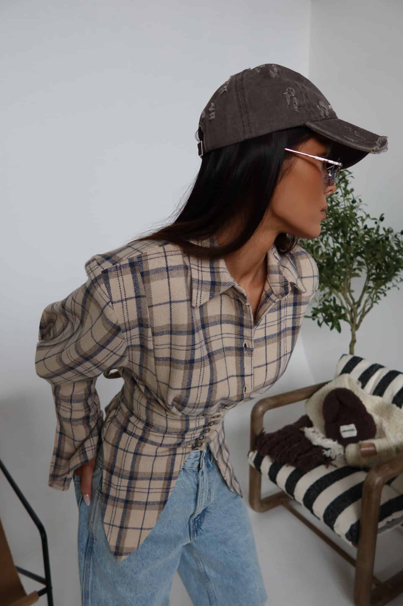 Koszula z wyraźnie zaznaczoną talią o kroju przypominającym gorset. Konstrukcja z poduszkami w ramionach podkreśla sylwetkę, a dopasowany dół pięknie ją modeluje. Z przodu klasyczne zapięcie na guziki, z tyłu wiązanie umożliwiające regulację dopasowania. Uszyta z miękkiej tkaniny w kratę – połączenie klasyki z nowoczesną formą.Skład: 50% bawełna 50% poliester