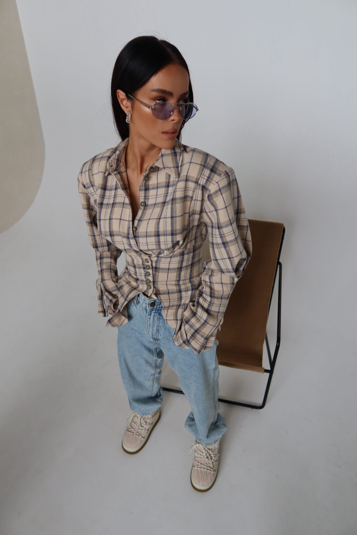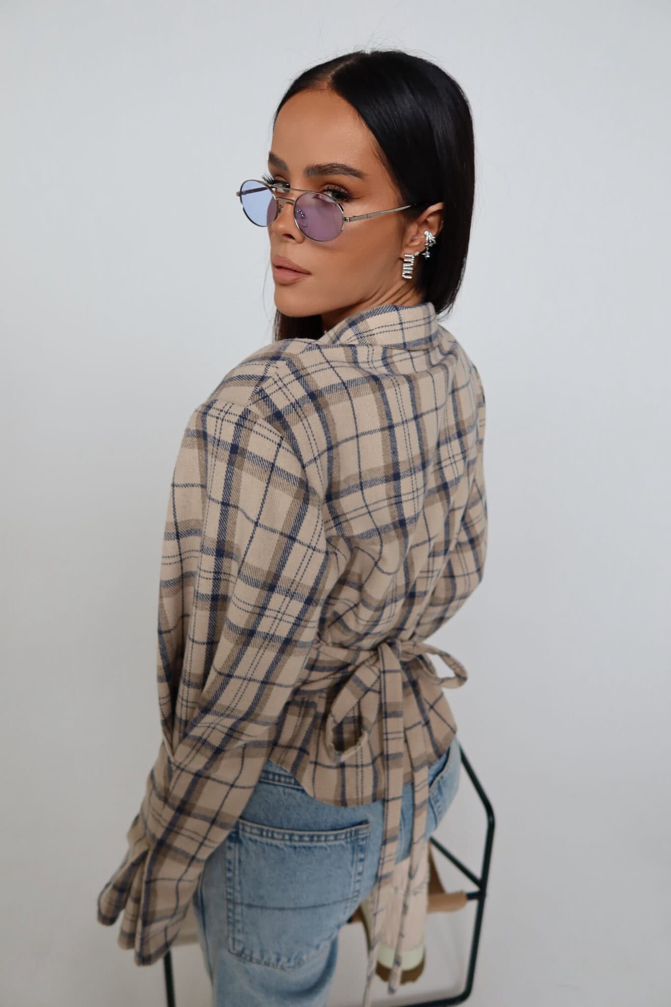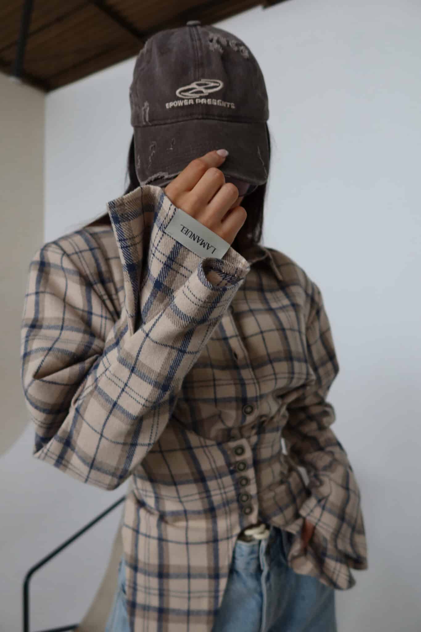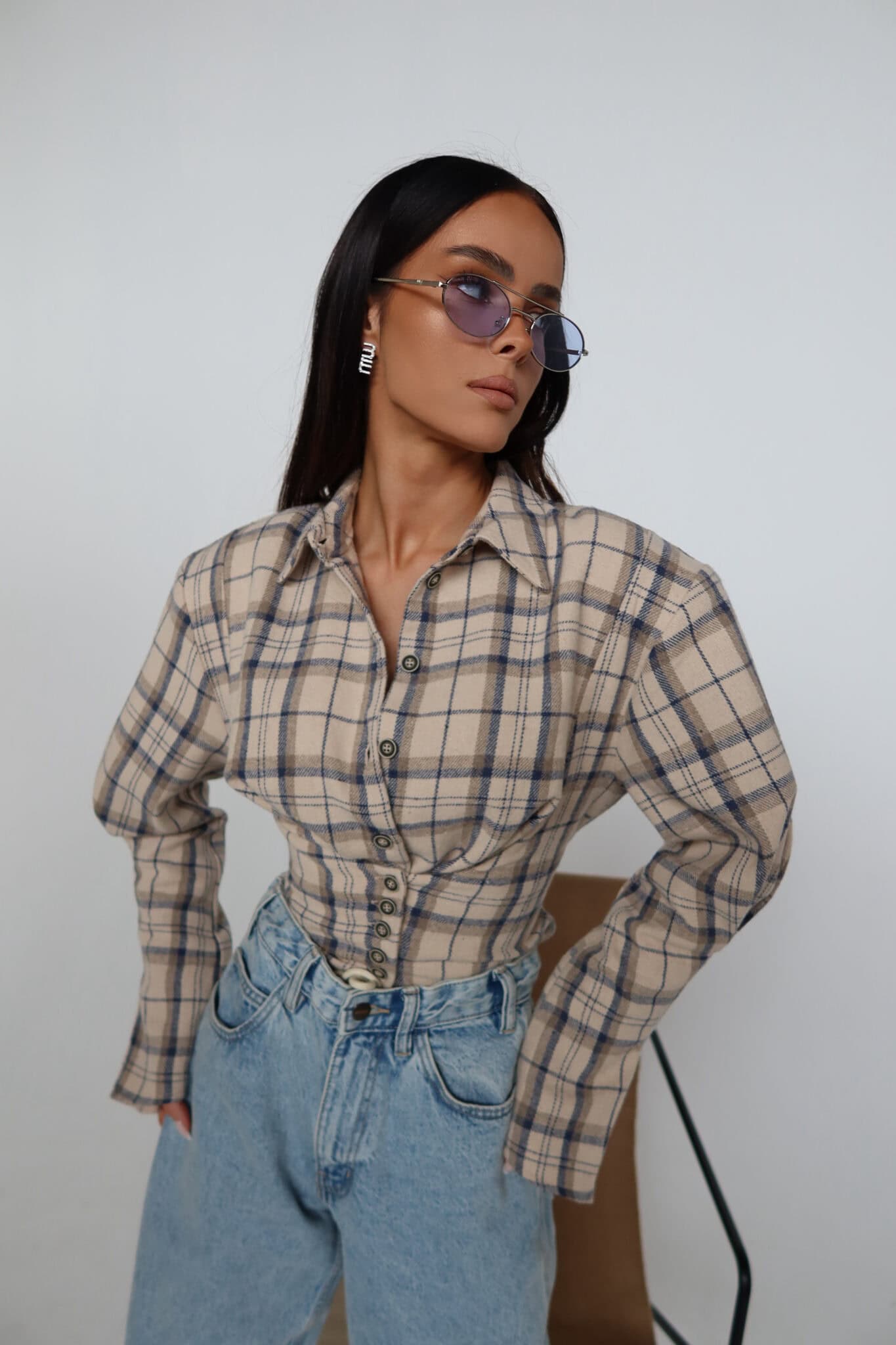 Koszula z wyraźnie zaznaczoną talią o kroju przypominającym gorset. Konstrukcja z poduszkami w ramionach podkreśla sylwetkę, a dopasowany dół pięknie ją modeluje. Z przodu klasyczne zapięcie na guziki, z tyłu wiązanie umożliwiające regulację dopasowania. Uszyta z miękkiej tkaniny w kratę – połączenie klasyki z nowoczesną formą.Skład: 50% bawełna 50% poliester