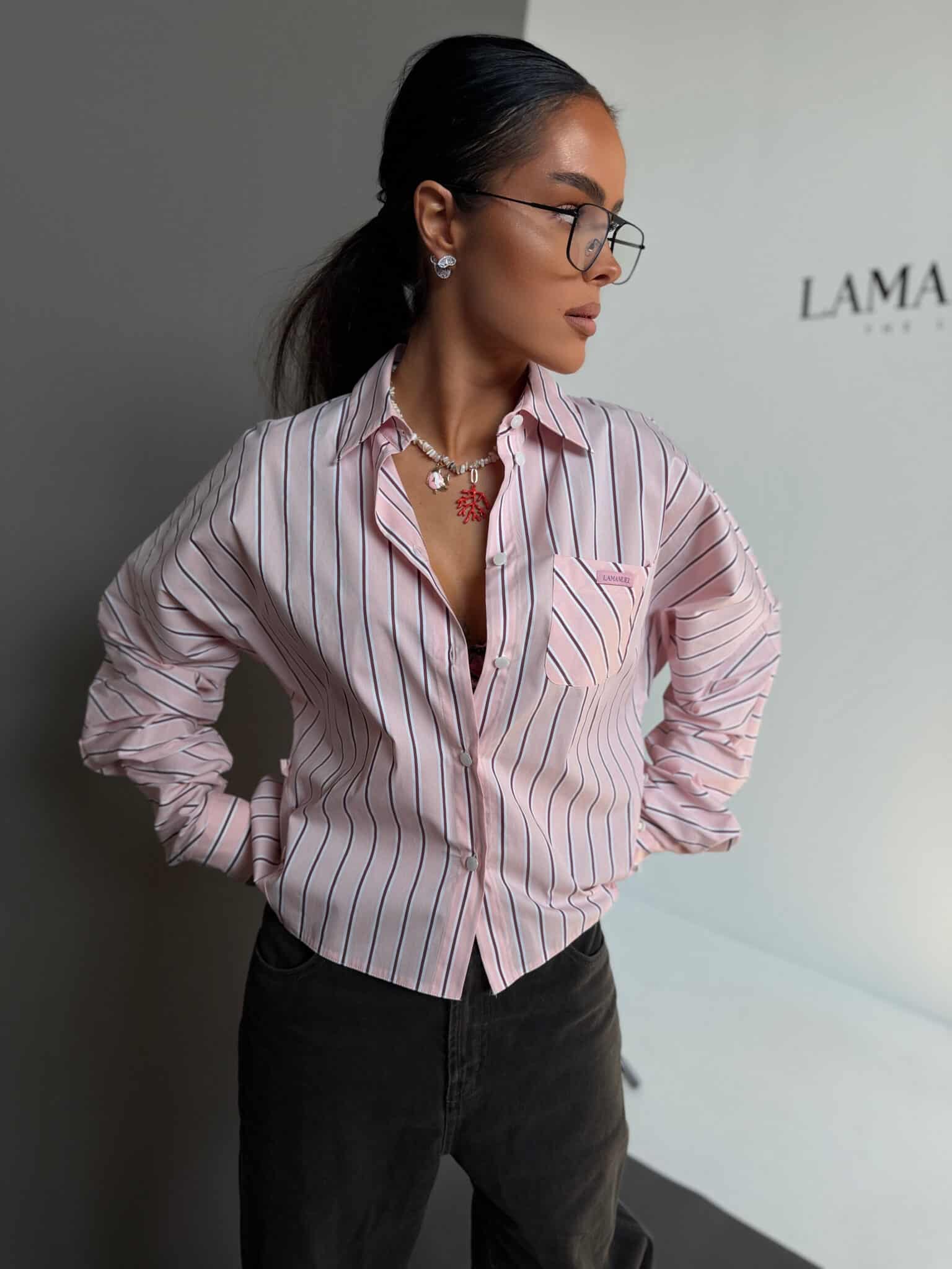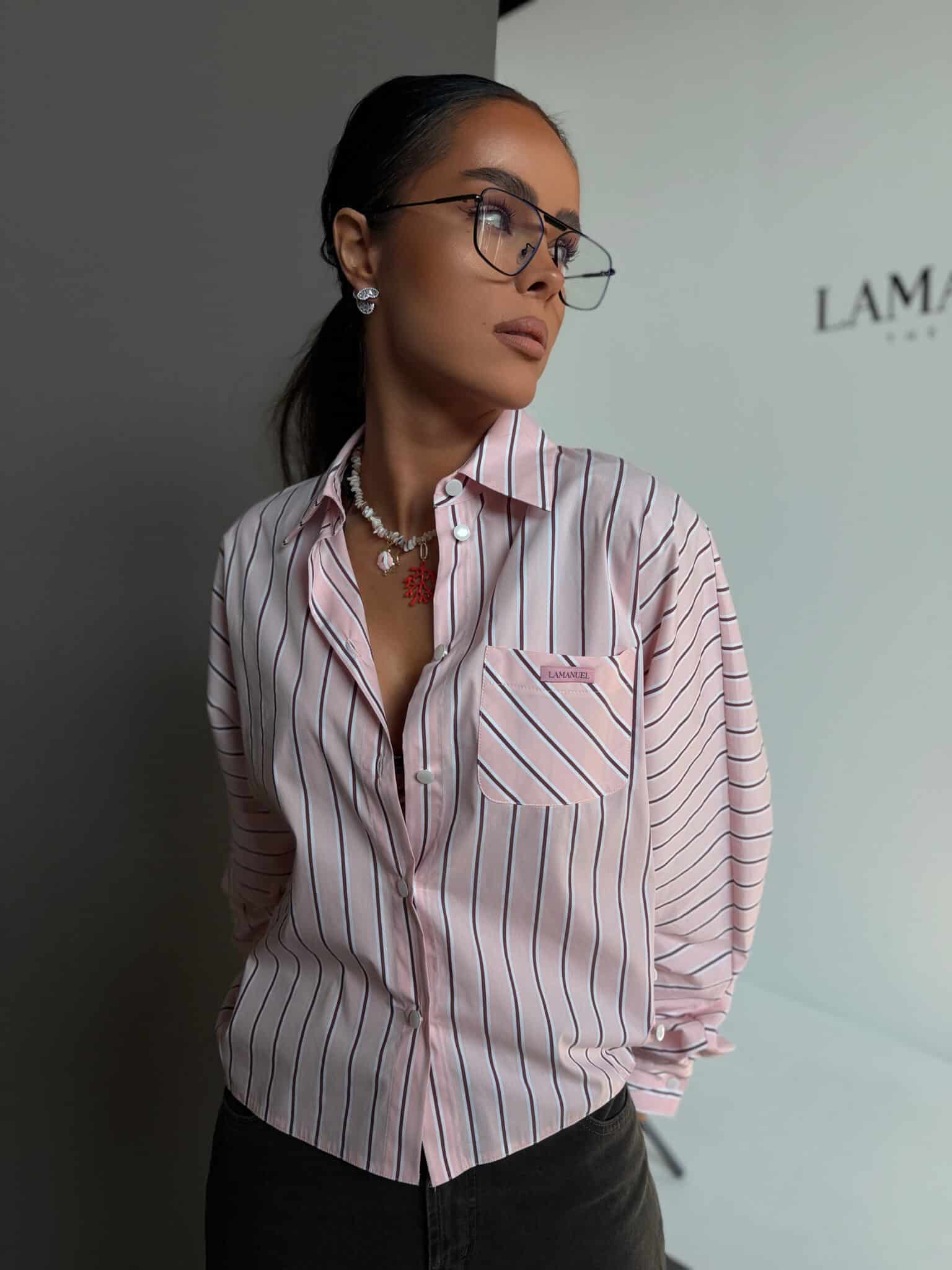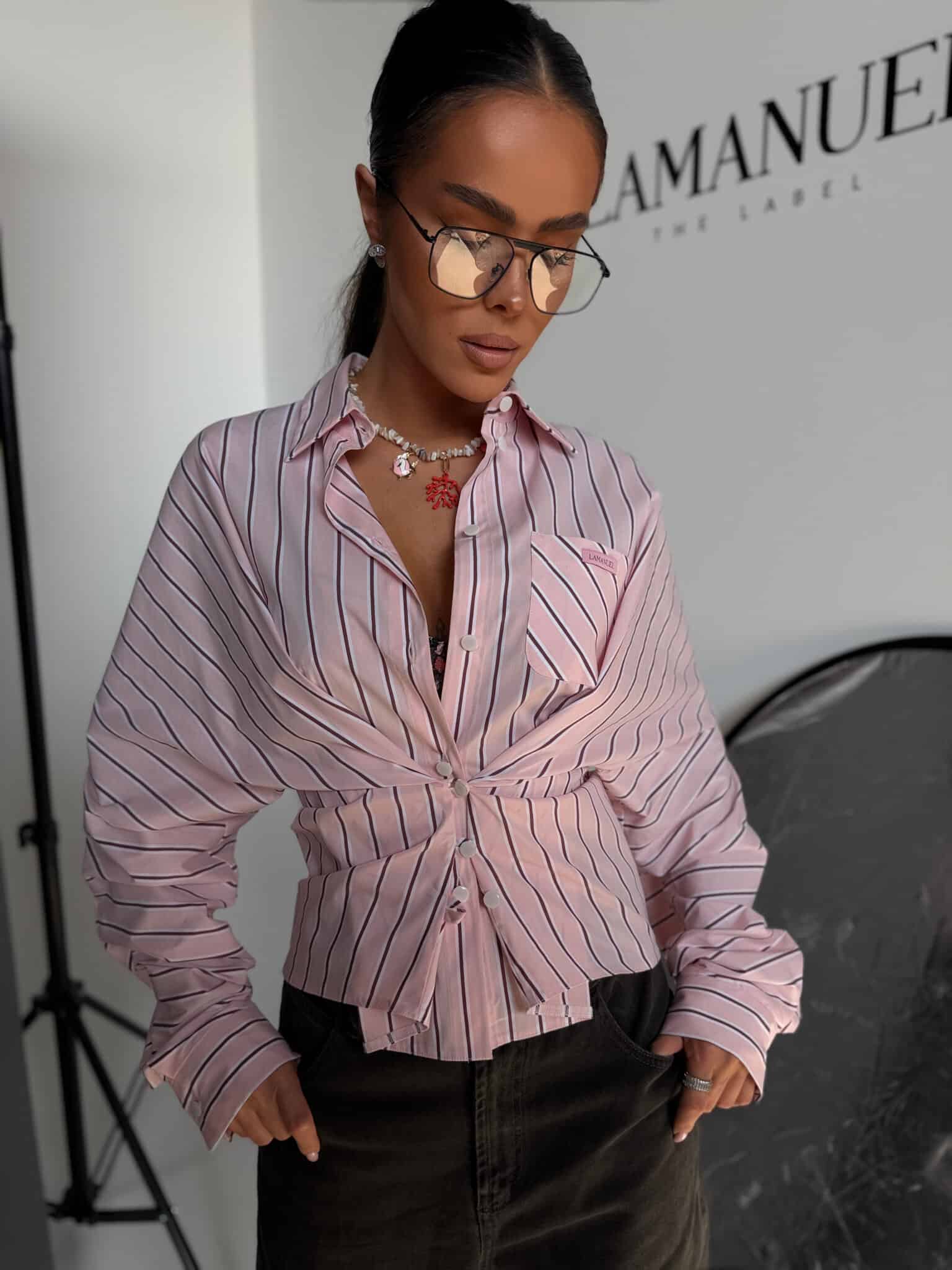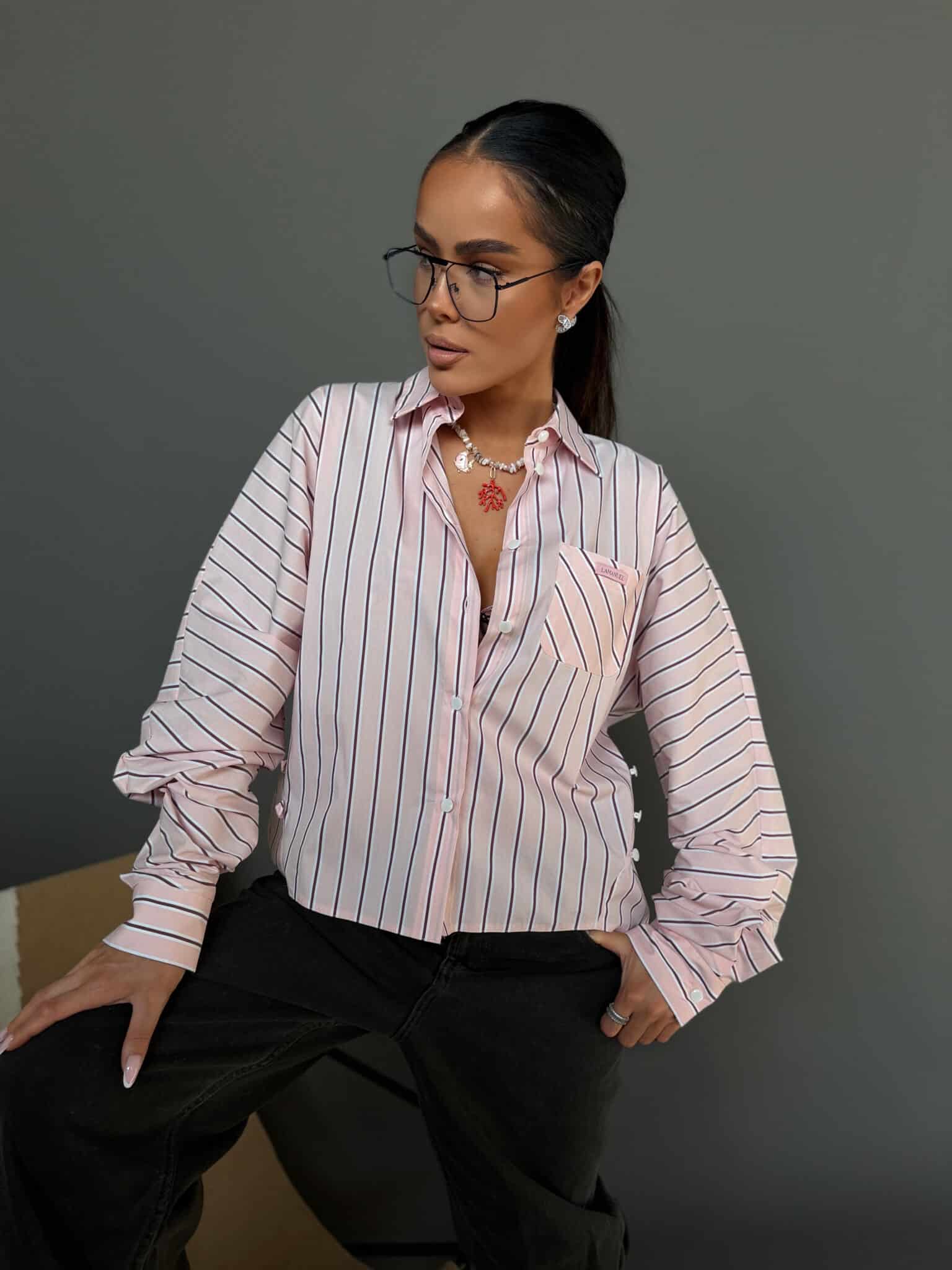 Koszula o luźnym, swobodnym kroju, wykonana z lekkiej, przyjemnej w dotyku tkaniny w pionowe paski. Model z klasycznym kołnierzykiem i zapięciem na guziki, który daje możliwość stylizacji na dwa sposoby. Może być noszona luźno, zapięta standardowo na całej długości, lub zapięta tylko na wybrane guziki z przodu, tworząc efekt podkreślonej talii i bardziej dopasowanej formy. Tkanina dobrze układa się na sylwetce, a zmienny sposób zapięcia pozwala nadać jej różny charakter.Skład: 75% bawełna 23% nylon 2% spandex