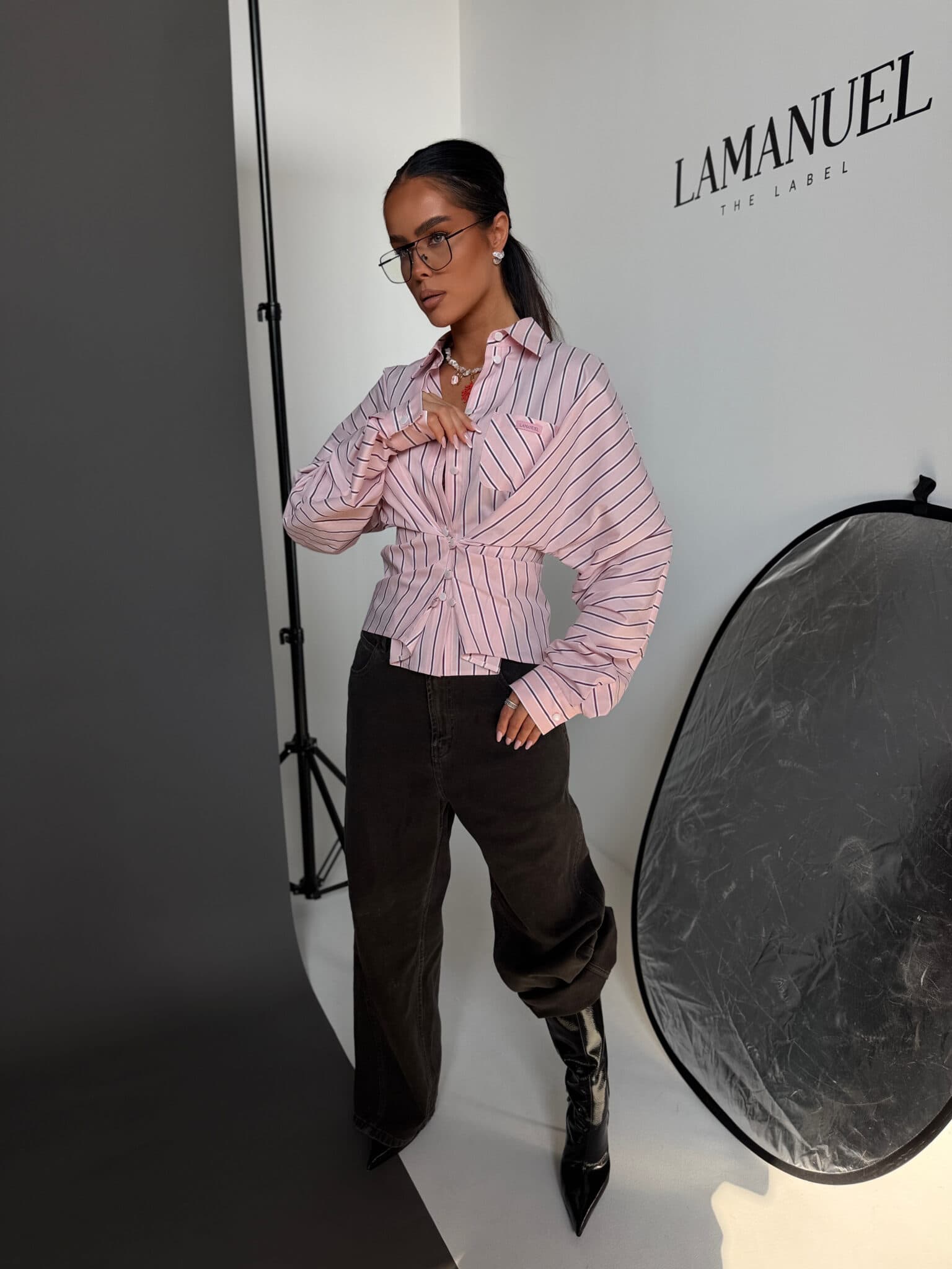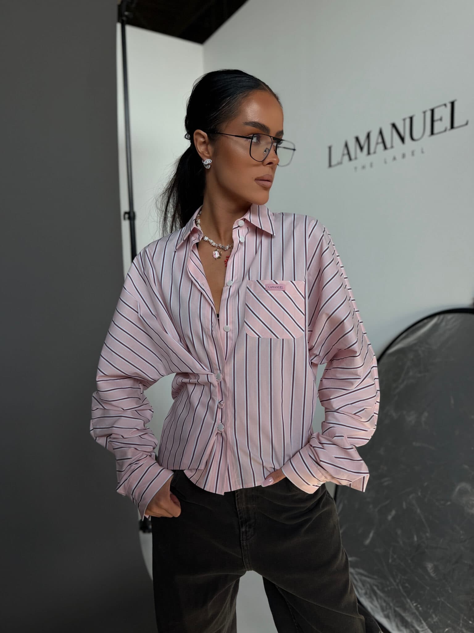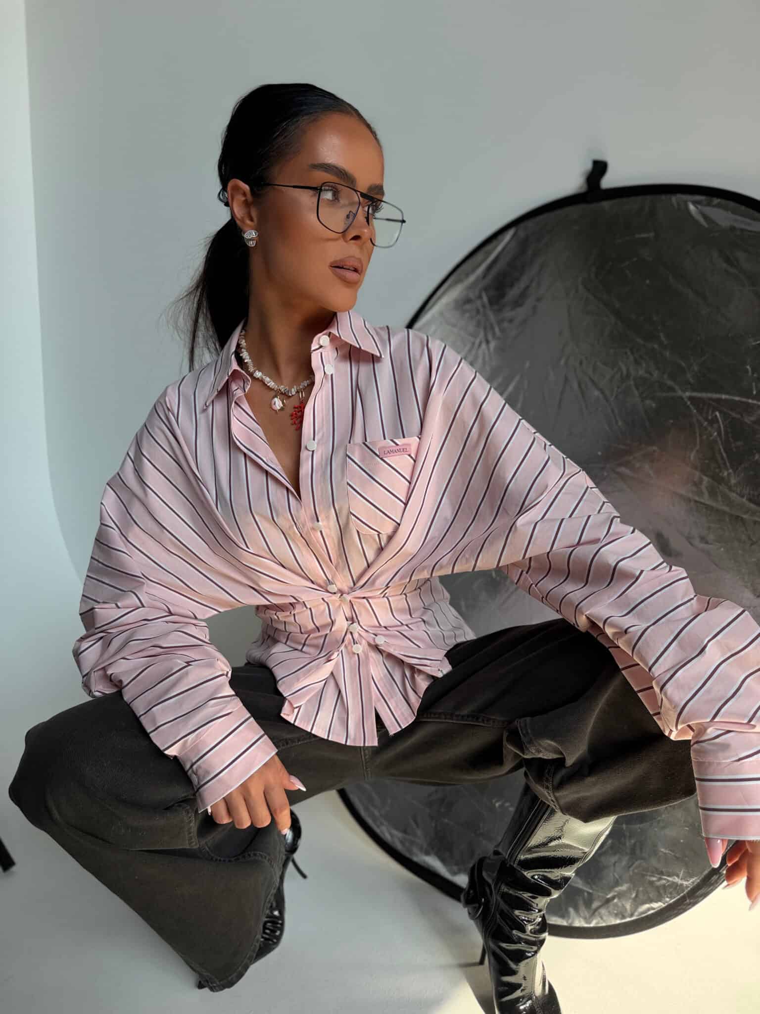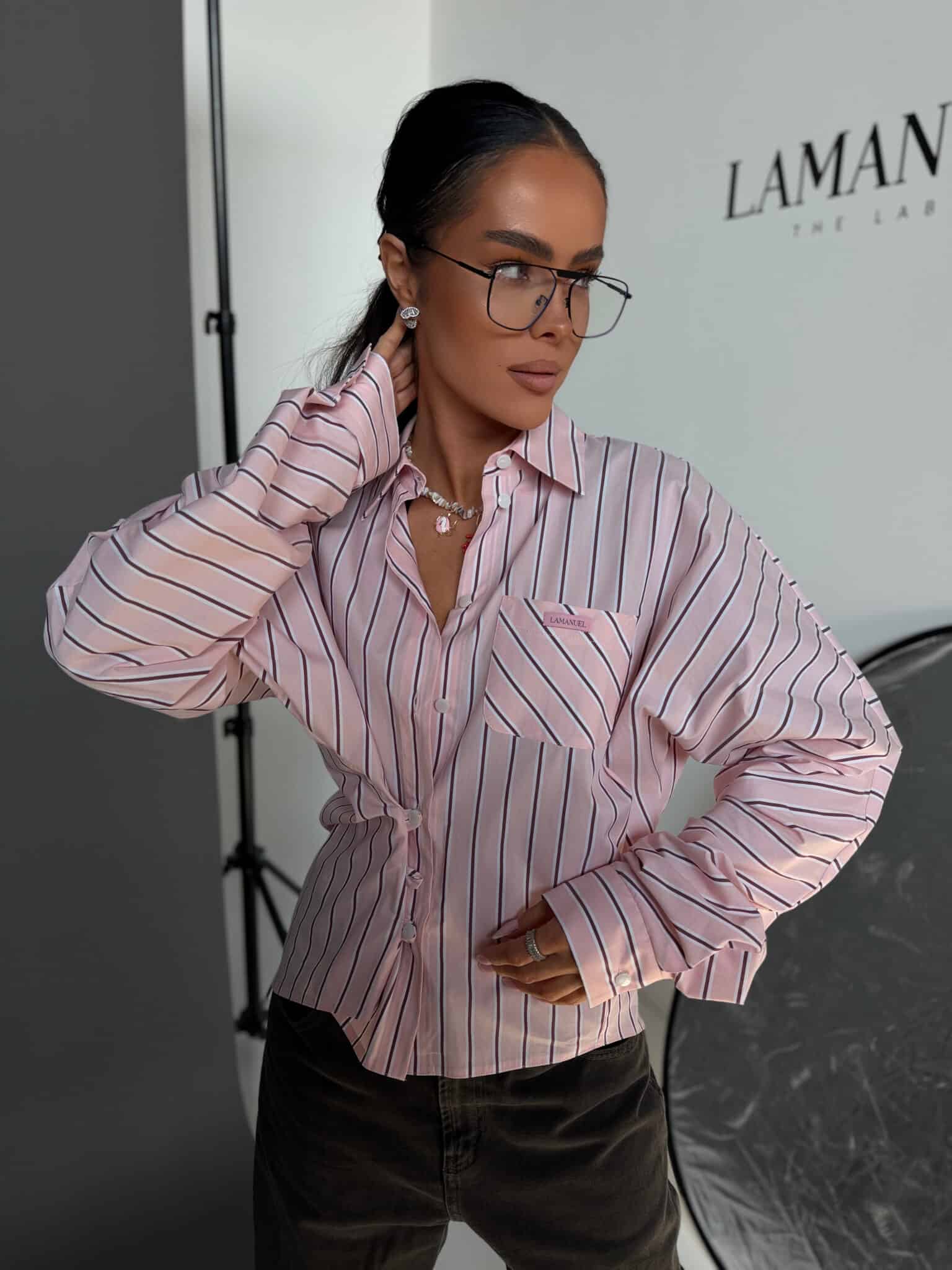 Koszula o luźnym, swobodnym kroju, wykonana z lekkiej, przyjemnej w dotyku tkaniny w pionowe paski. Model z klasycznym kołnierzykiem i zapięciem na guziki, który daje możliwość stylizacji na dwa sposoby. Może być noszona luźno, zapięta standardowo na całej długości, lub zapięta tylko na wybrane guziki z przodu, tworząc efekt podkreślonej talii i bardziej dopasowanej formy. Tkanina dobrze układa się na sylwetce, a zmienny sposób zapięcia pozwala nadać jej różny charakter.Skład: 75% bawełna 23% nylon 2% spandex