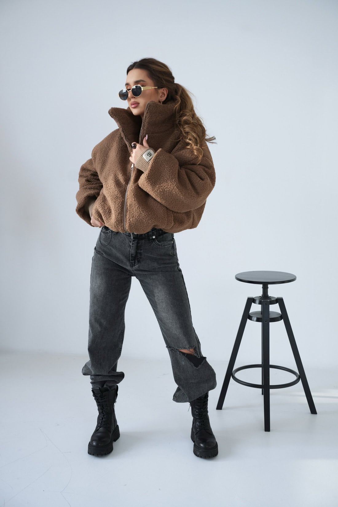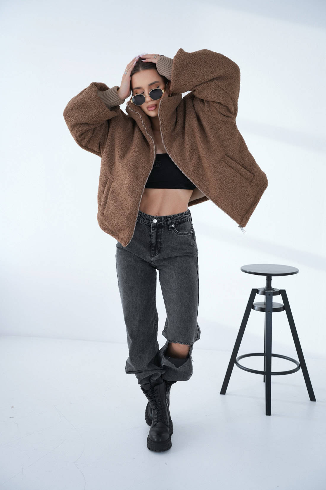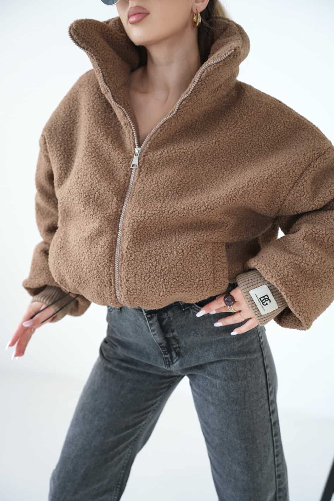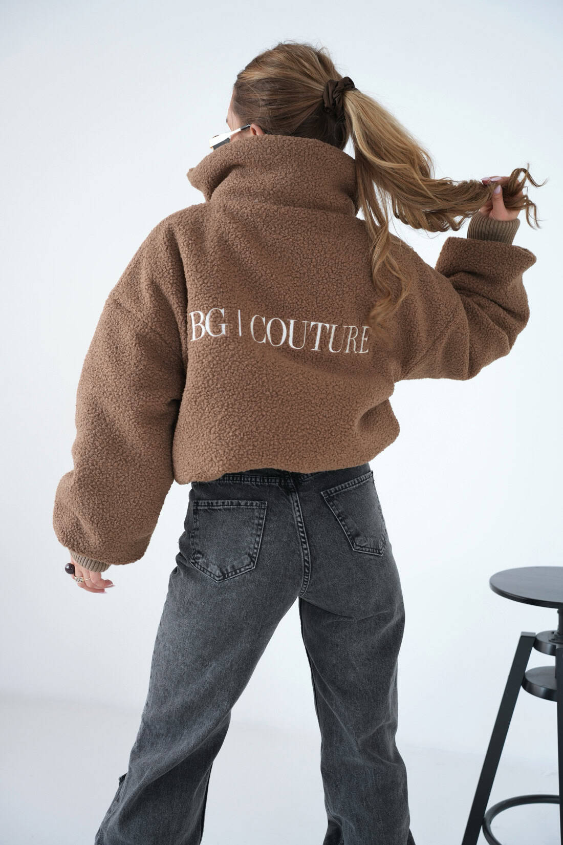 Opis produktu: Krótka, oversizowa kurtka typu „baranek” – idealna na zimę i wczesną wiosnę. Całość wykonana z ultra-miękkiego, gęstego sztucznego misia – puszysty, milutki w dotyku i bardzo ciepły. W środku dodatkowy, miękki ocieplacz oraz gładka, satynowa podszewka w tym samym odcieniu. Wysoki, otulający kołnierz. Mankiety wykończone szerokimi ściągaczami z naszywką z logo marki BG Brandenburg Couture. Na dole regulacja szerokości za pomocą grubego, gumowanego sznurka ze srebrnymi stoperami. Na plecach duże, haftowane eleganckie logo marki BG Brandenburg Couture. Luźny, lekko pudełkowy krój, opadające ramiona i krótka długość – wygląda obłędnie do legginsów, spodni z wysokim stanem. To połączenie przytulności domowego koca z miejskim, luksusowym stylem.