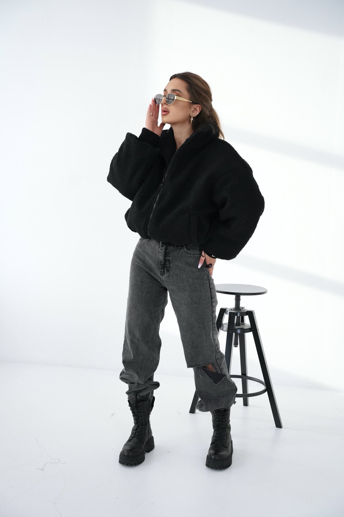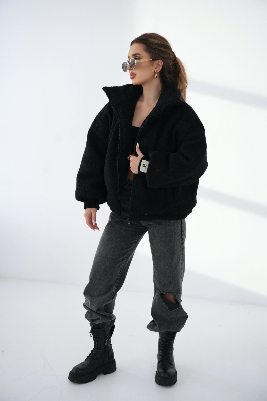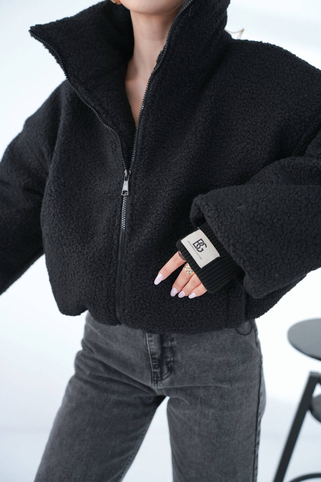 Opis produktu: Krótka, oversizowa kurtka typu „baranek” – idealna na zimę i wczesną wiosnę. Całość wykonana z ultra-miękkiego, gęstego sztucznego misia – puszysty, milutki w dotyku i bardzo ciepły. W środku dodatkowy, miękki ocieplacz oraz gładka, satynowa podszewka w tym samym odcieniu. Wysoki, otulający kołnierz. Mankiety wykończone szerokimi ściągaczami z naszywką z logo marki BG Brandenburg Couture. Na dole regulacja szerokości za pomocą grubego, gumowanego sznurka ze srebrnymi stoperami. Na plecach duże, haftowane eleganckie logo marki BG Brandenburg Couture. Luźny, lekko pudełkowy krój, opadające ramiona i krótka długość – wygląda obłędnie do legginsów, spodni z wysokim stanem. To połączenie przytulności domowego koca z miejskim, luksusowym stylem.