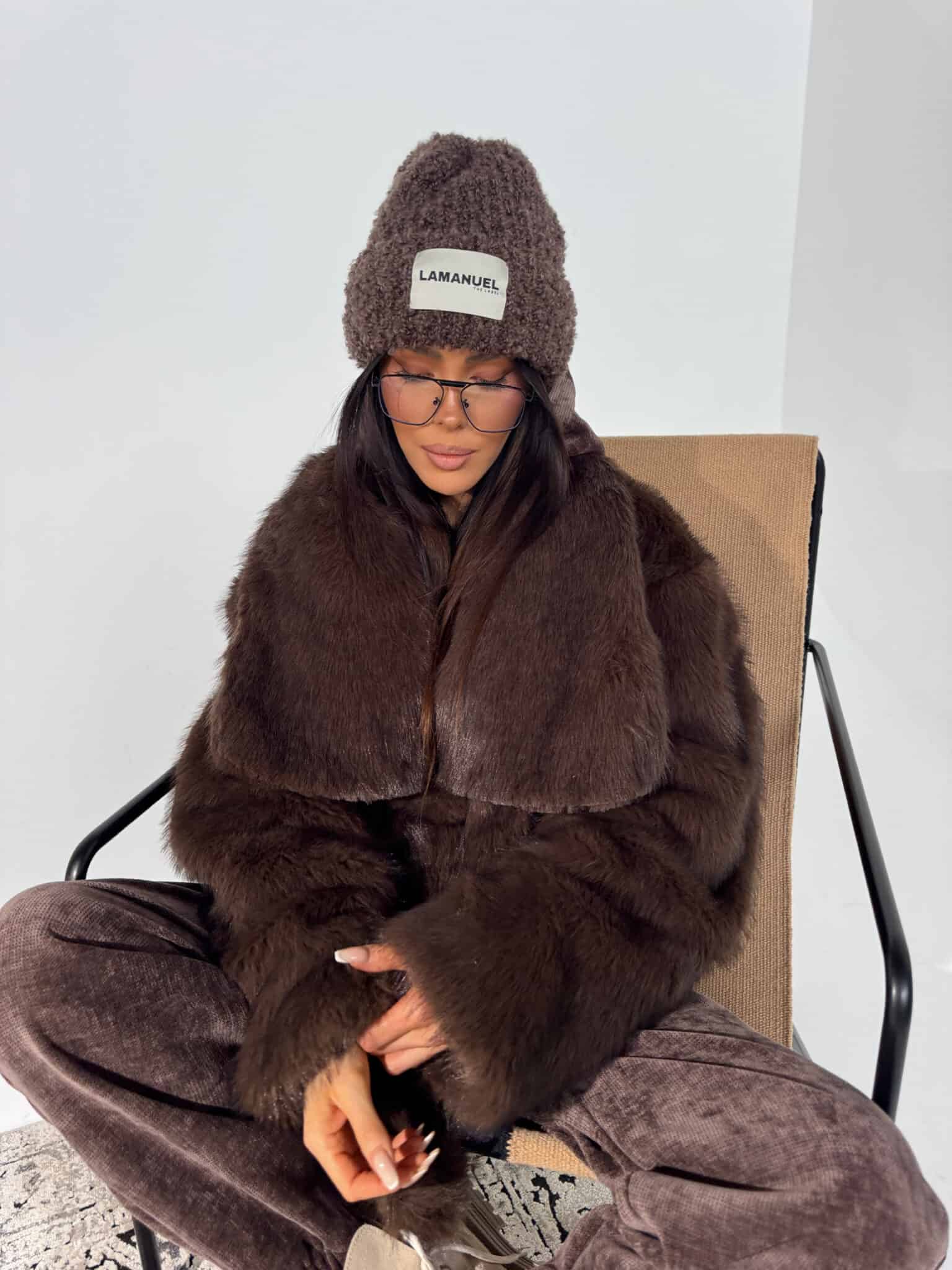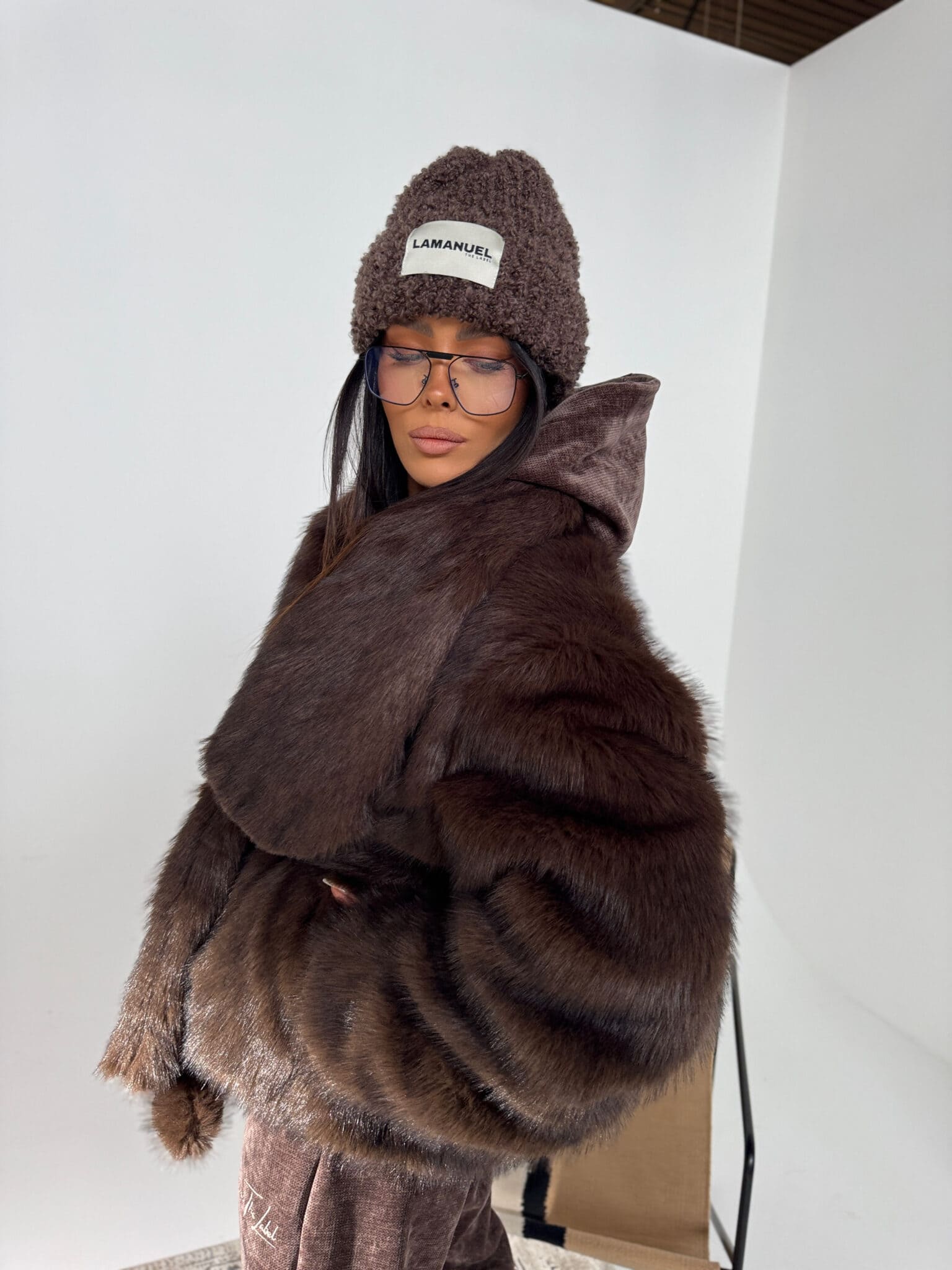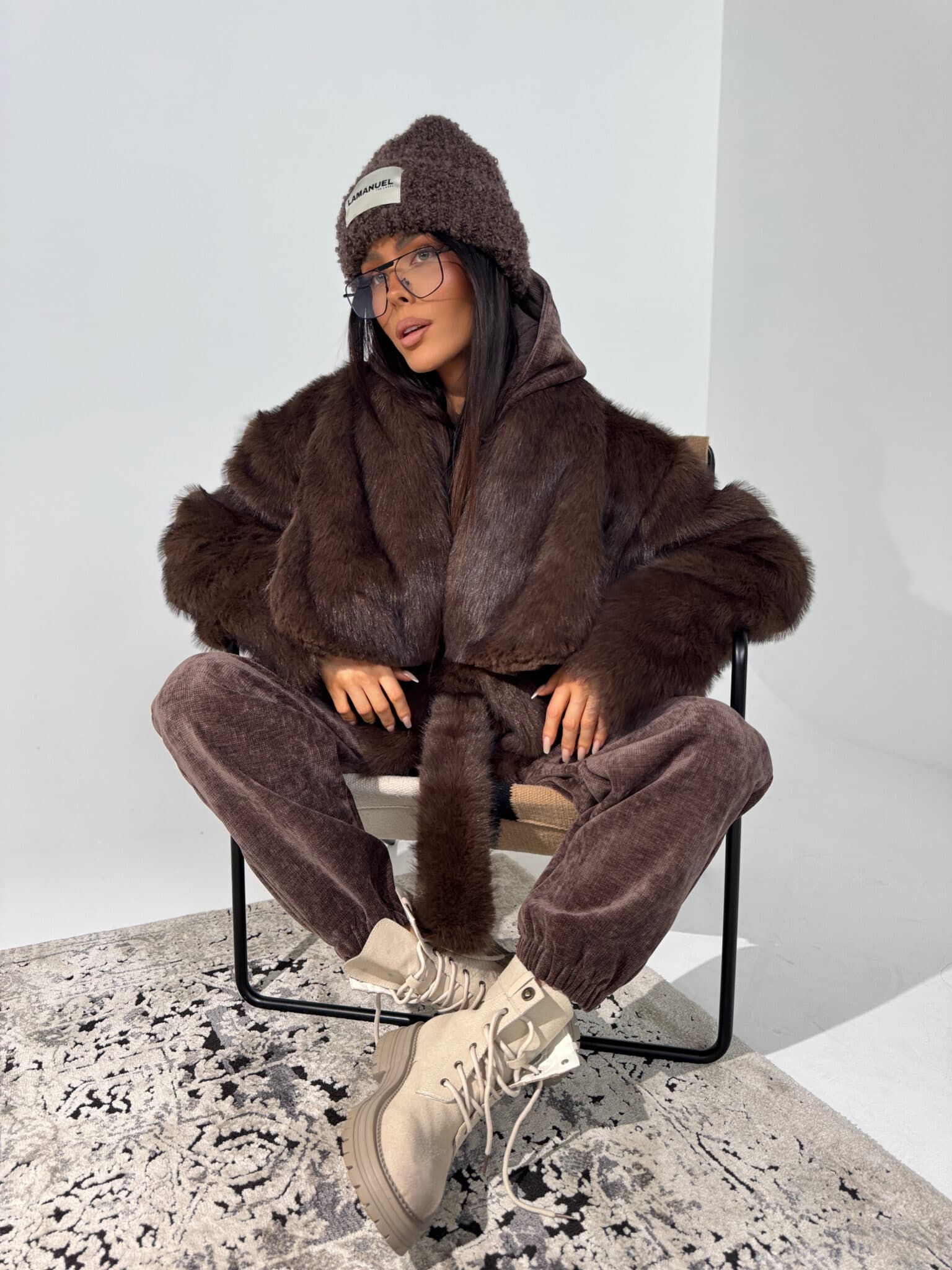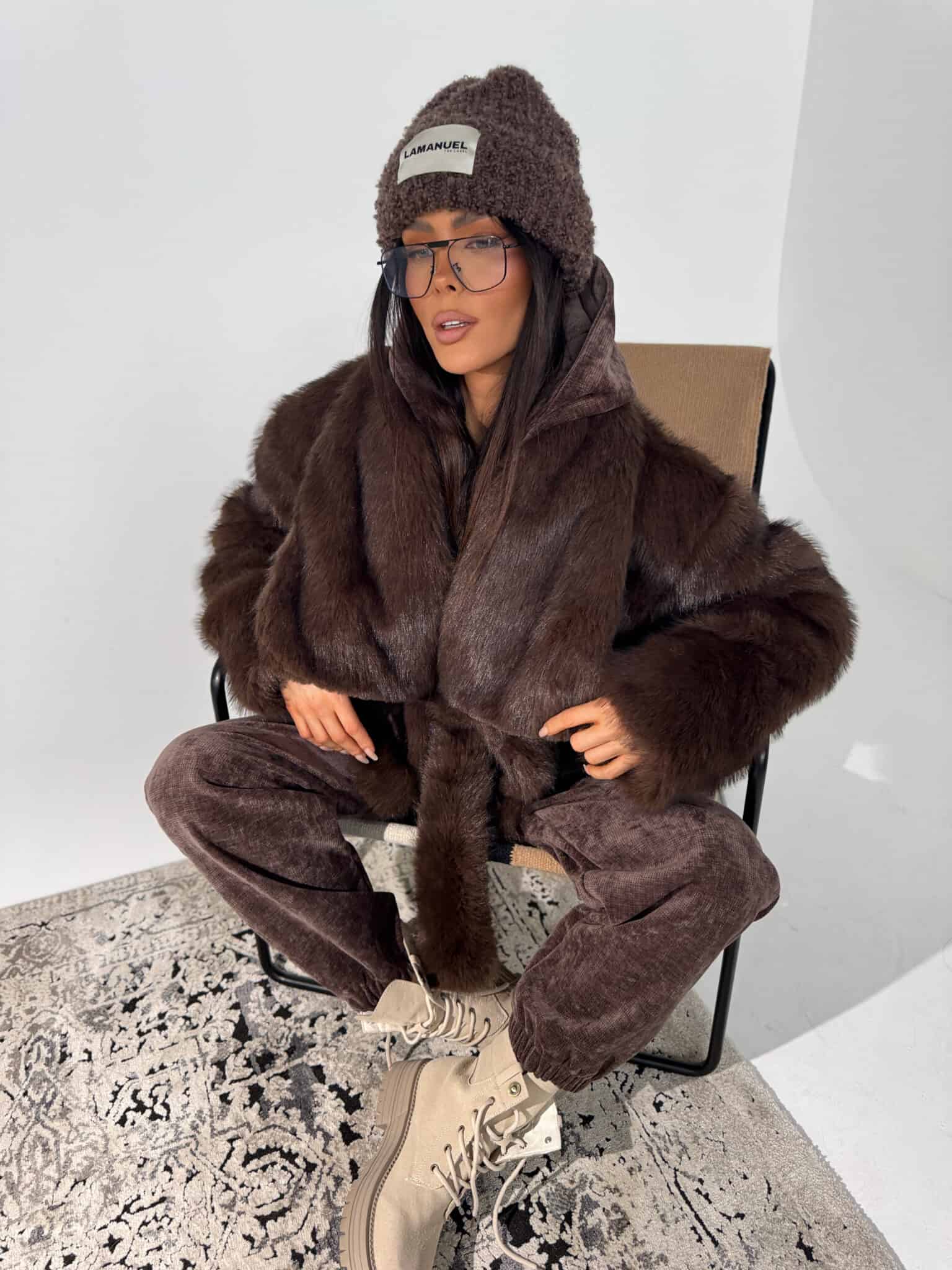 Wyjątkowe futro o luksusowym wyglądzie i kobiecej formie. Mięsista, gęsta tkanina imitująca naturalne futro nadaje całości elegancji, a przy tym skutecznie chroni przed chłodem. Model z obszernym kołnierzem, lekko opuszczoną linią ramion i wiązaniem w pasie, które pięknie podkreśla sylwetkę. Długość do bioder sprawia, że pasuje zarówno do spodni, jak i sukienek. Wygodne, wsuwane rękawy i przemyślany krój zapewniają komfort noszenia i modowy efekt bez wysiłku. Must-have sezonu dla kobiet, które cenią styl, wygodę i jakość wykonania.Skład: 100% poliester