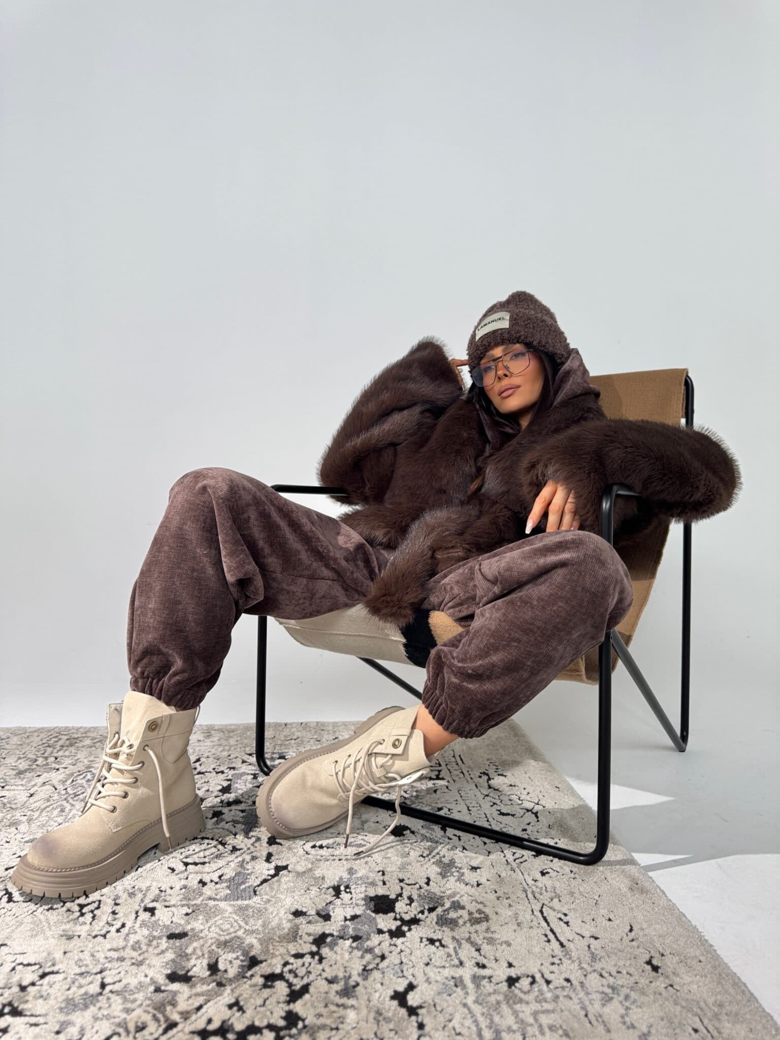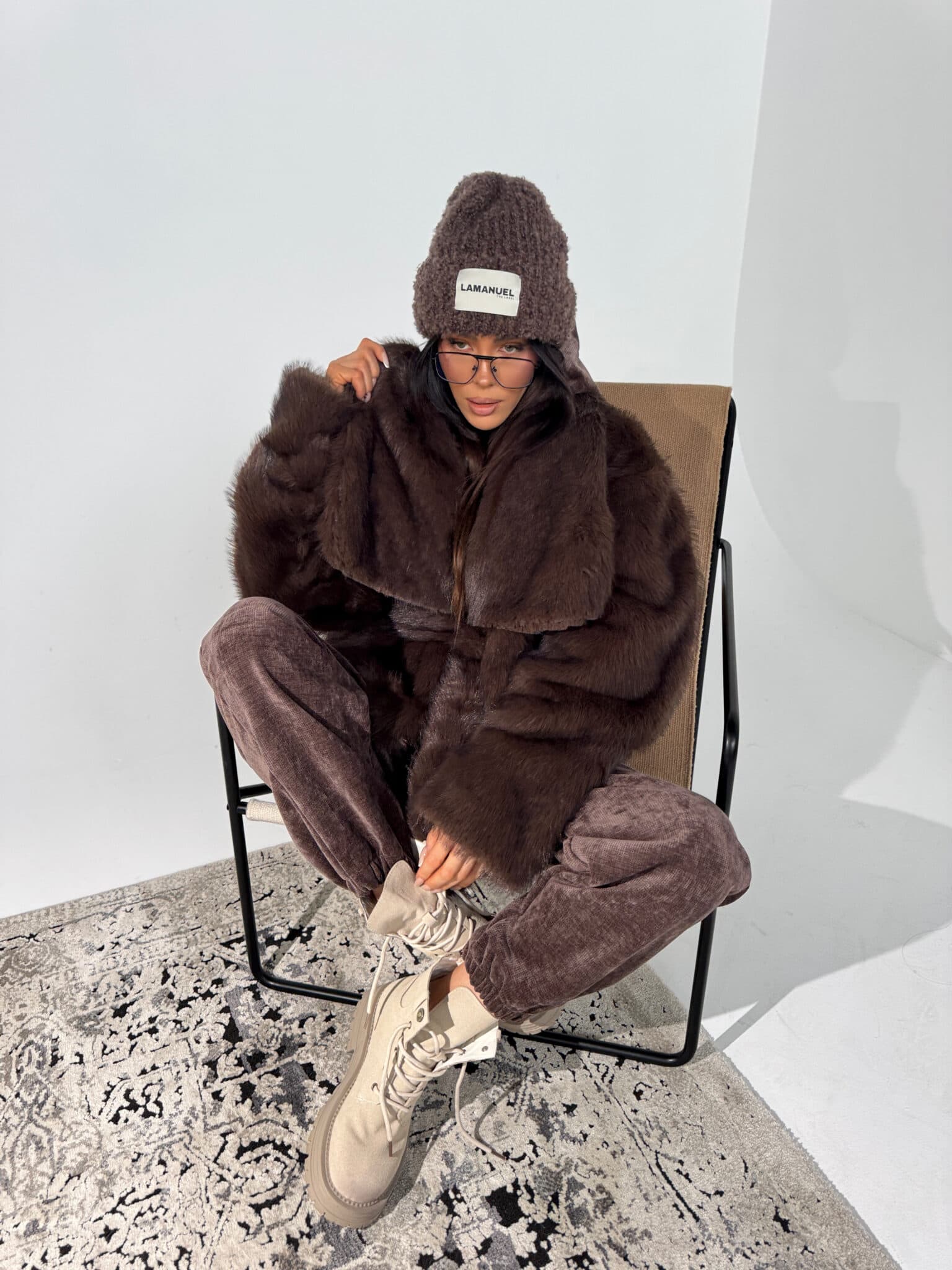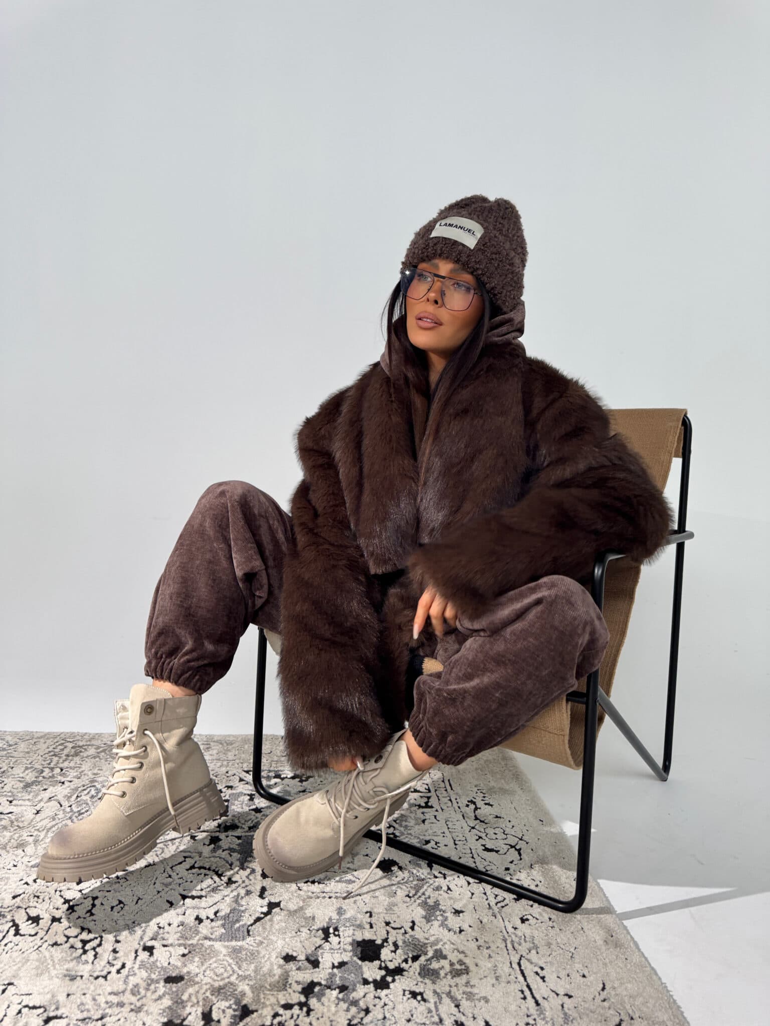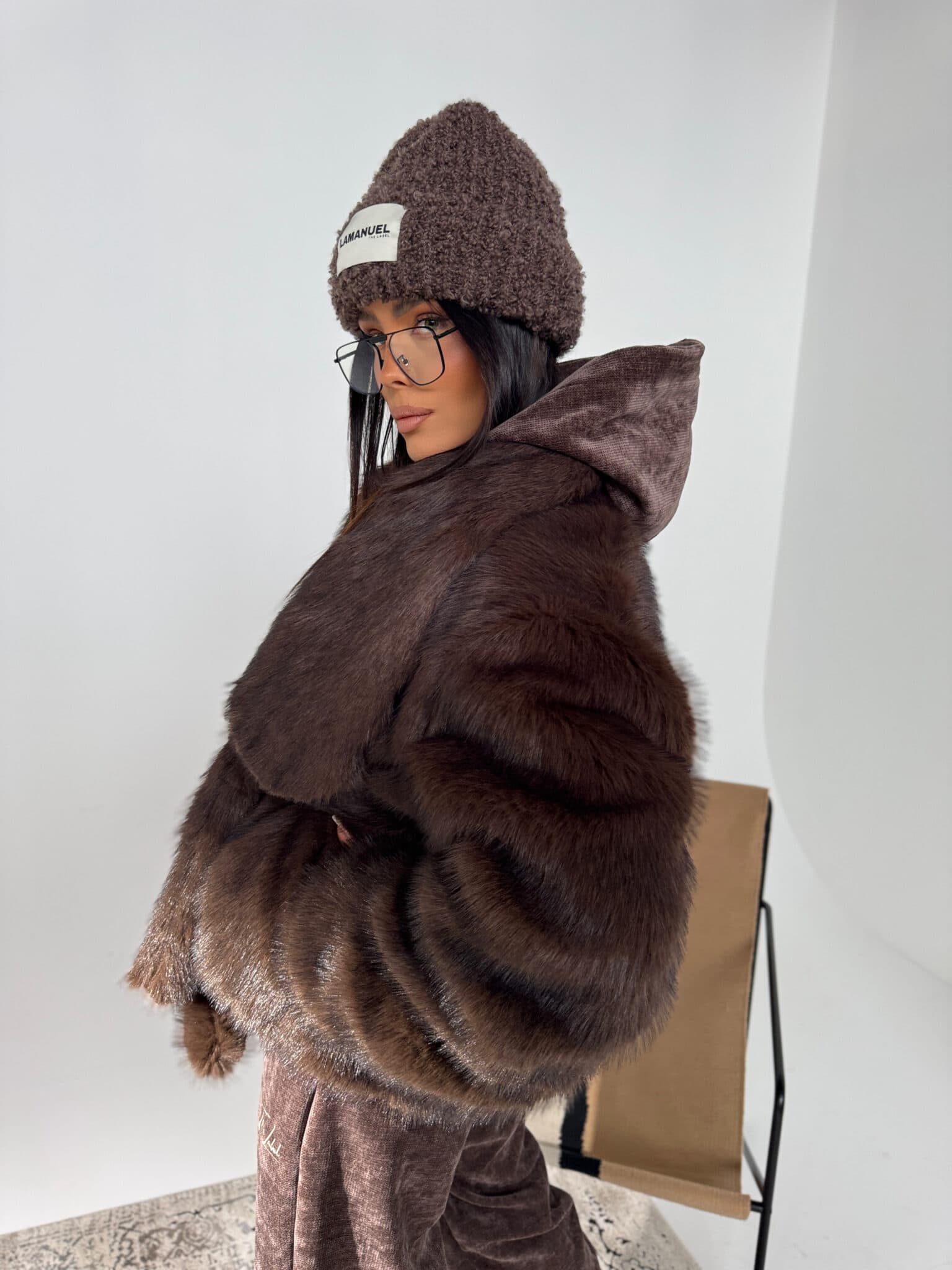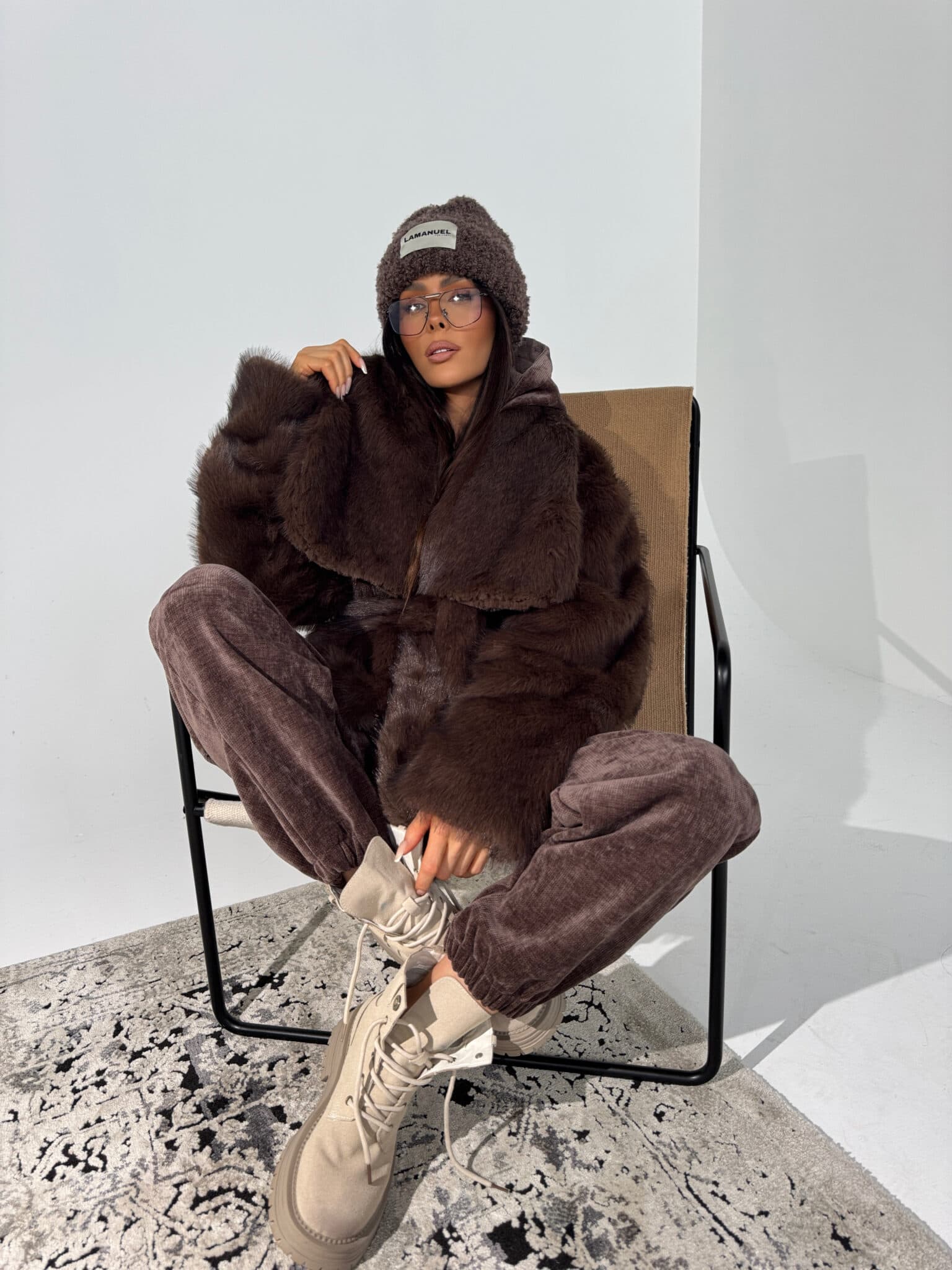 Wyjątkowe futro o luksusowym wyglądzie i kobiecej formie. Mięsista, gęsta tkanina imitująca naturalne futro nadaje całości elegancji, a przy tym skutecznie chroni przed chłodem. Model z obszernym kołnierzem, lekko opuszczoną linią ramion i wiązaniem w pasie, które pięknie podkreśla sylwetkę. Długość do bioder sprawia, że pasuje zarówno do spodni, jak i sukienek. Wygodne, wsuwane rękawy i przemyślany krój zapewniają komfort noszenia i modowy efekt bez wysiłku. Must-have sezonu dla kobiet, które cenią styl, wygodę i jakość wykonania.Skład: 100% poliester