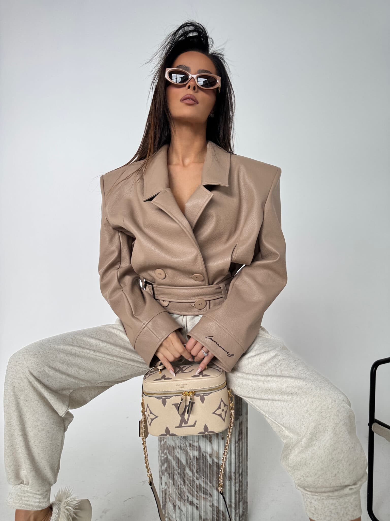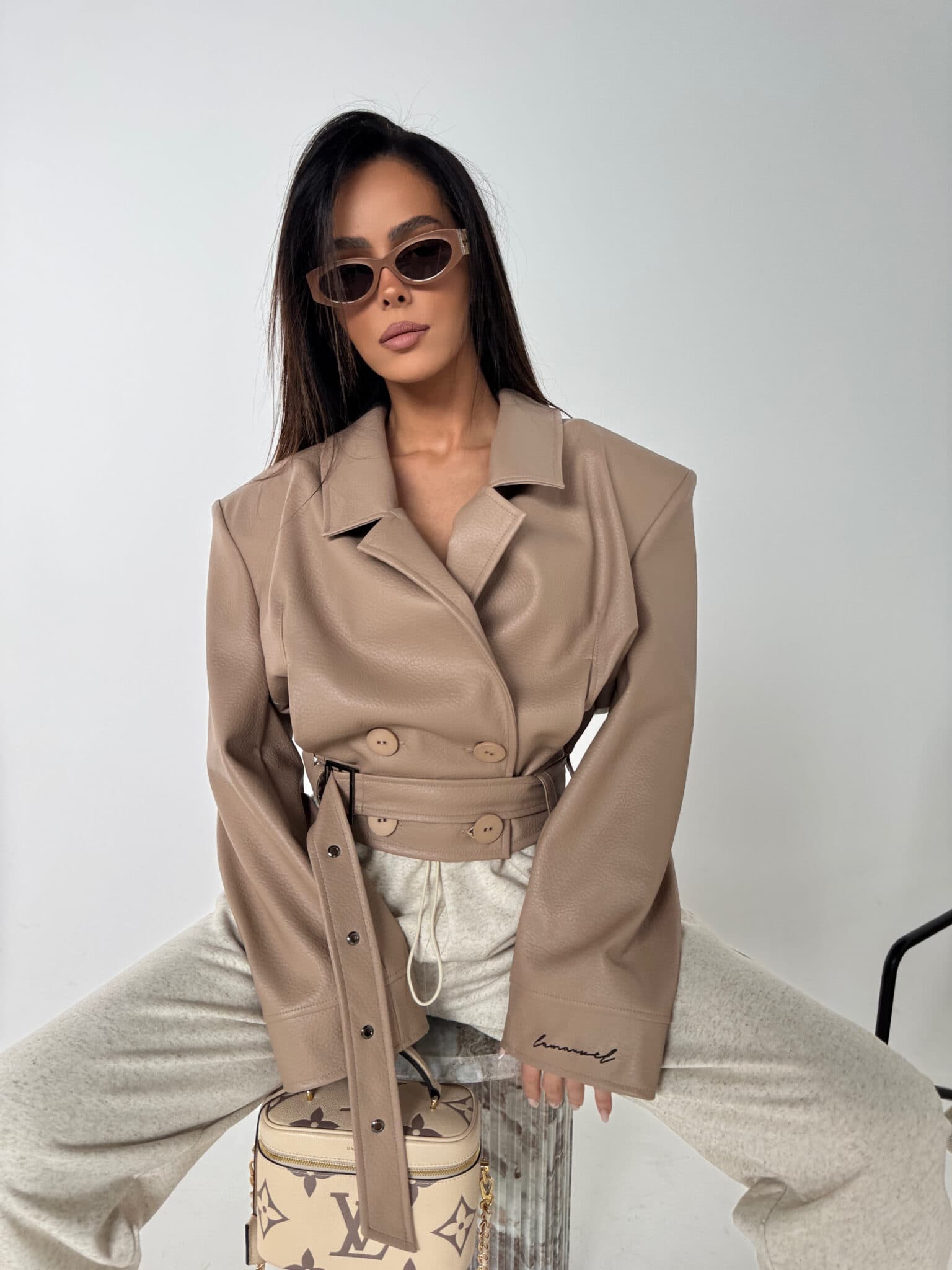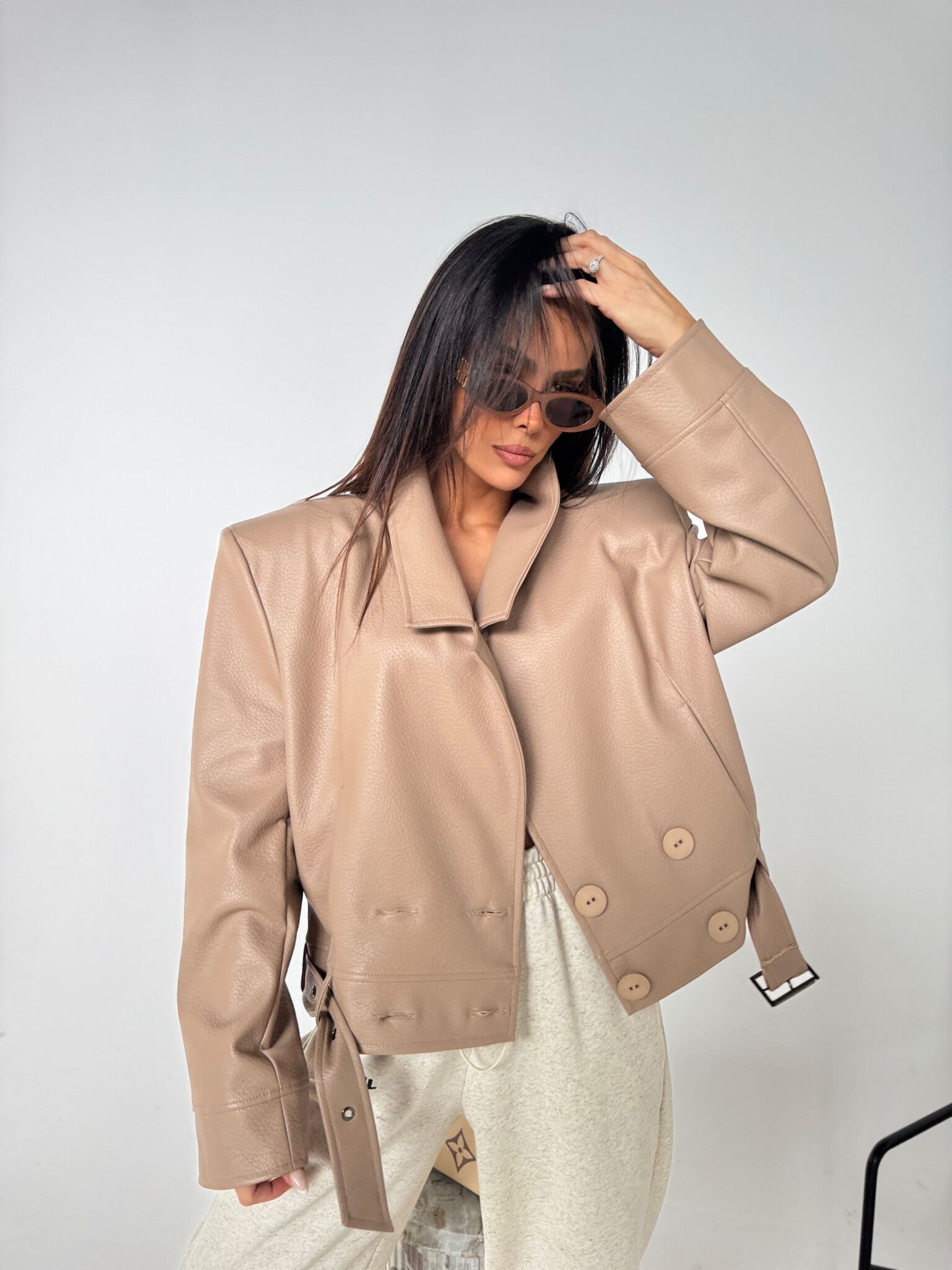 Kurtka wykonana z wysokiej jakości eko skóry o wyrazistej strukturze. Klasyczny fason z szerokimi ramionami i mocno zarysowaną linią kołnierza. Dwurzędowe zapięcie z dużymi guzikami i pasek z klamrą w talii podkreślają kobiecą sylwetkę. Stylowa, mocna forma – idealna do jeansów i codziennych looków.Skład: 100% poliuretan