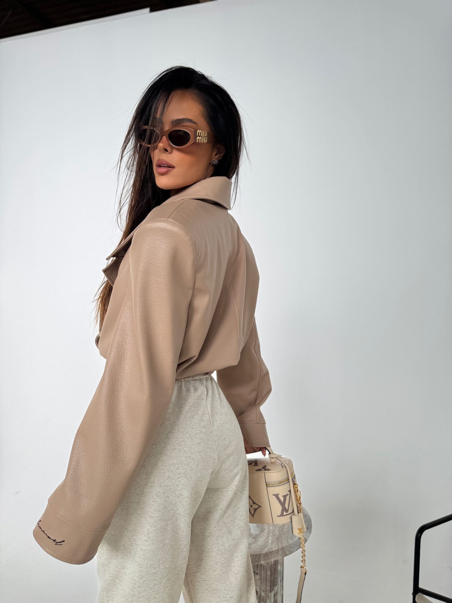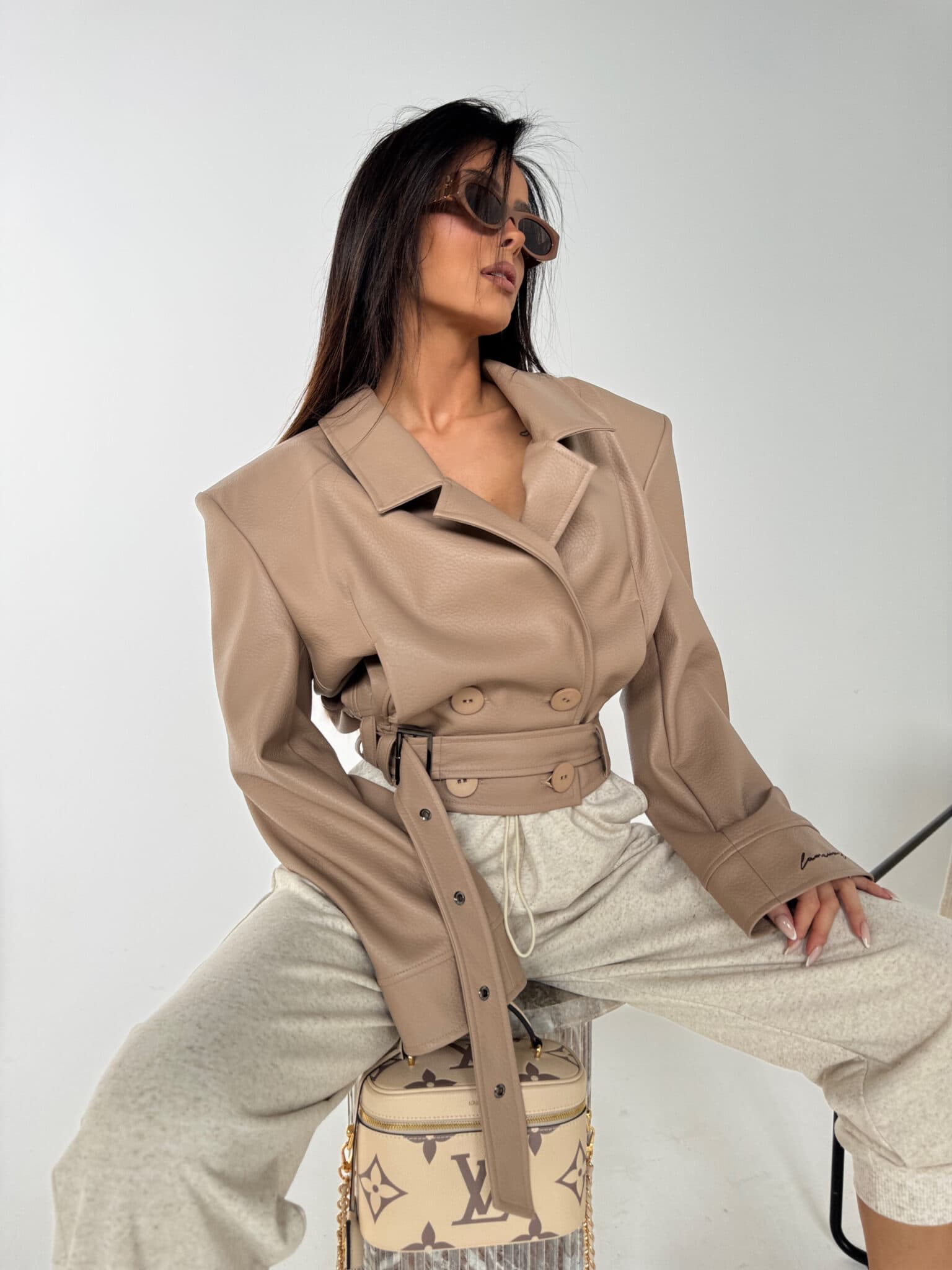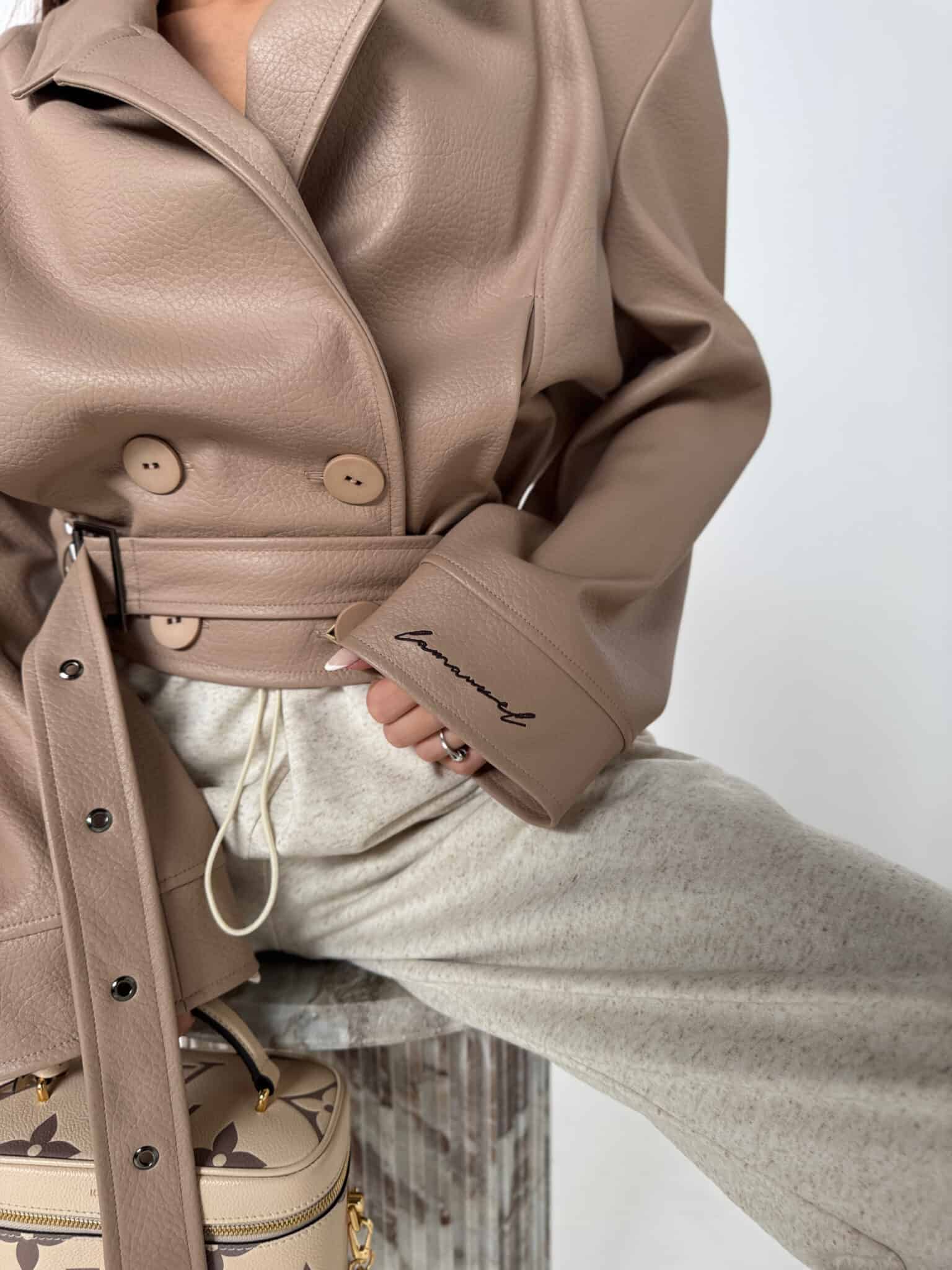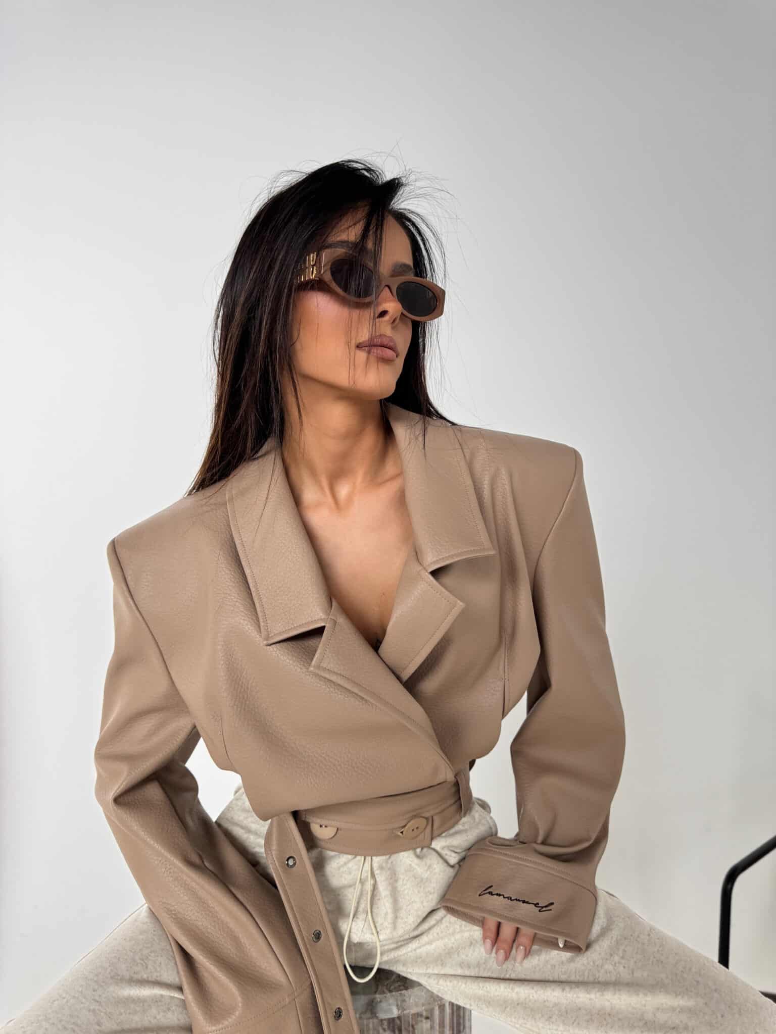 Kurtka wykonana z wysokiej jakości eko skóry o wyrazistej strukturze. Klasyczny fason z szerokimi ramionami i mocno zarysowaną linią kołnierza. Dwurzędowe zapięcie z dużymi guzikami i pasek z klamrą w talii podkreślają kobiecą sylwetkę. Stylowa, mocna forma – idealna do jeansów i codziennych looków.Skład: 100% poliuretan