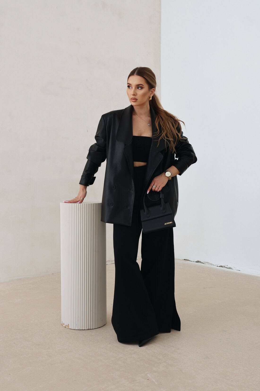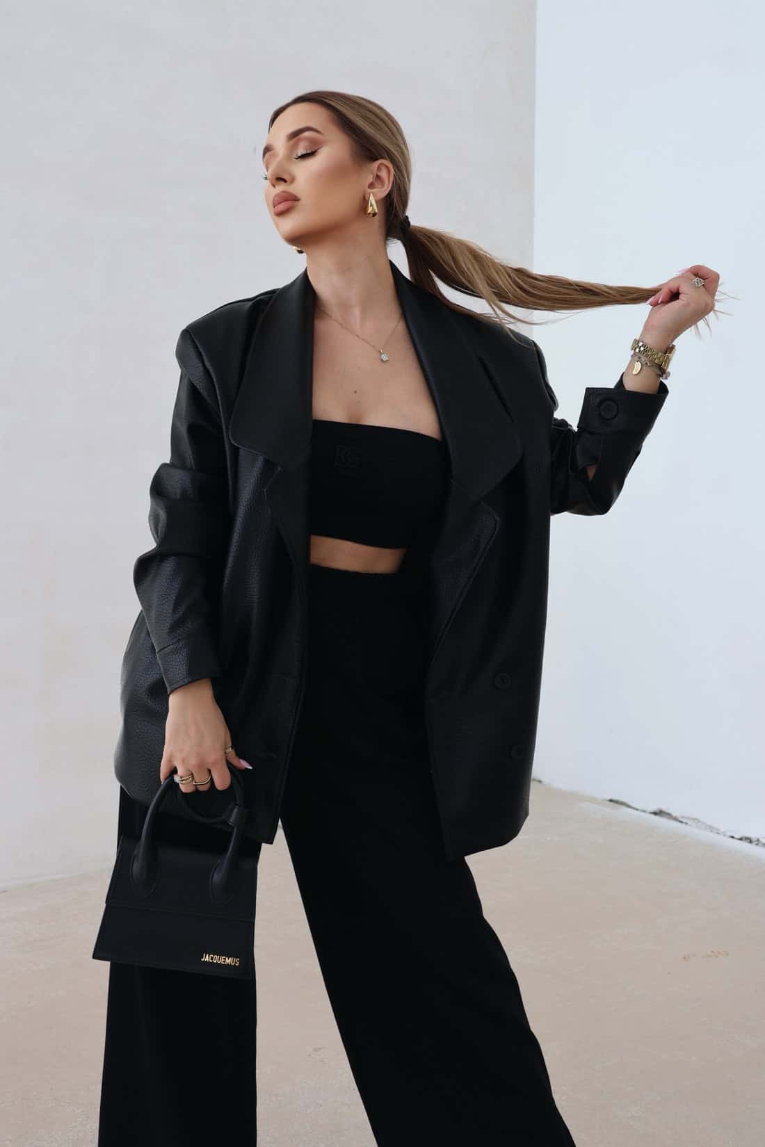 Opis produktu: Marynarka damska z imitacji karbowanej skóry. Dwurzędowa, zapinana na logowane guziki marki BG Brandenburg Couture. Na lewym rękawie elegancka naszywka z logo marki w kolorze czarnym. Marynarka na podszewce. Dodatkowo posiada kieszenie.