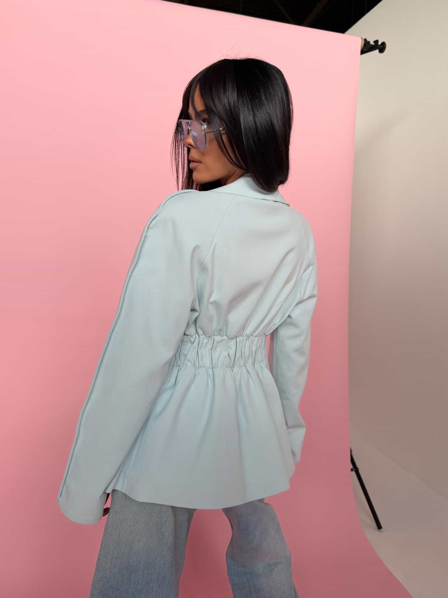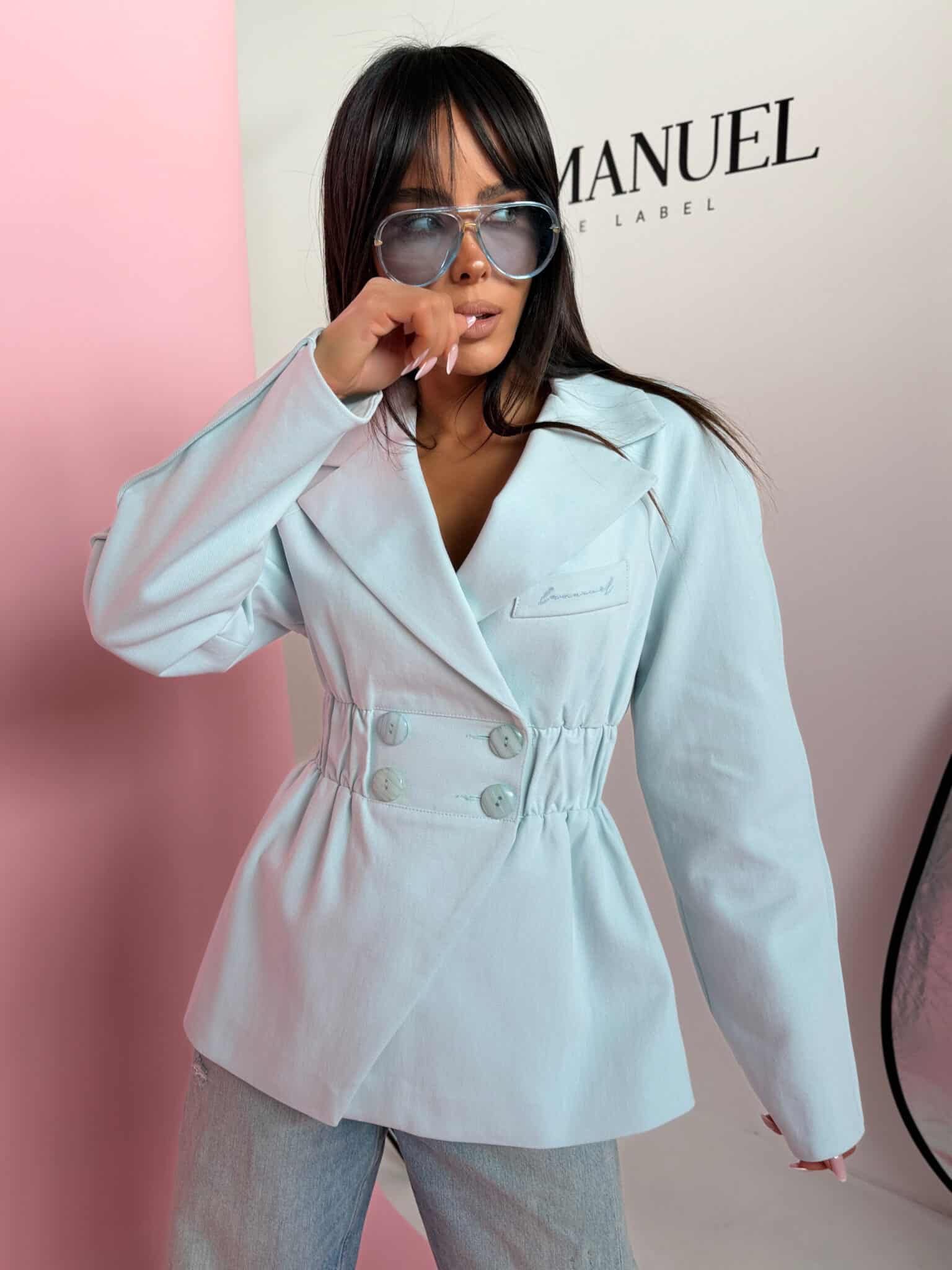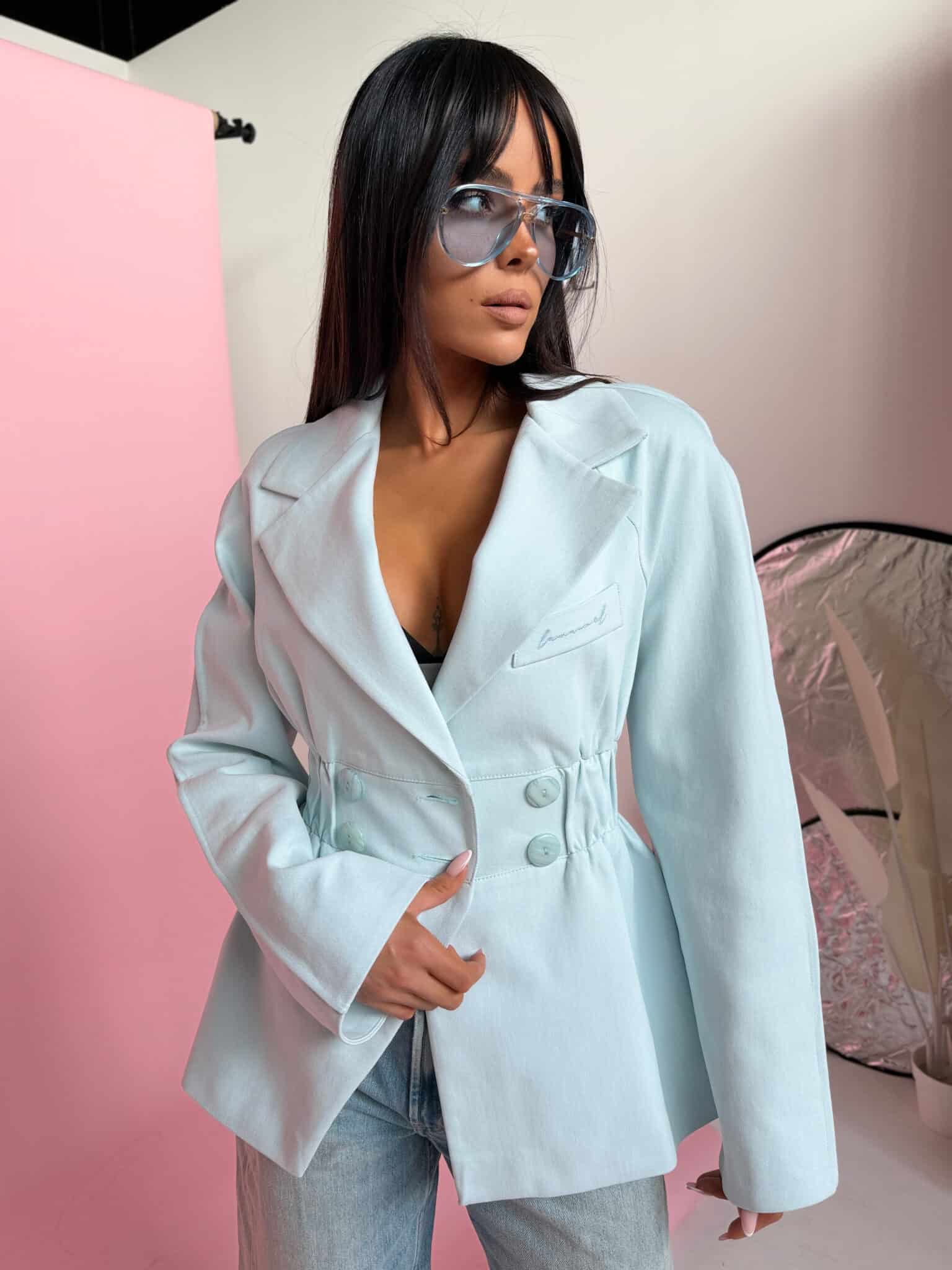 Marynarka o dopracowanym kroju, wykonana z denimu. Model dwurzędowy, zapinany na guziki, z wyraźnie zaznaczoną talią dzięki marszczeniu. Klasyczne klapy i lekko wydłużona linia nadają eleganckiego charakteru, przełamanego casualowym materiałem. Nowoczesna forma, która łączy styl i wygodę w jednej sylwetce.Skład: 100% bawełna