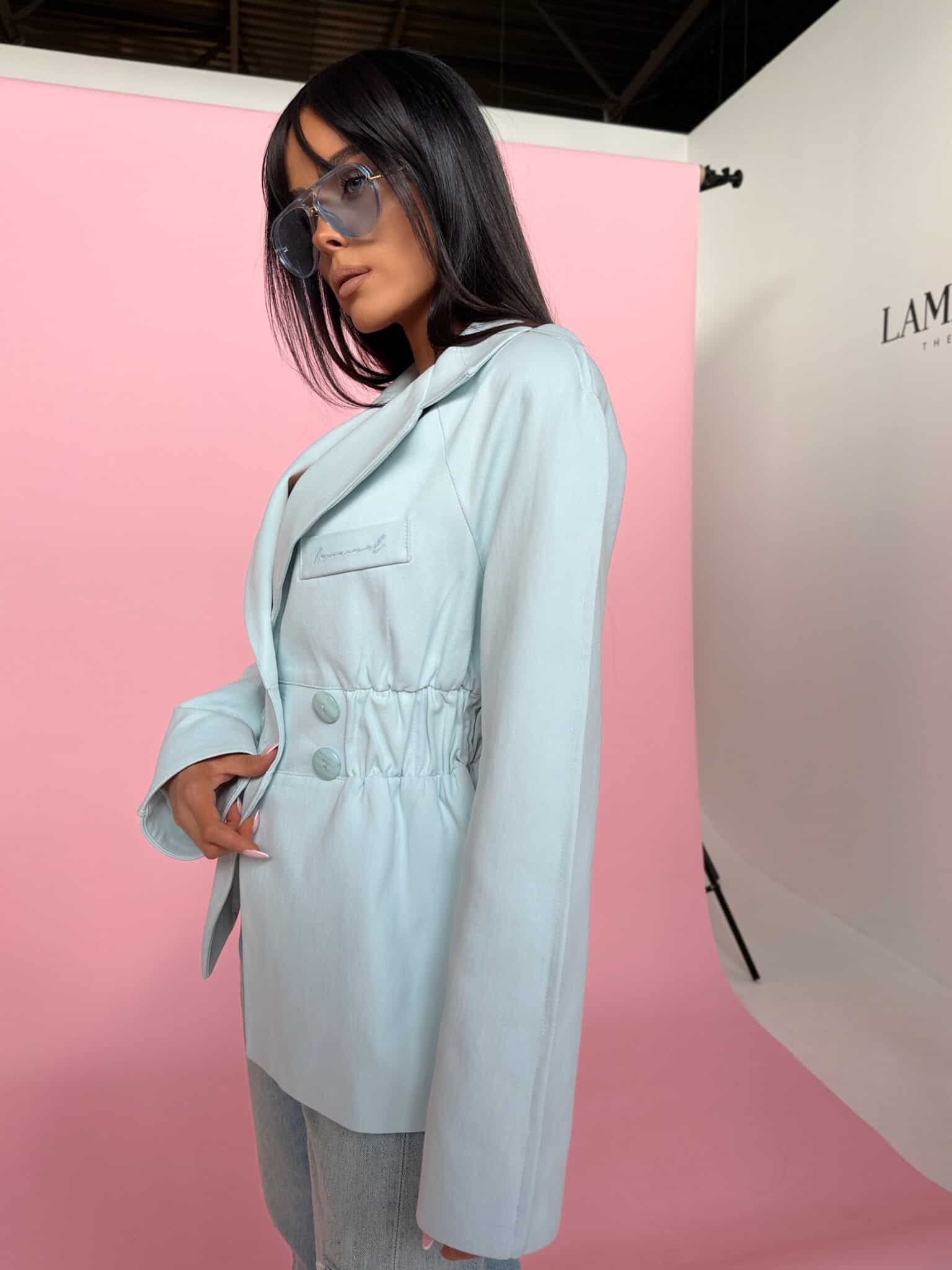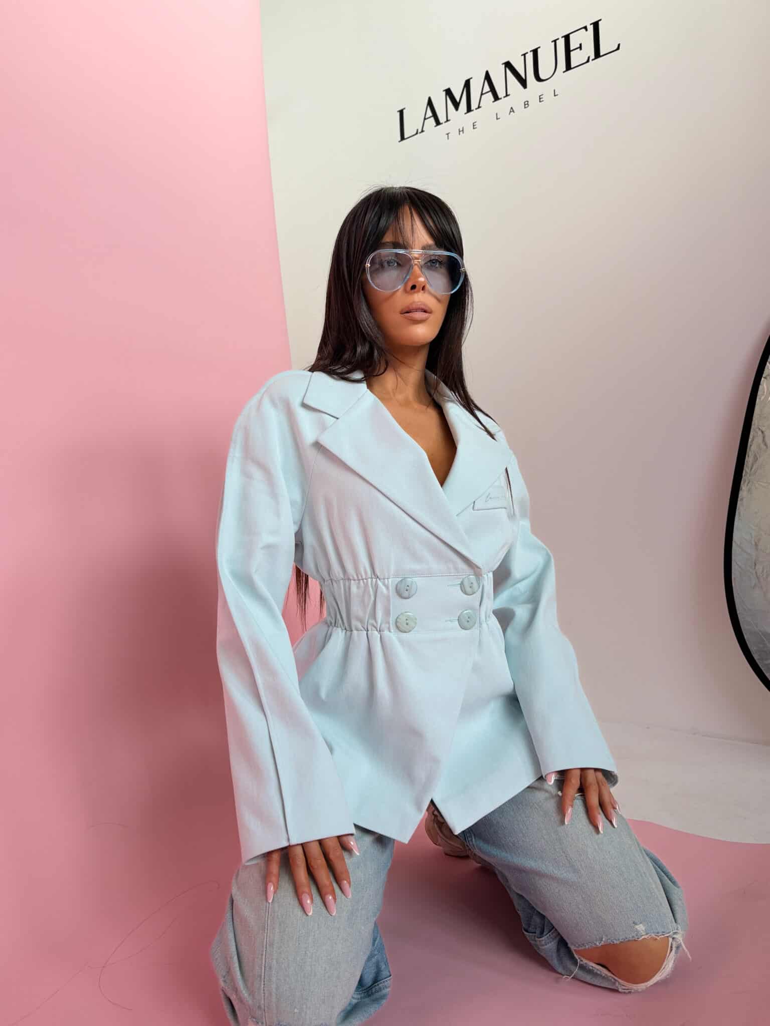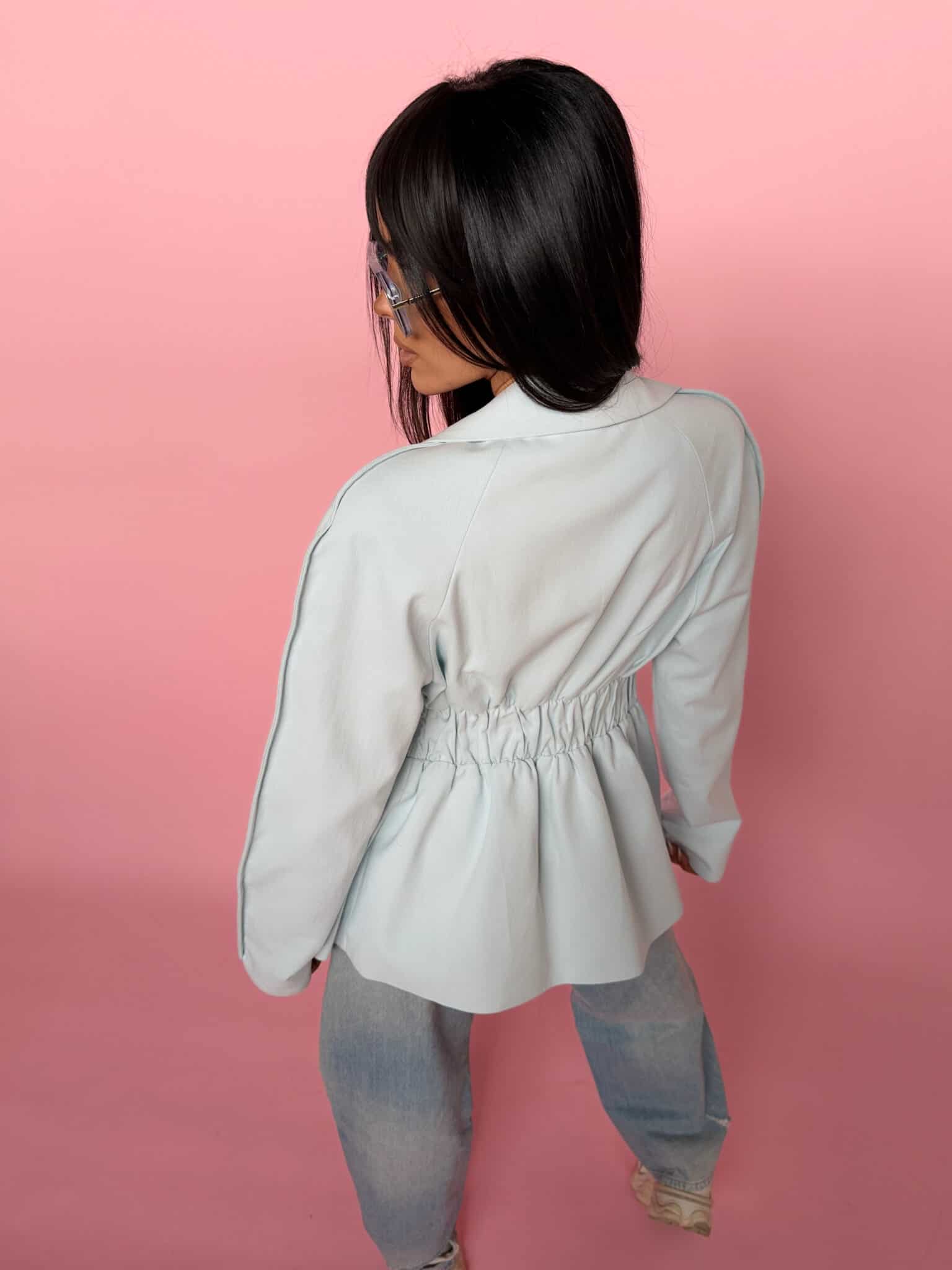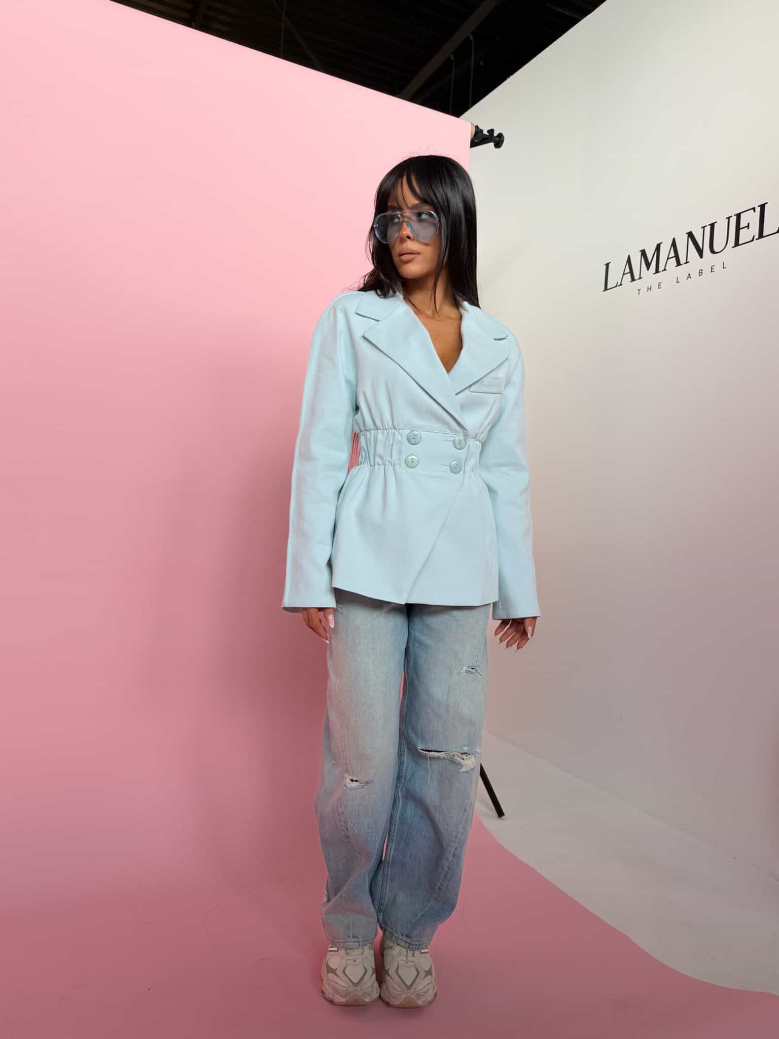 Marynarka o dopracowanym kroju, wykonana z denimu. Model dwurzędowy, zapinany na guziki, z wyraźnie zaznaczoną talią dzięki marszczeniu. Klasyczne klapy i lekko wydłużona linia nadają eleganckiego charakteru, przełamanego casualowym materiałem. Nowoczesna forma, która łączy styl i wygodę w jednej sylwetce.Skład: 100% bawełna