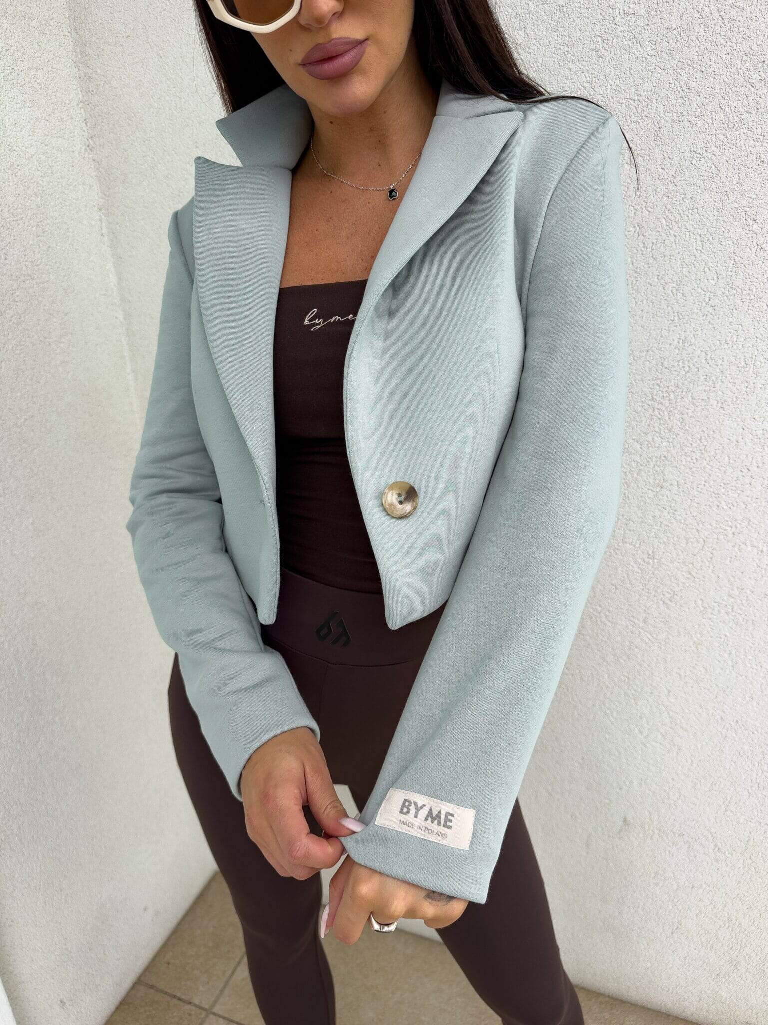 Marynarka o krótkim kroju, gładkie wykończenie. Marynarka posiada podszewkę, zapięcie regulowane przy pomocy guzika.