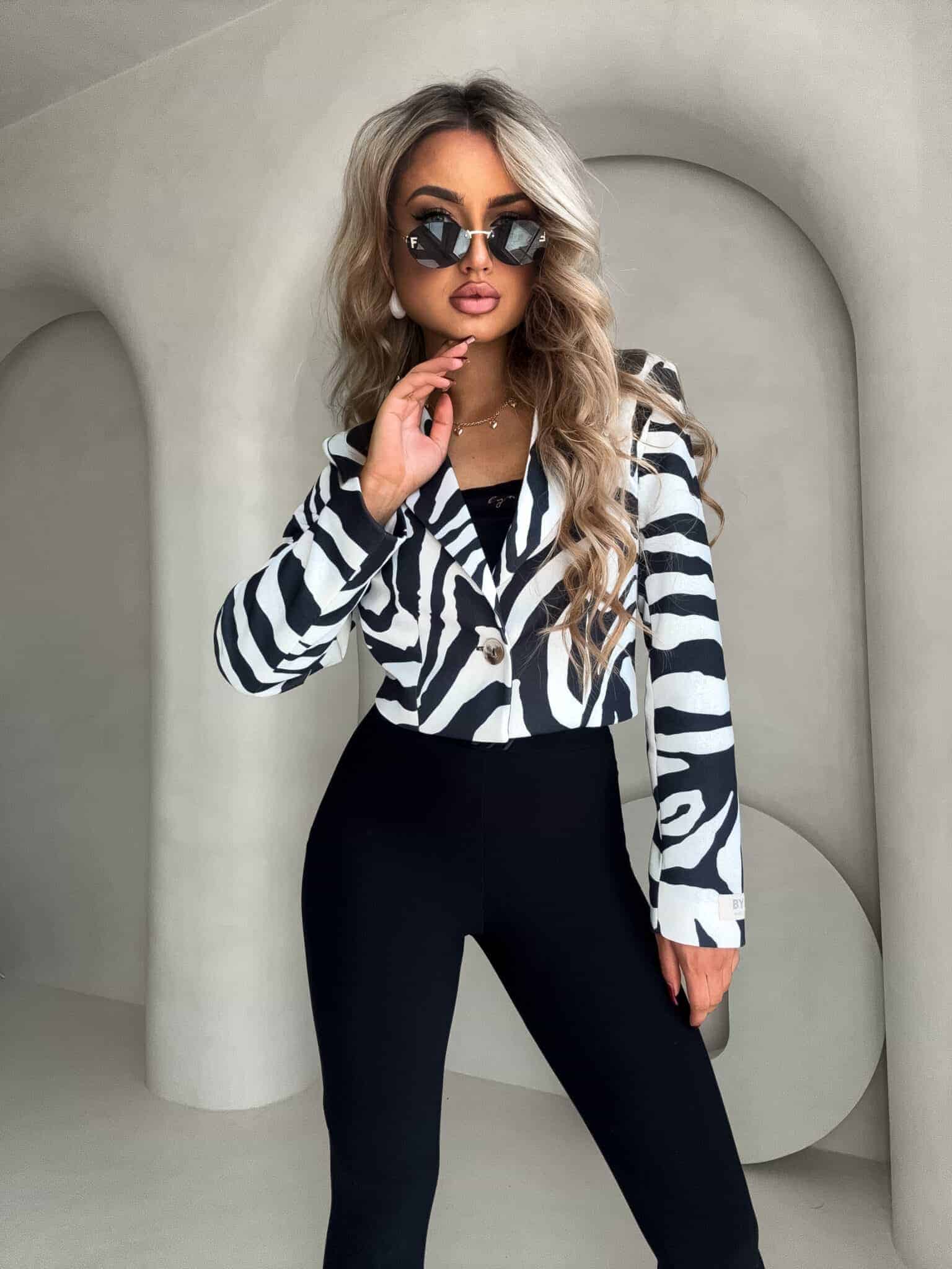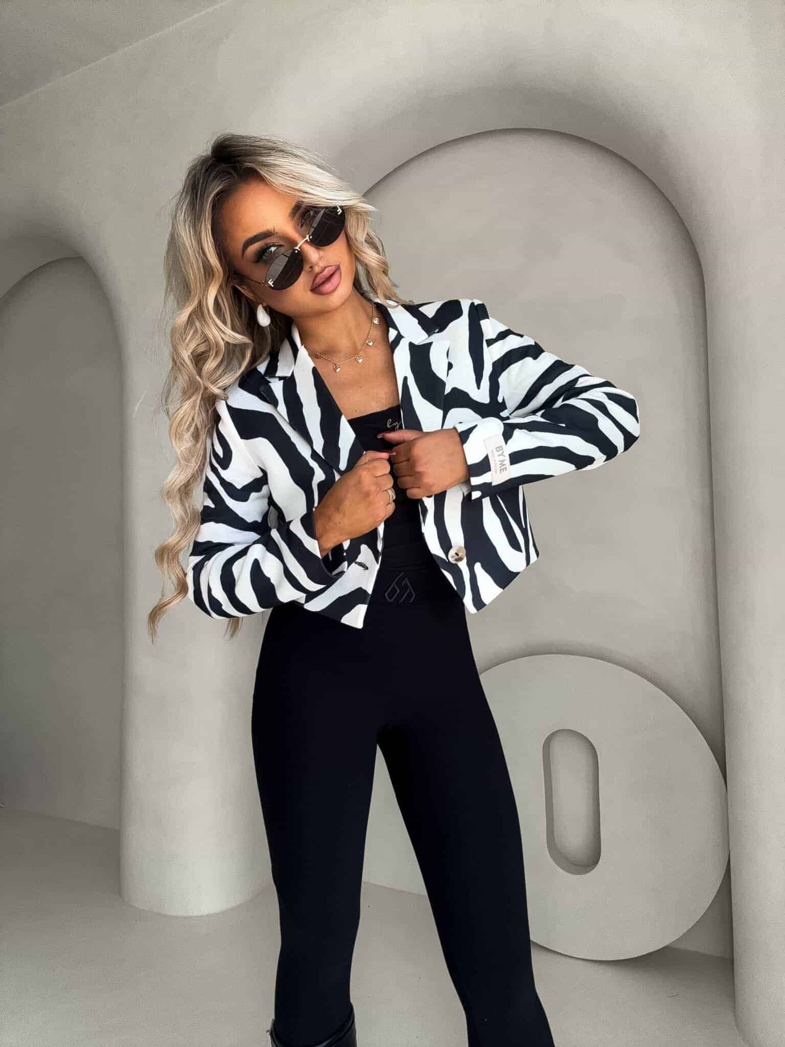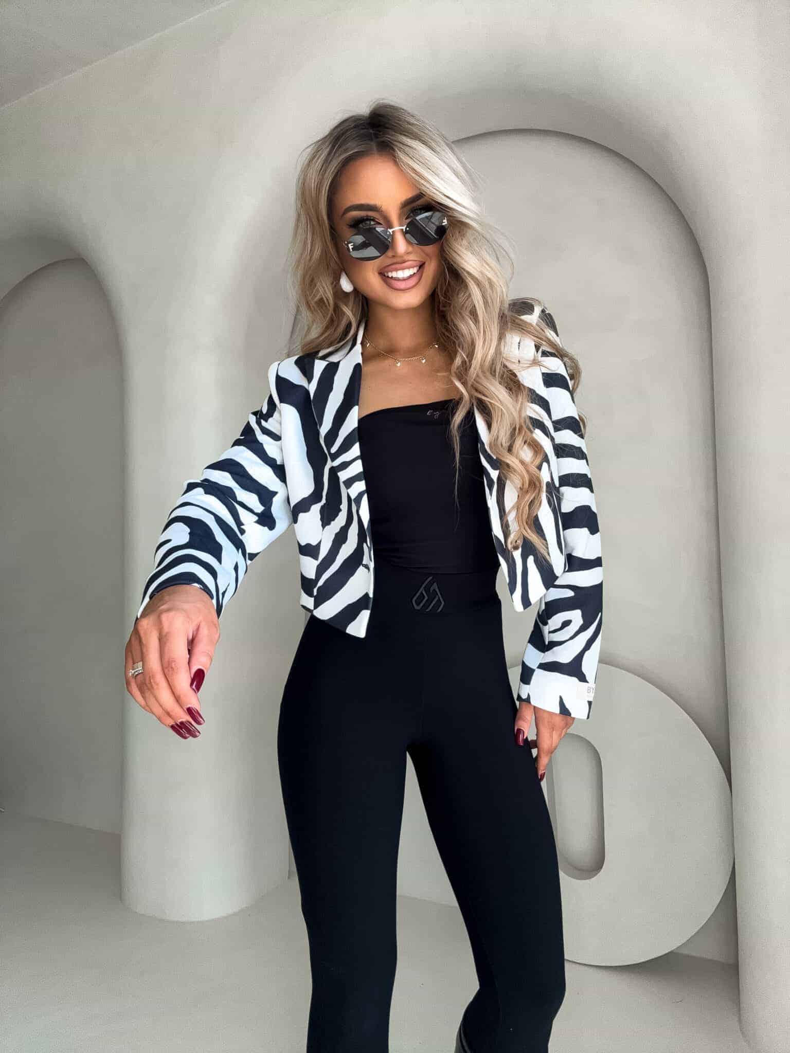 Marynarka o krótkim kroju, gładkie wykończenie. Marynarka posiada podszewkę, zapięcie regulowane przy pomocy guzika.