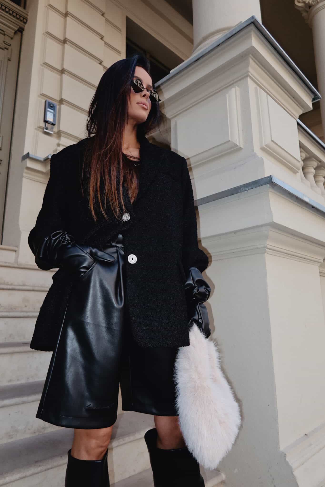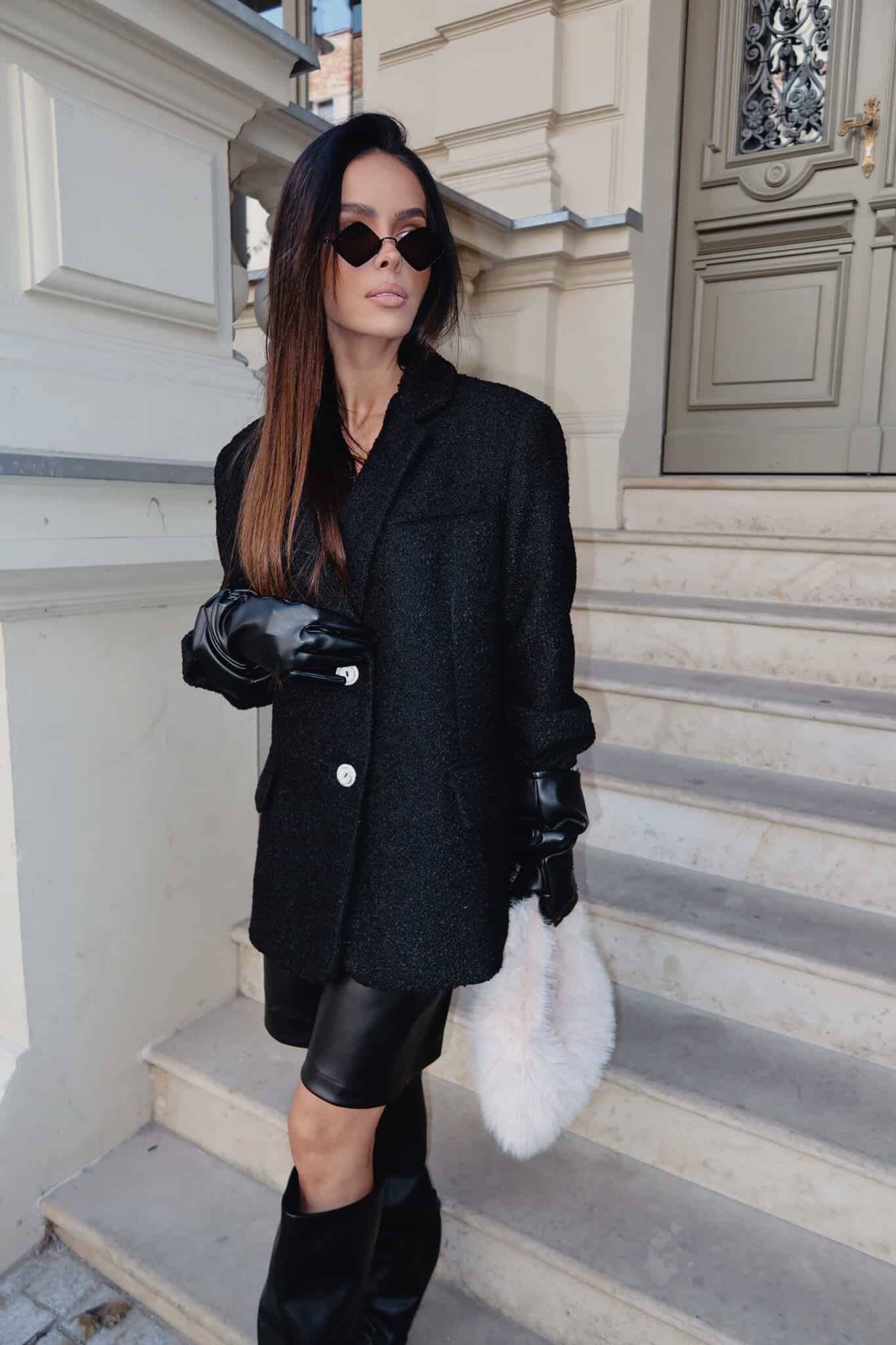 Marynarka o fakturze boucle z wyrazistą strukturą i dopracowanym krojem, który pozwala nosić ją jak lekki płaszcz. Miękka, ale trzymająca formę, z szerokimi klapami i ozdobnymi guzikami, sprawdzi się zarówno w eleganckich, jak i codziennych zestawieniach. Idealna do warstwowych stylizacji – narzucona na koszulę, sweter czy nawet cienką kurtkę. Stylowa alternatywa dla klasycznego okrycia wierzchniego.Skład: 100% poliester