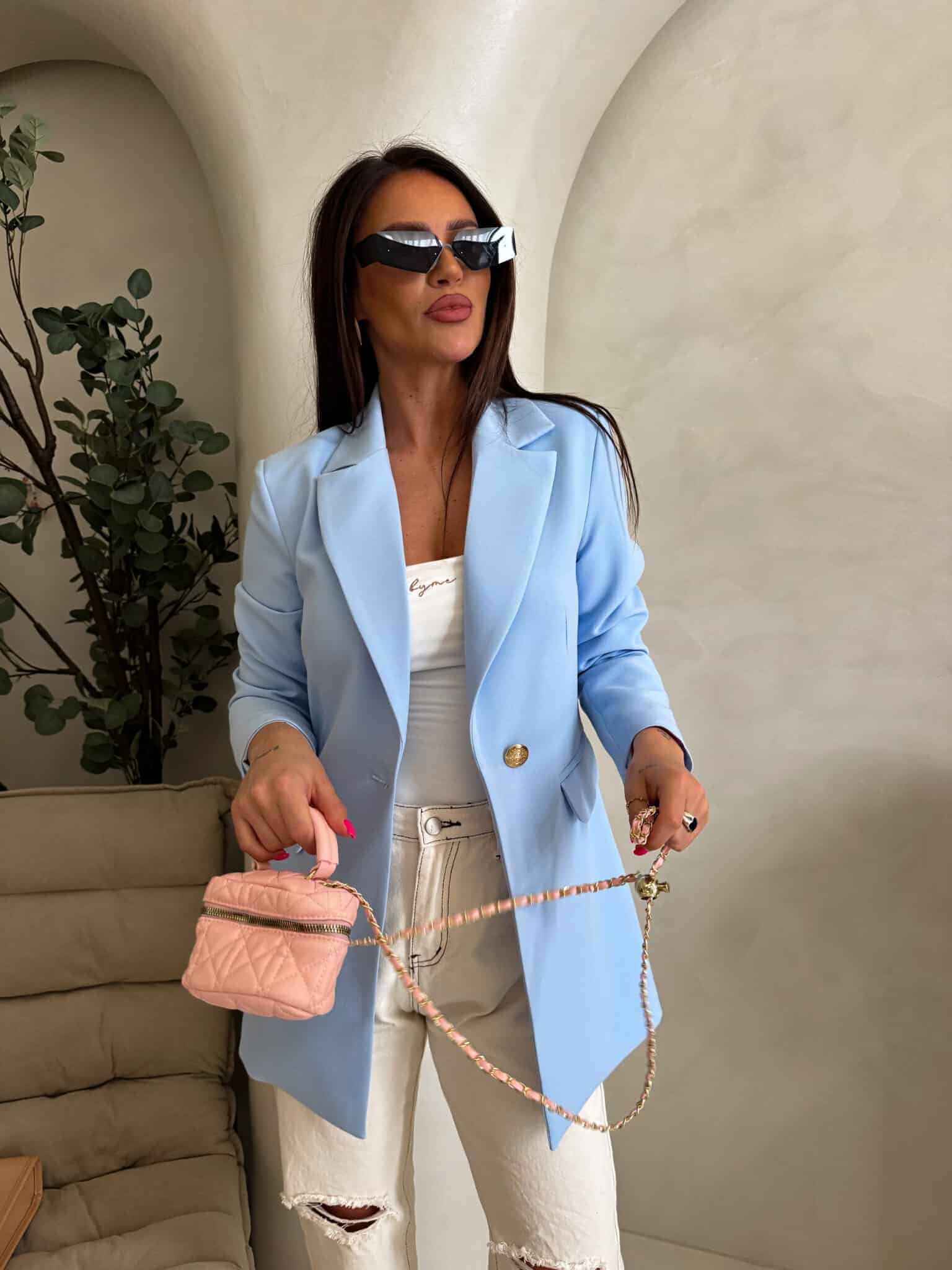 Marynarka o klasycznym, eleganckim fasonie. Jest delikatnie dopasowana w talii, dzięki czemu subtelnie podkreśla sylwetkę. Posiada jednorzędowe zapięcie na jeden guzik oraz klasyczne klapy o średniej szerokości. Po bokach znajdują się dwie kieszenie z patkami. Długość marynarki sięga poniżej bioder, co zapewnia eleganckie proporcje. Długie rękawy mają prosty krój.