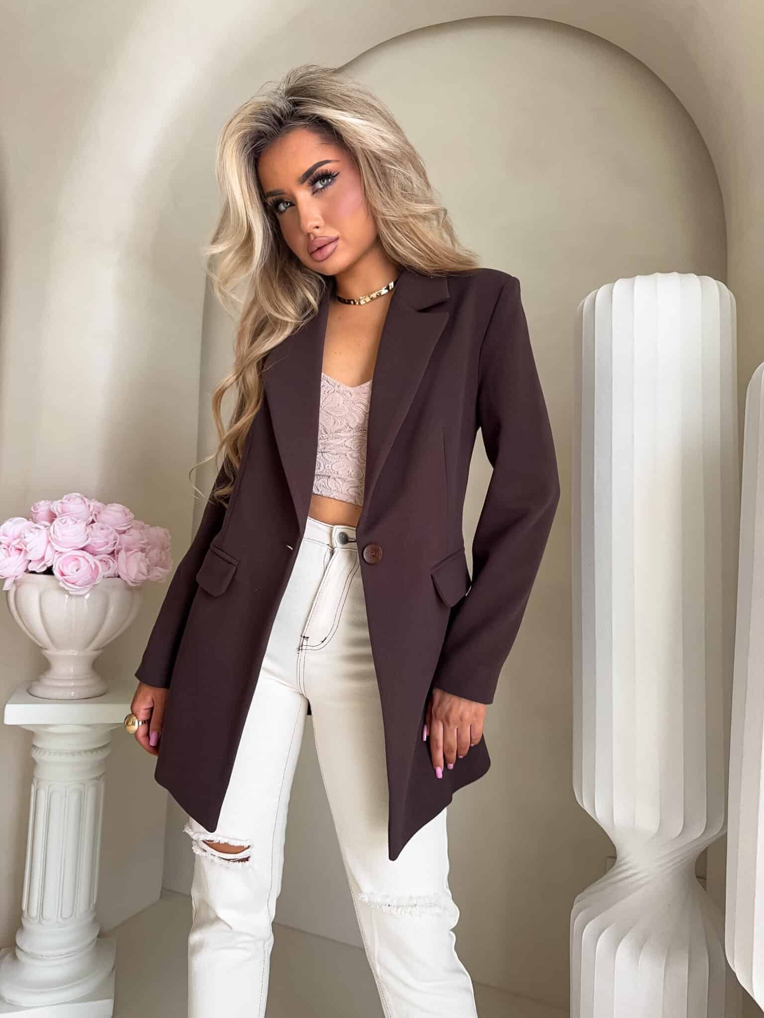 Marynarka o klasycznym, eleganckim fasonie. Jest delikatnie dopasowana w talii, dzięki czemu subtelnie podkreśla sylwetkę. Posiada jednorzędowe zapięcie na jeden guzik oraz klasyczne klapy o średniej szerokości. Po bokach znajdują się dwie kieszenie z patkami. Długość marynarki sięga poniżej bioder, co zapewnia eleganckie proporcje. Długie rękawy mają prosty krój.