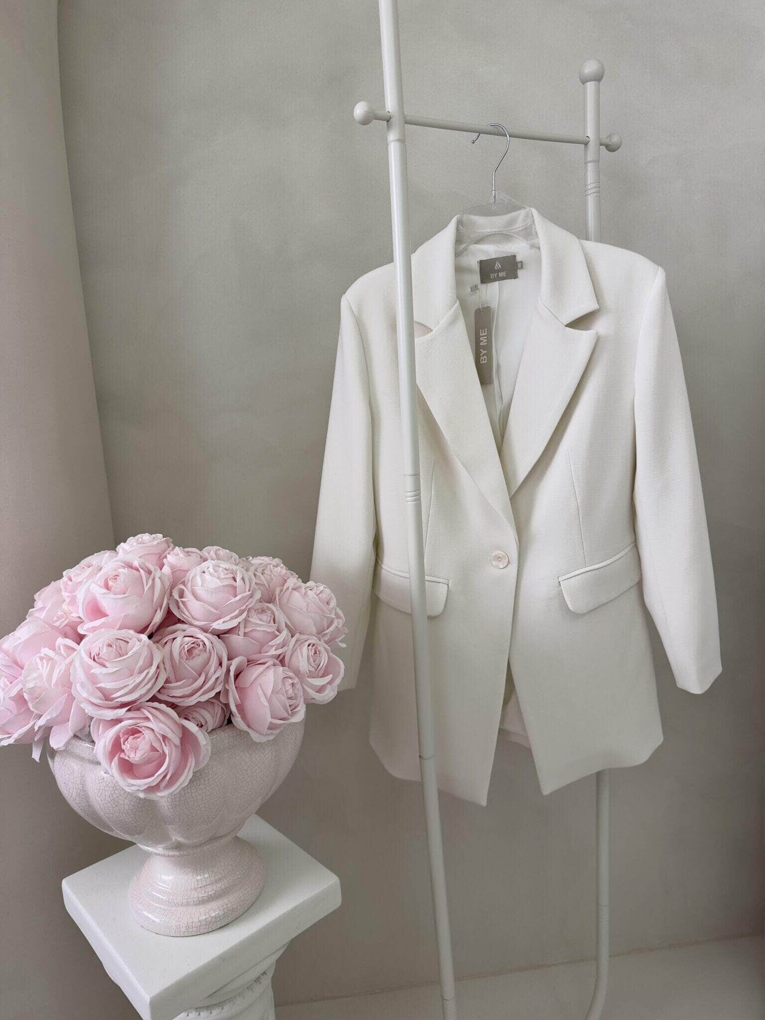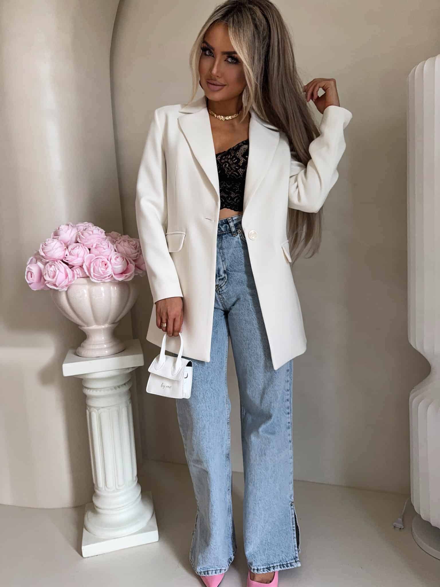 Marynarka o klasycznym, eleganckim fasonie. Jest delikatnie dopasowana w talii, dzięki czemu subtelnie podkreśla sylwetkę. Posiada jednorzędowe zapięcie na jeden guzik oraz klasyczne klapy o średniej szerokości. Po bokach znajdują się dwie kieszenie z patkami. Długość marynarki sięga poniżej bioder, co zapewnia eleganckie proporcje. Długie rękawy mają prosty krój.