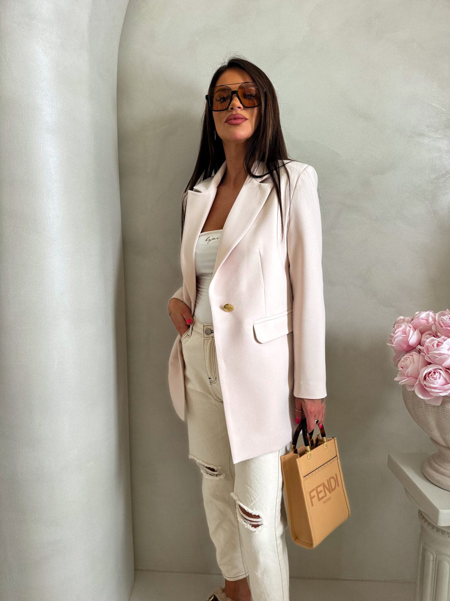 Marynarka o klasycznym, eleganckim fasonie. Jest delikatnie dopasowana w talii, dzięki czemu subtelnie podkreśla sylwetkę. Posiada jednorzędowe zapięcie na jeden guzik oraz klasyczne klapy o średniej szerokości. Po bokach znajdują się dwie kieszenie z patkami. Długość marynarki sięga poniżej bioder, co zapewnia eleganckie proporcje. Długie rękawy mają prosty krój.