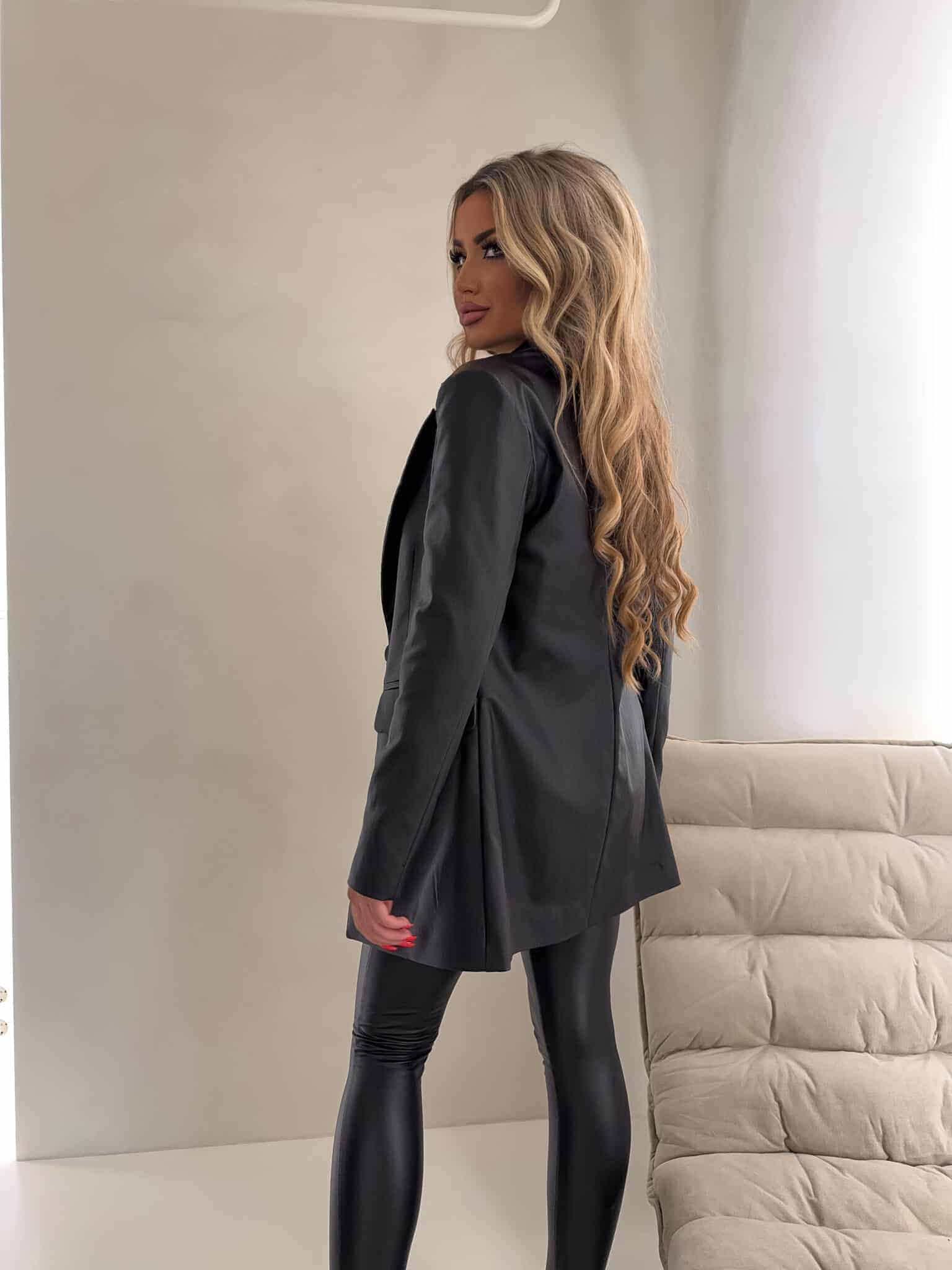 Marynarka o klasycznym, eleganckim fasonie. Jest delikatnie dopasowana w talii, dzięki czemu subtelnie podkreśla sylwetkę. Posiada jednorzędowe zapięcie na jeden guzik oraz klasyczne klapy o średniej szerokości. Po bokach znajdują się dwie kieszenie z patkami. Długość marynarki sięga poniżej bioder, co zapewnia eleganckie proporcje. Długie rękawy mają prosty krój.