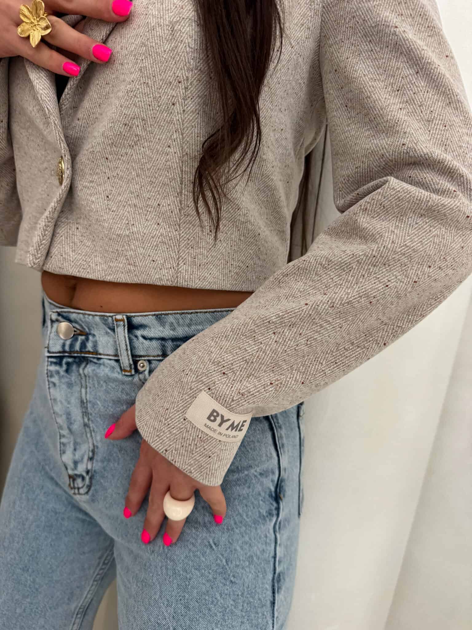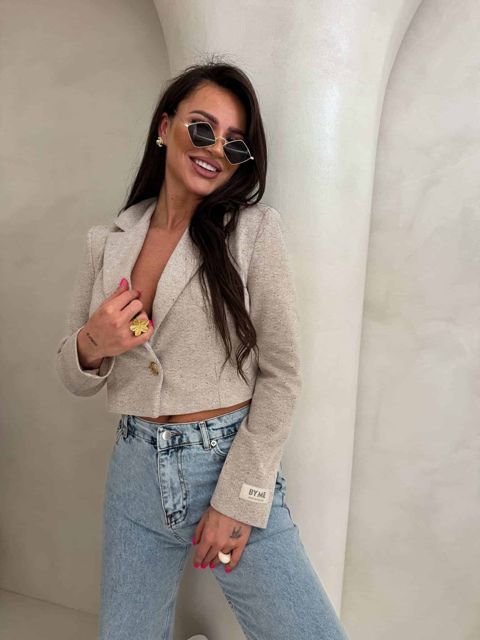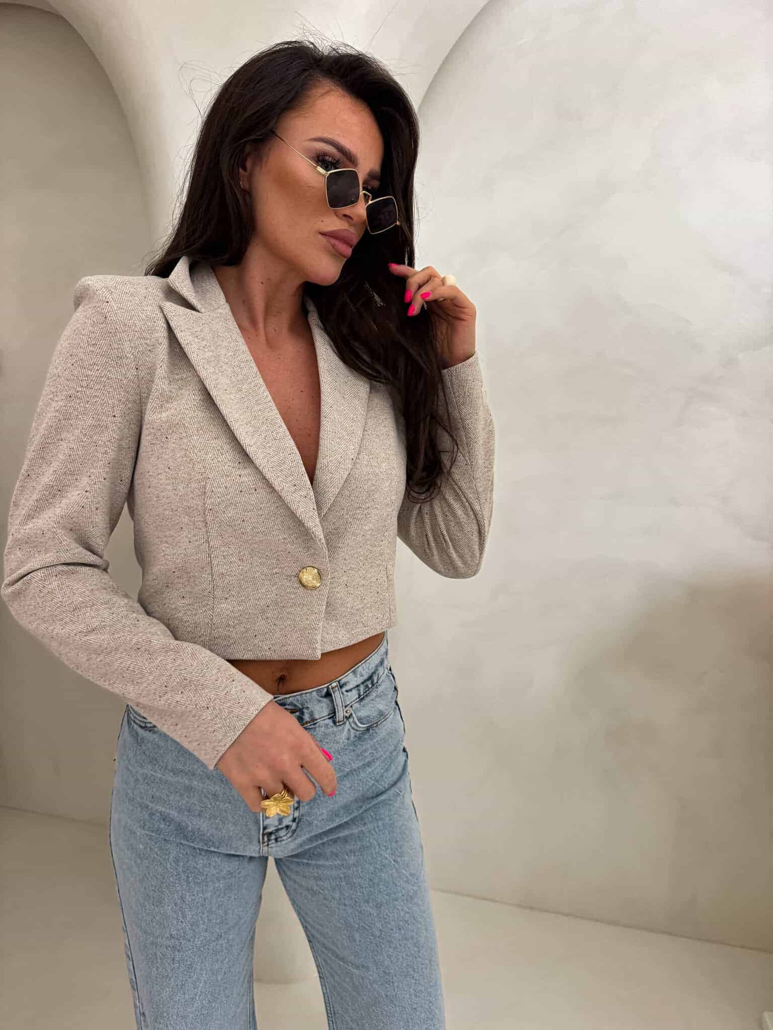 Marynarka o krótkim kroju, gładkie wykończenie. Marynarka posiada podszewkę, zapięcie regulowane przy pomocy guzika.