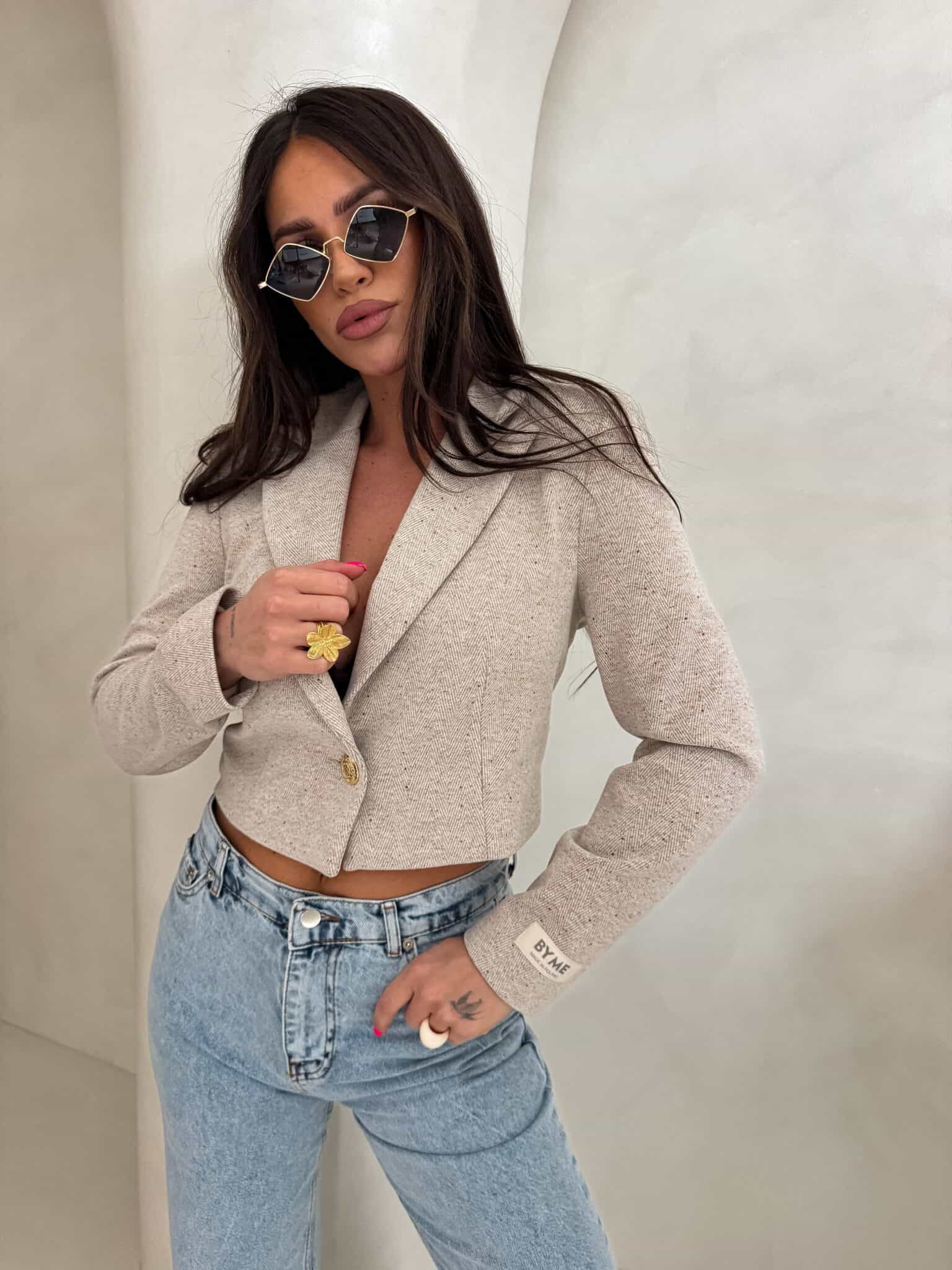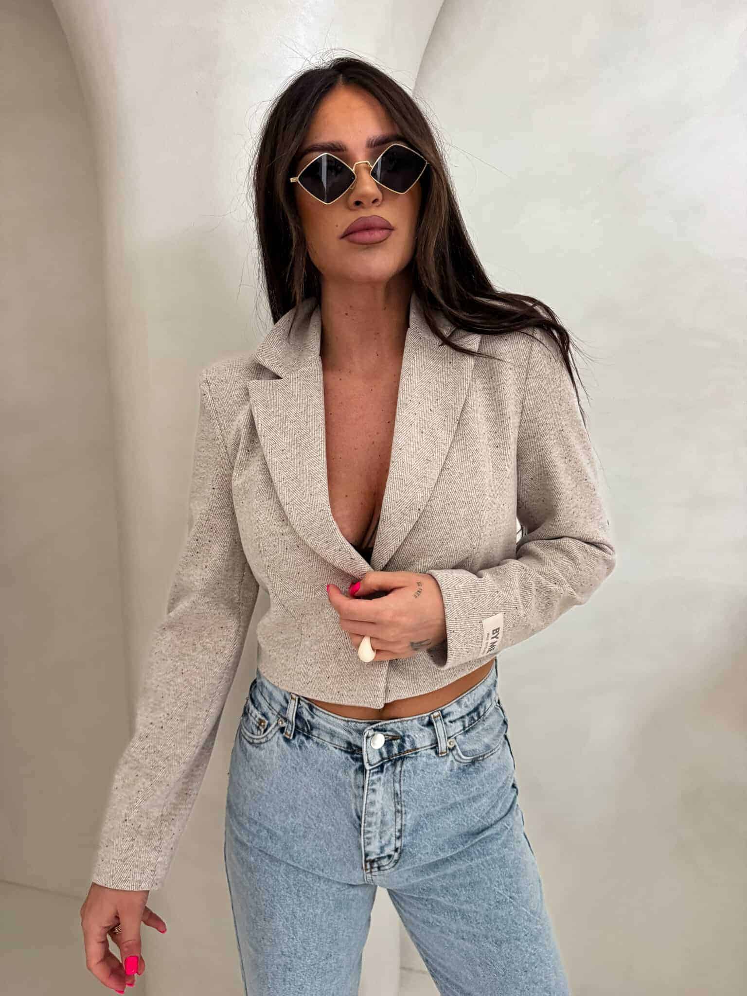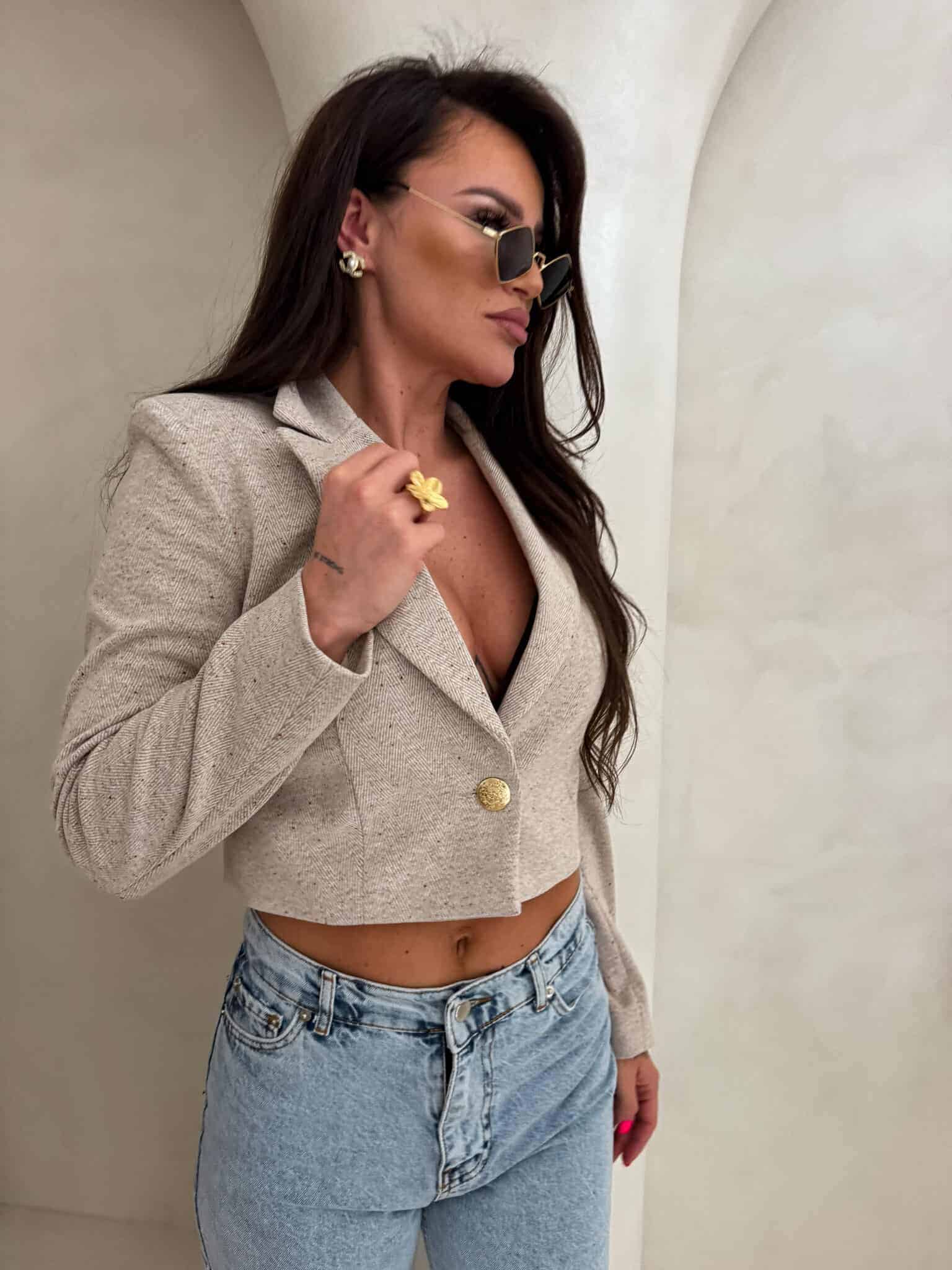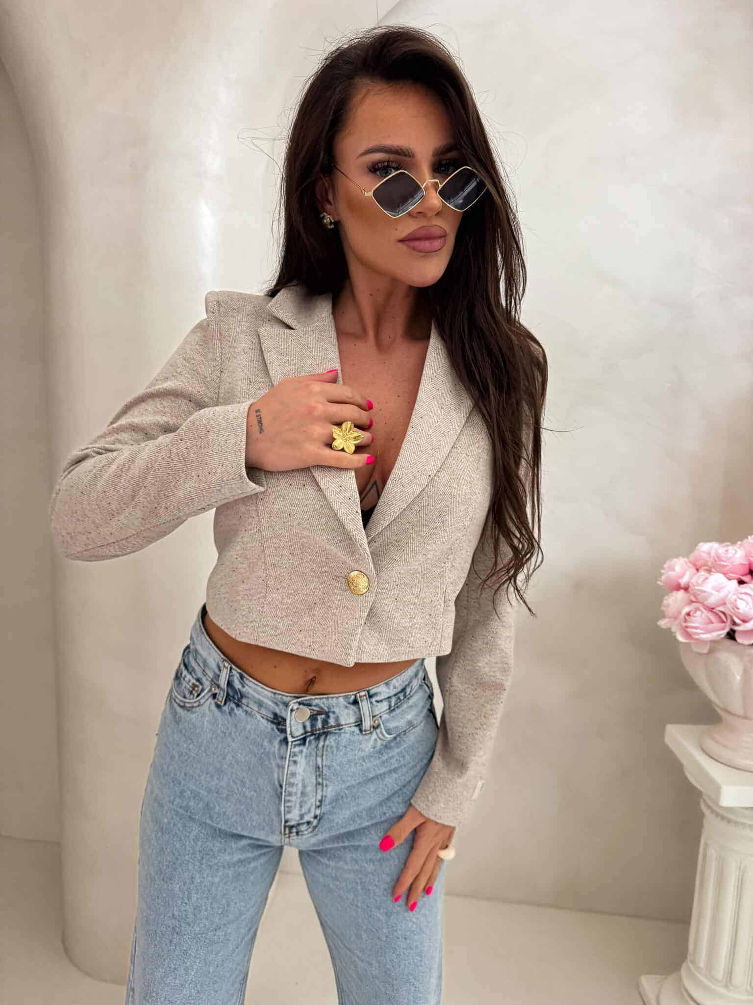 Marynarka o krótkim kroju, gładkie wykończenie. Marynarka posiada podszewkę, zapięcie regulowane przy pomocy guzika.