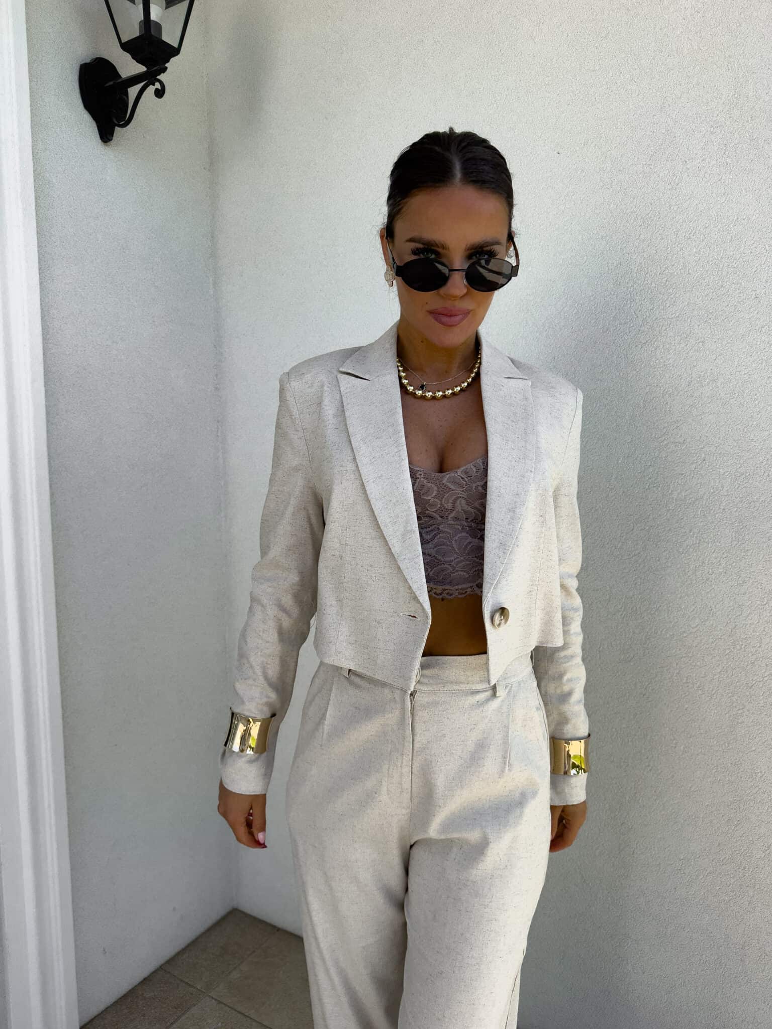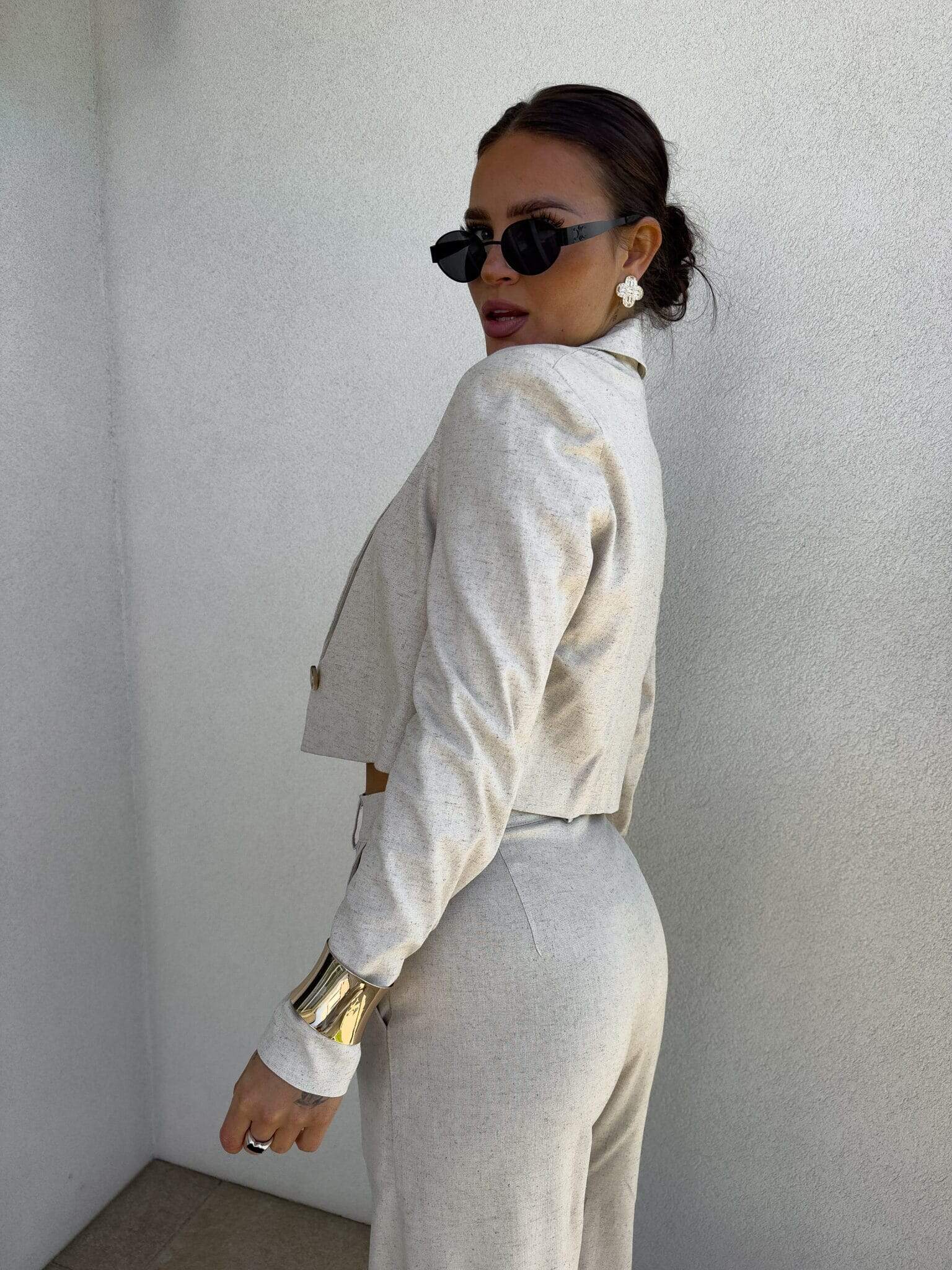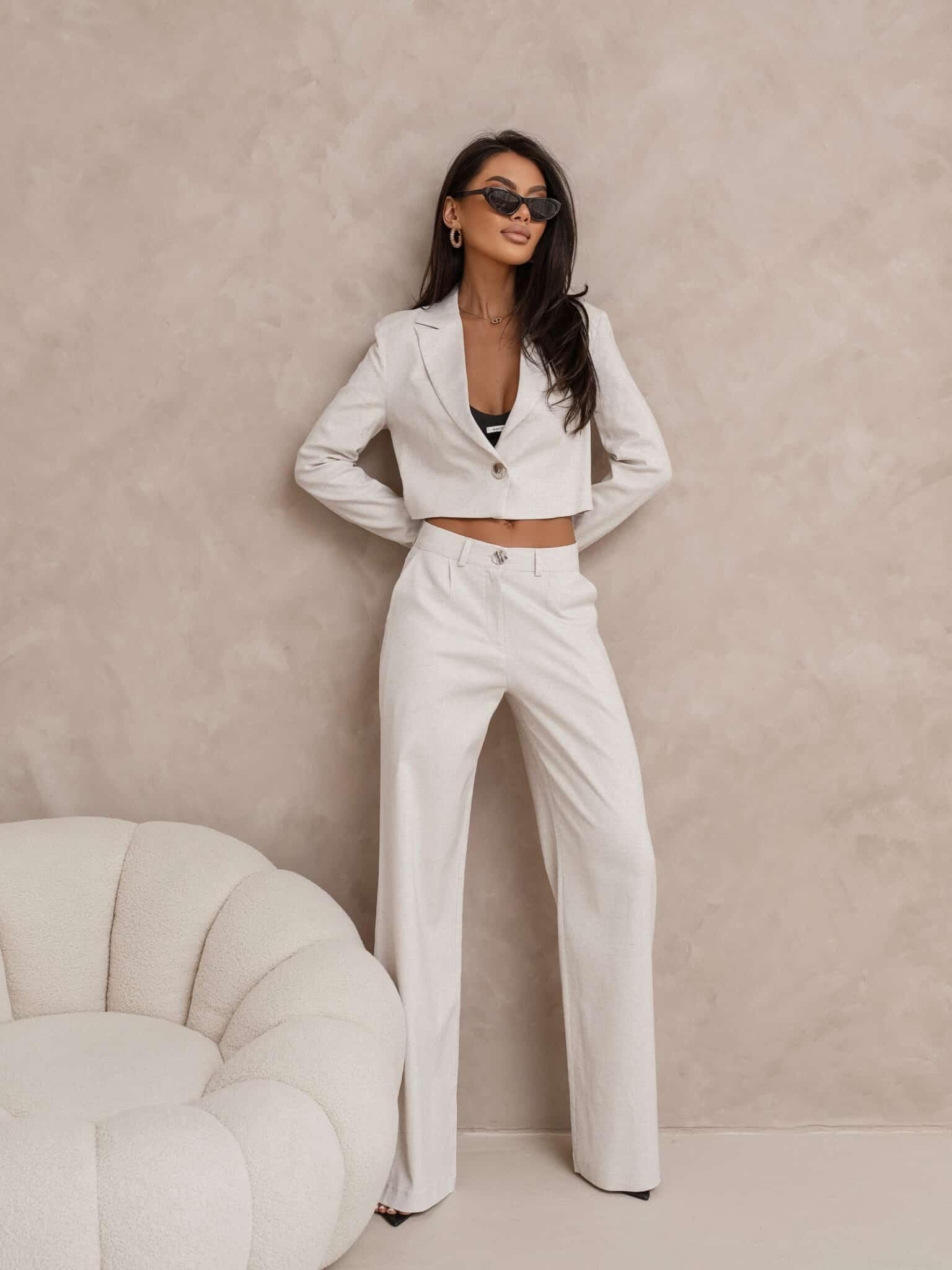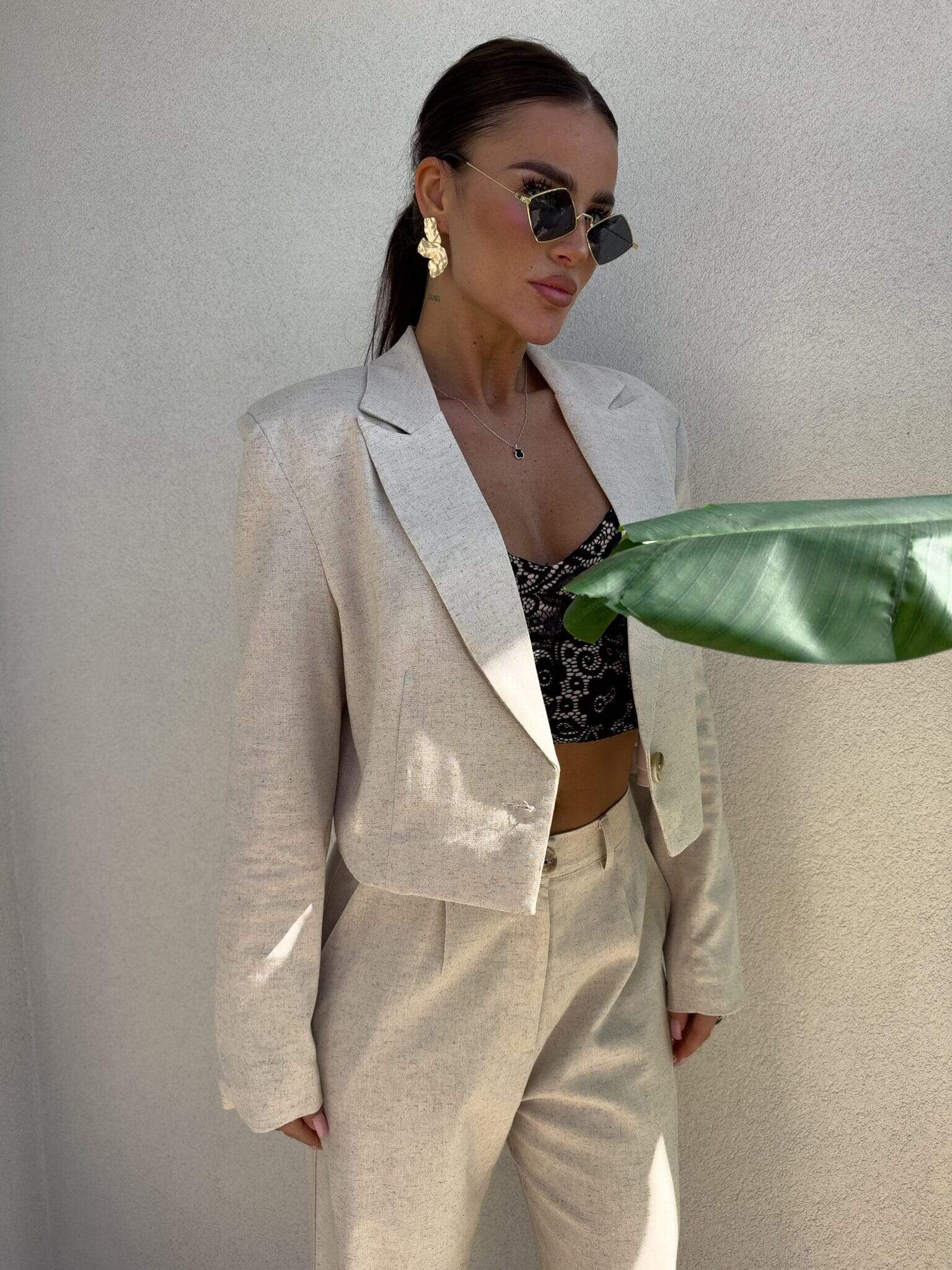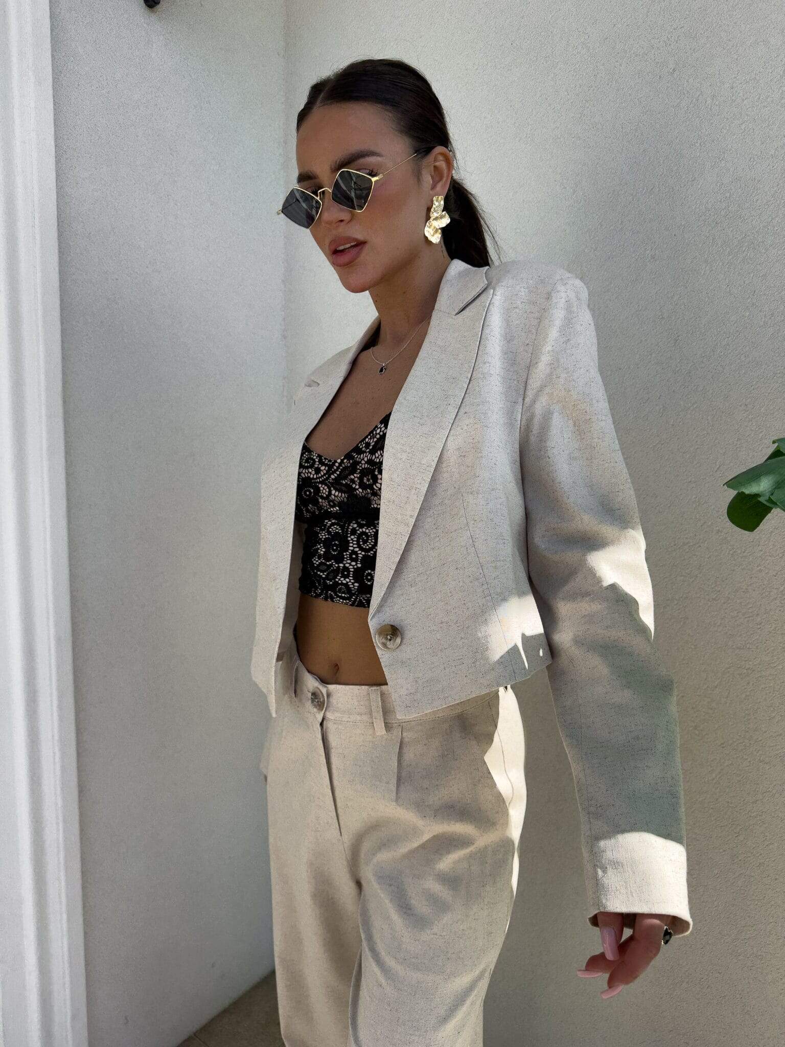 Marynarka o krótkim kroju, gładkie wykończenie. Marynarka posiada podszewkę, zapięcie regulowane przy pomocy guzika.