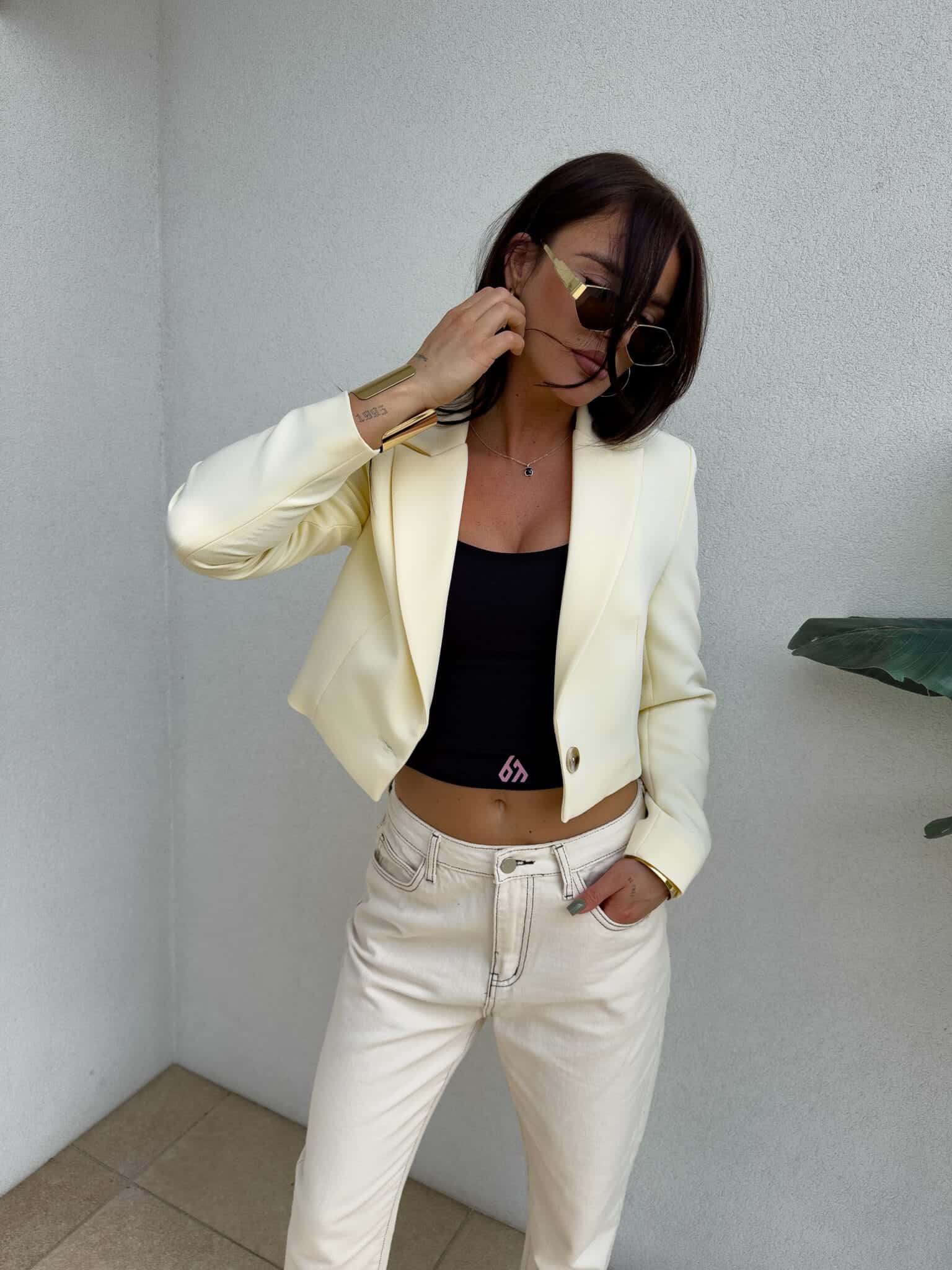 Marynarka o krótkim kroju, gładkie wykończenie. Marynarka posiada podszewkę, zapięcie regulowane przy pomocy guzika.