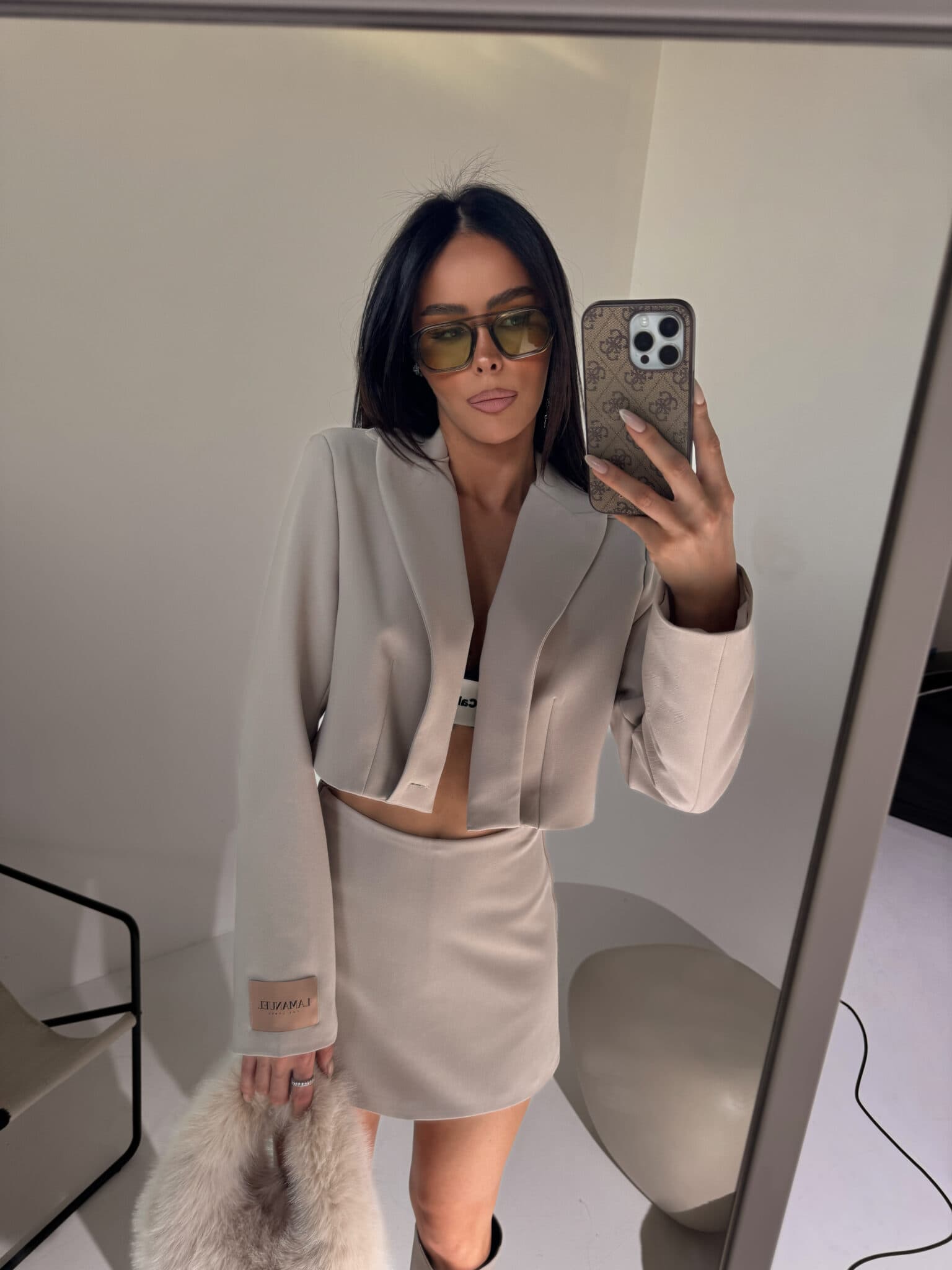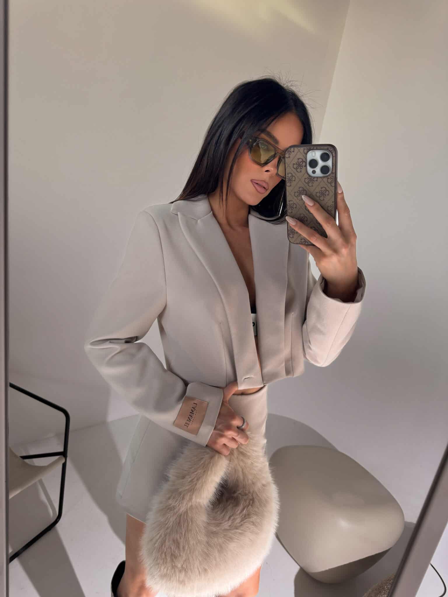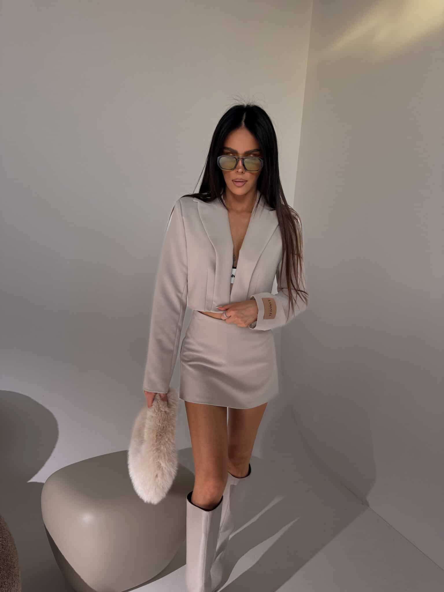 Krótka marynarka o nowoczesnym, pudełkowym kroju. Posiada głęboki dekolt, klasyczny kołnierz oraz długie rękawy zakończone metką z logo. Idealny do stylizacji wieczorowych i codziennych. Świetnie prezentuje się zarówno solo, jak i w komplecie z szortami.Skład: 80% poliester 15% rayon 5% spandex