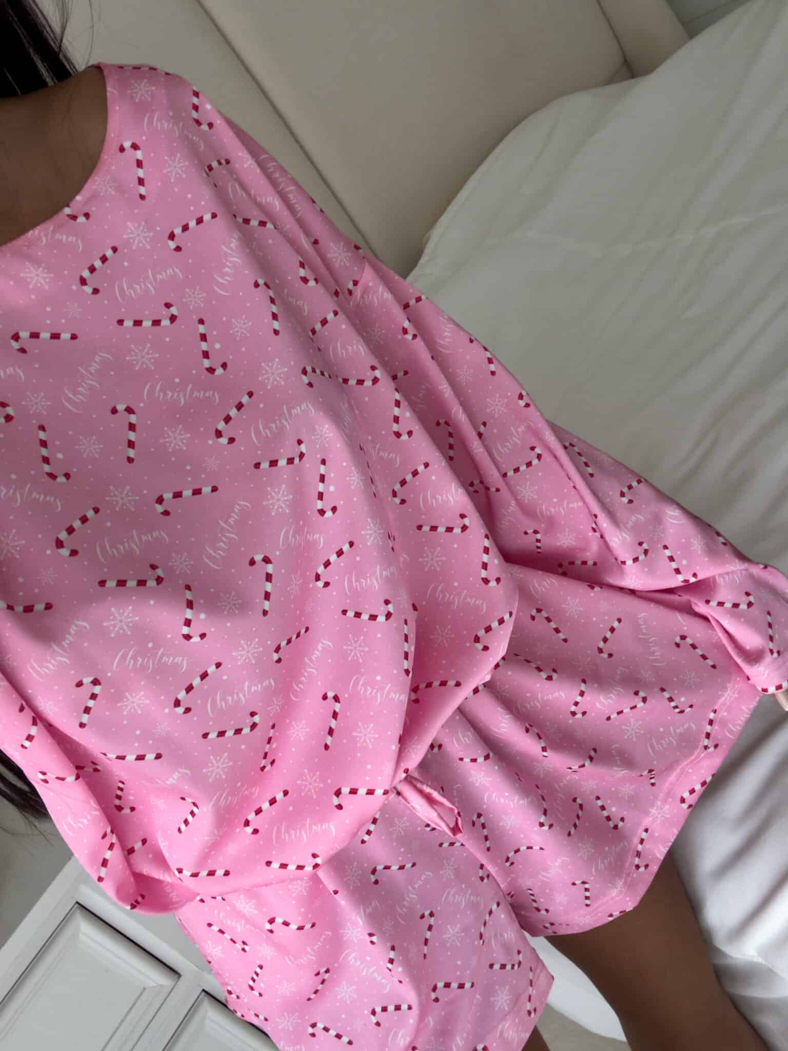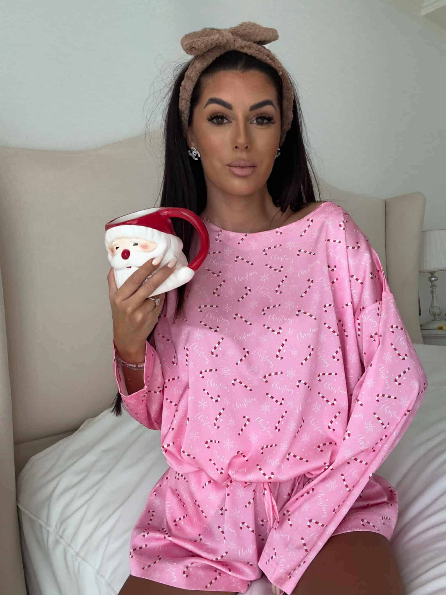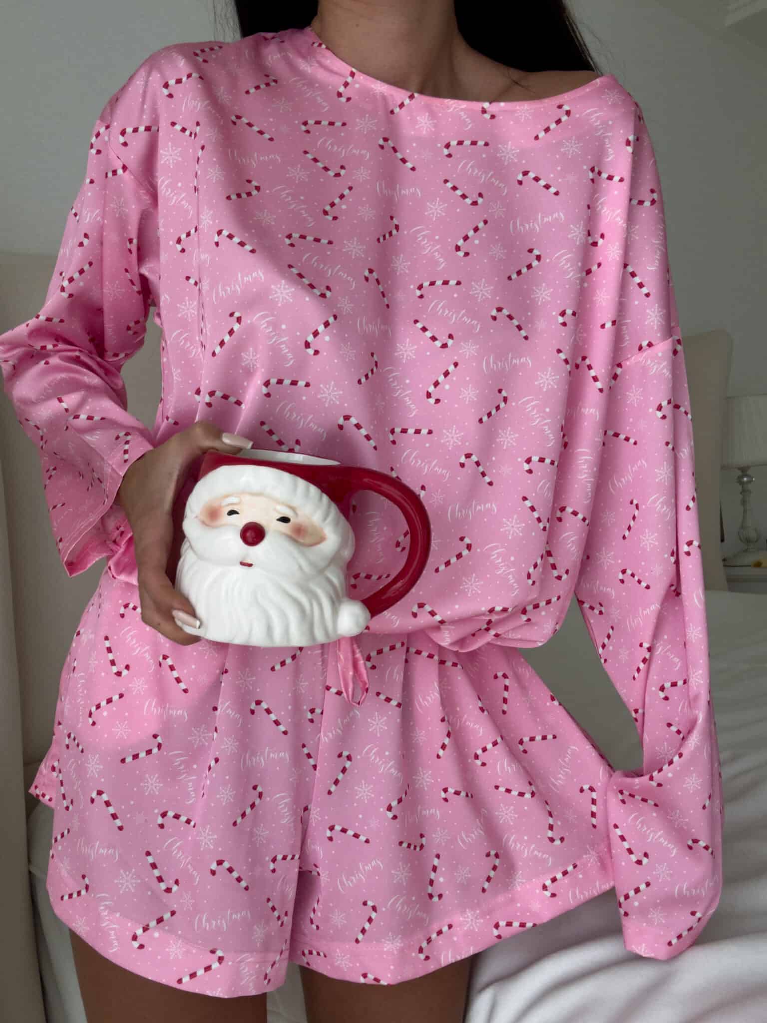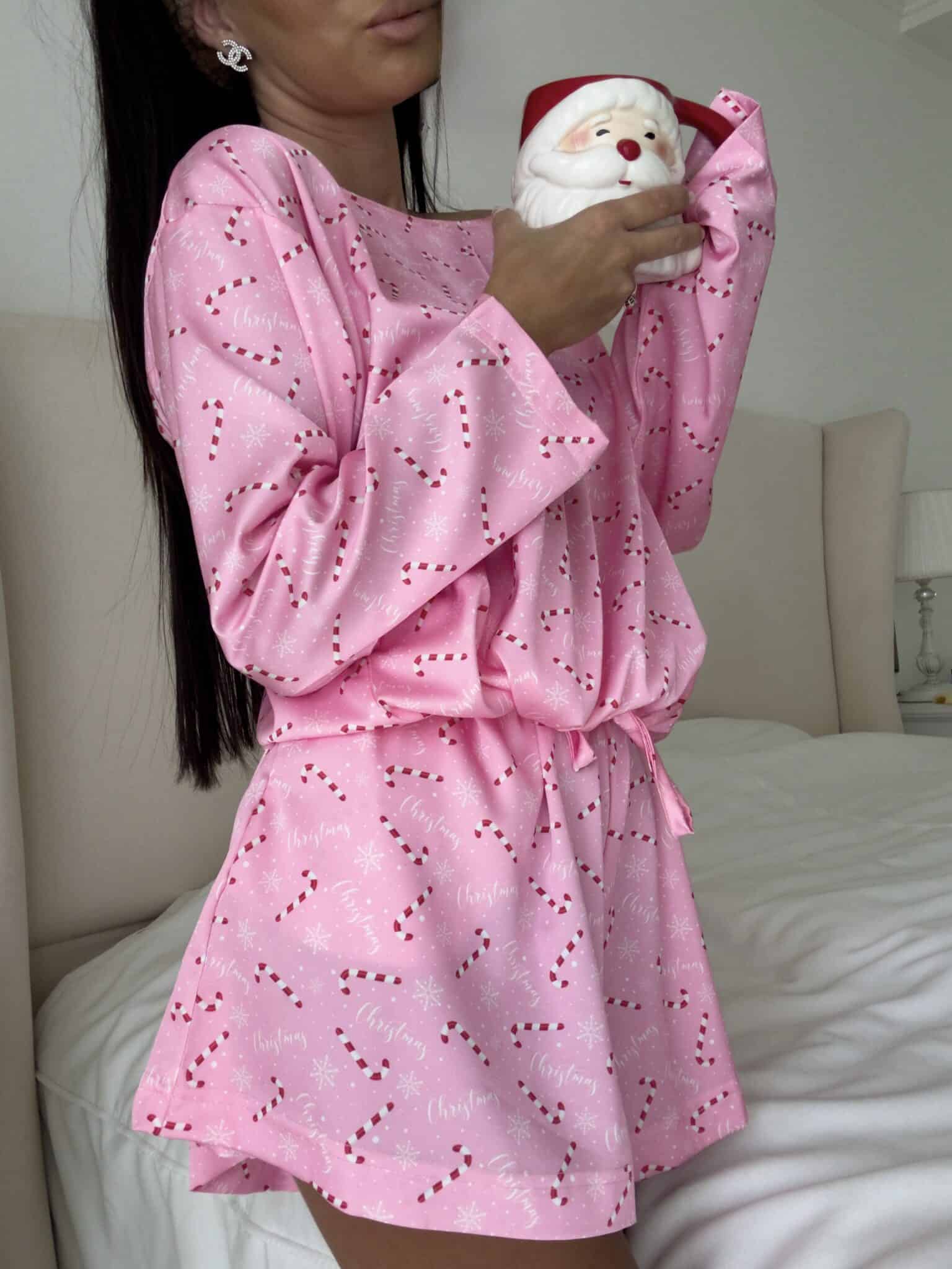 Satynowa piżamka świąteczna – bluzka wkładana przez głowę, może być wiązana na dole i krótkie szorty z gumką w pasie z kieszonkami po bokach. Całość zdobi uroczy, świąteczny wzór – idealny, by poczuć magię zimowych wieczorów. To doskonały wybór na prezent lub jako wyjątkowy element własnej nocnej garderoby.