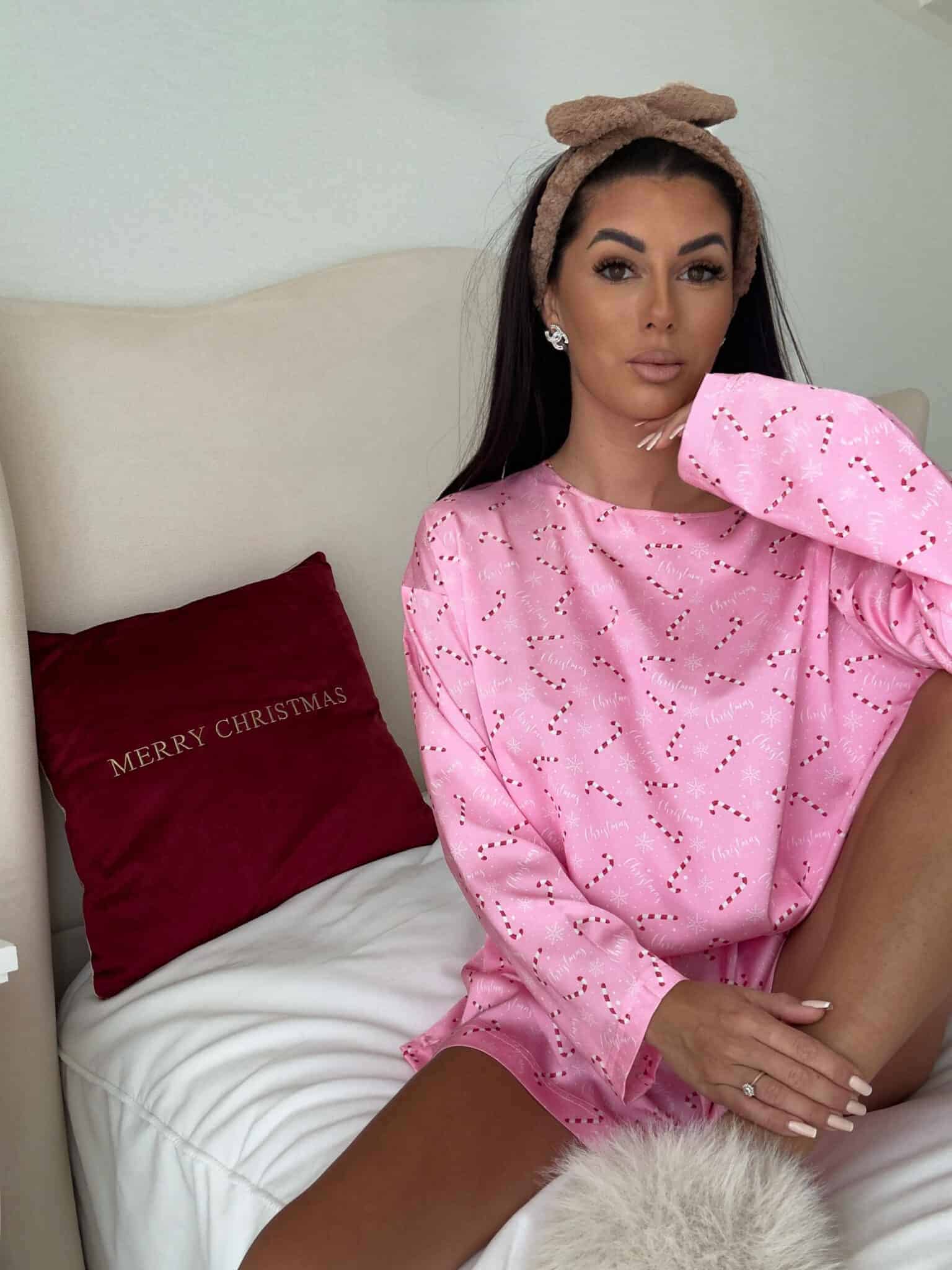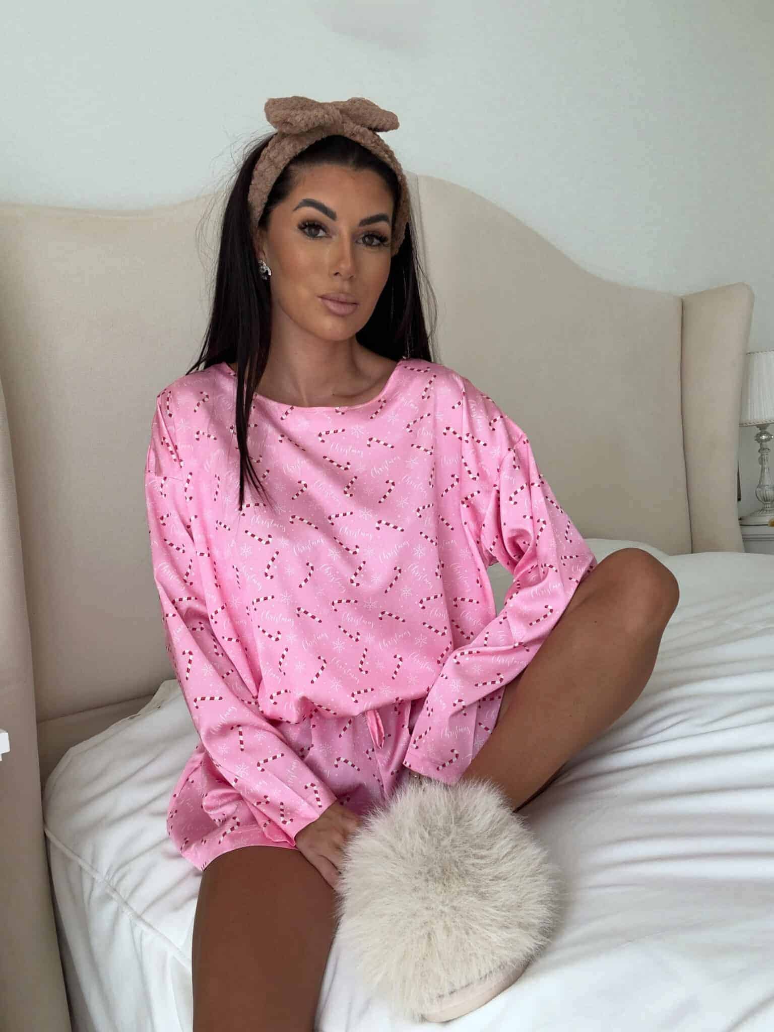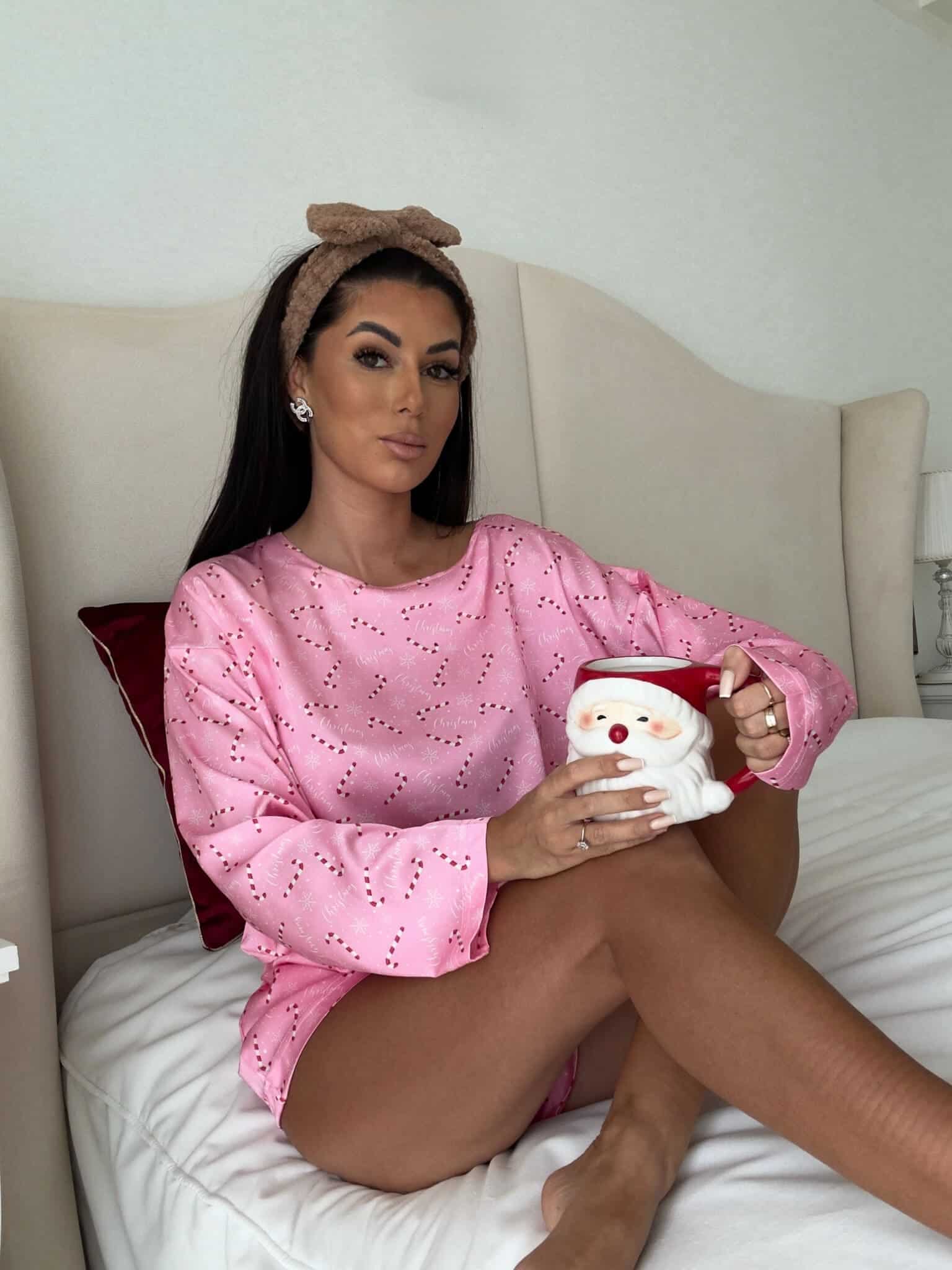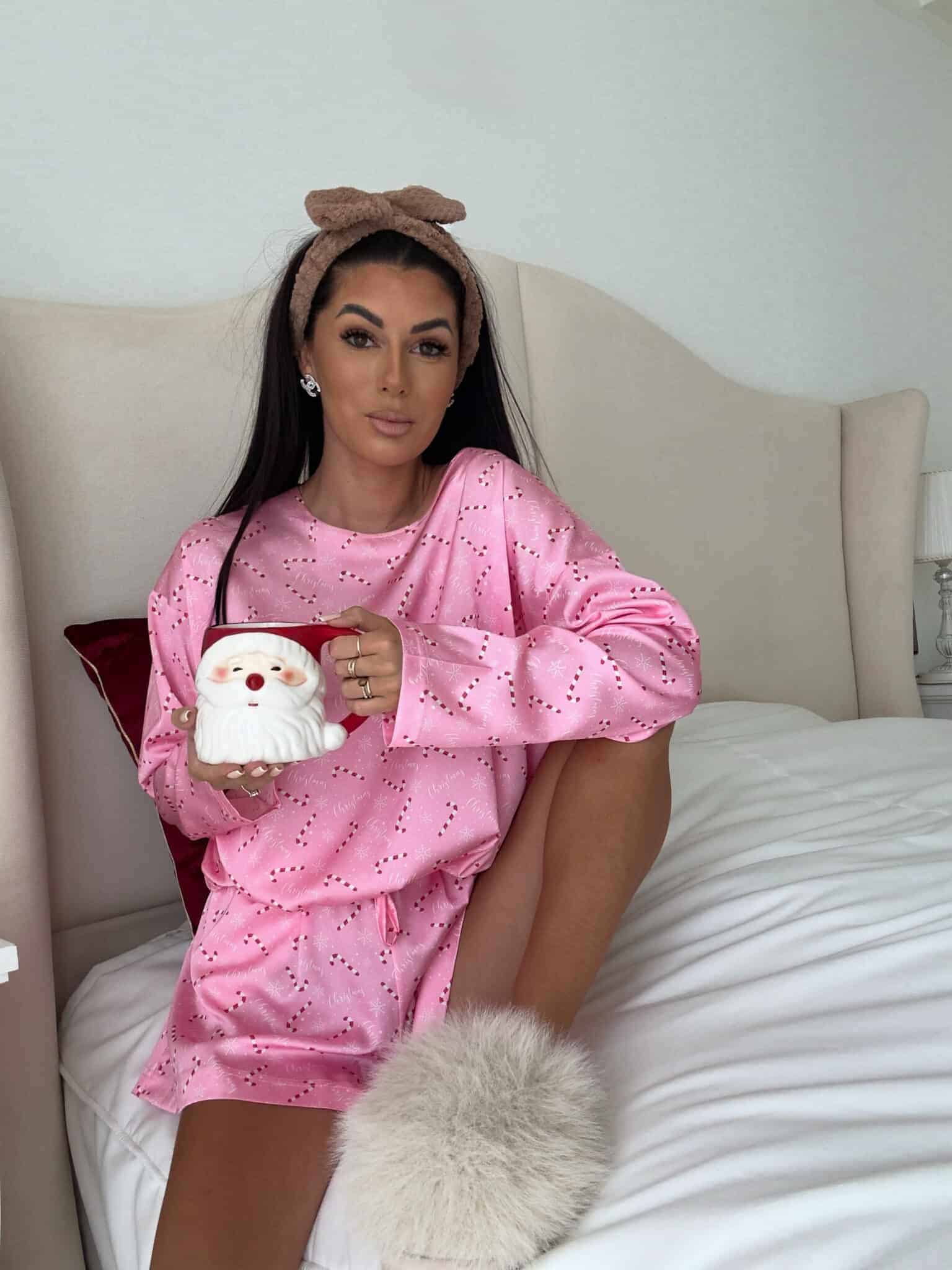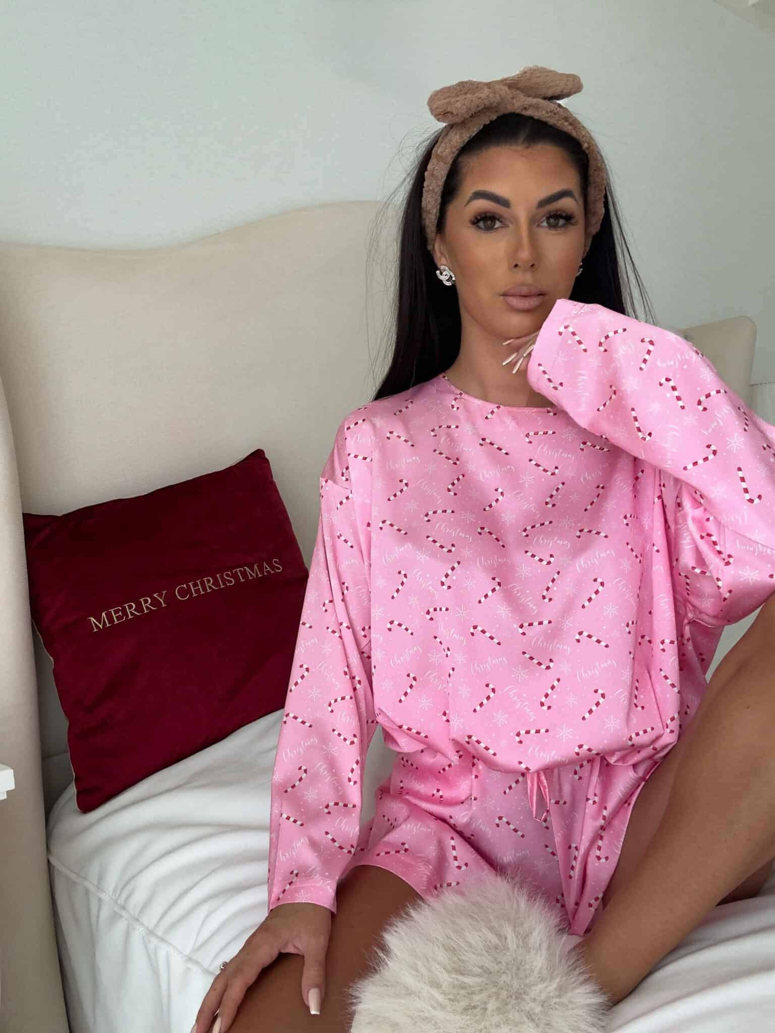 Satynowa piżamka świąteczna – bluzka wkładana przez głowę, może być wiązana na dole i krótkie szorty z gumką w pasie z kieszonkami po bokach. Całość zdobi uroczy, świąteczny wzór – idealny, by poczuć magię zimowych wieczorów. To doskonały wybór na prezent lub jako wyjątkowy element własnej nocnej garderoby.