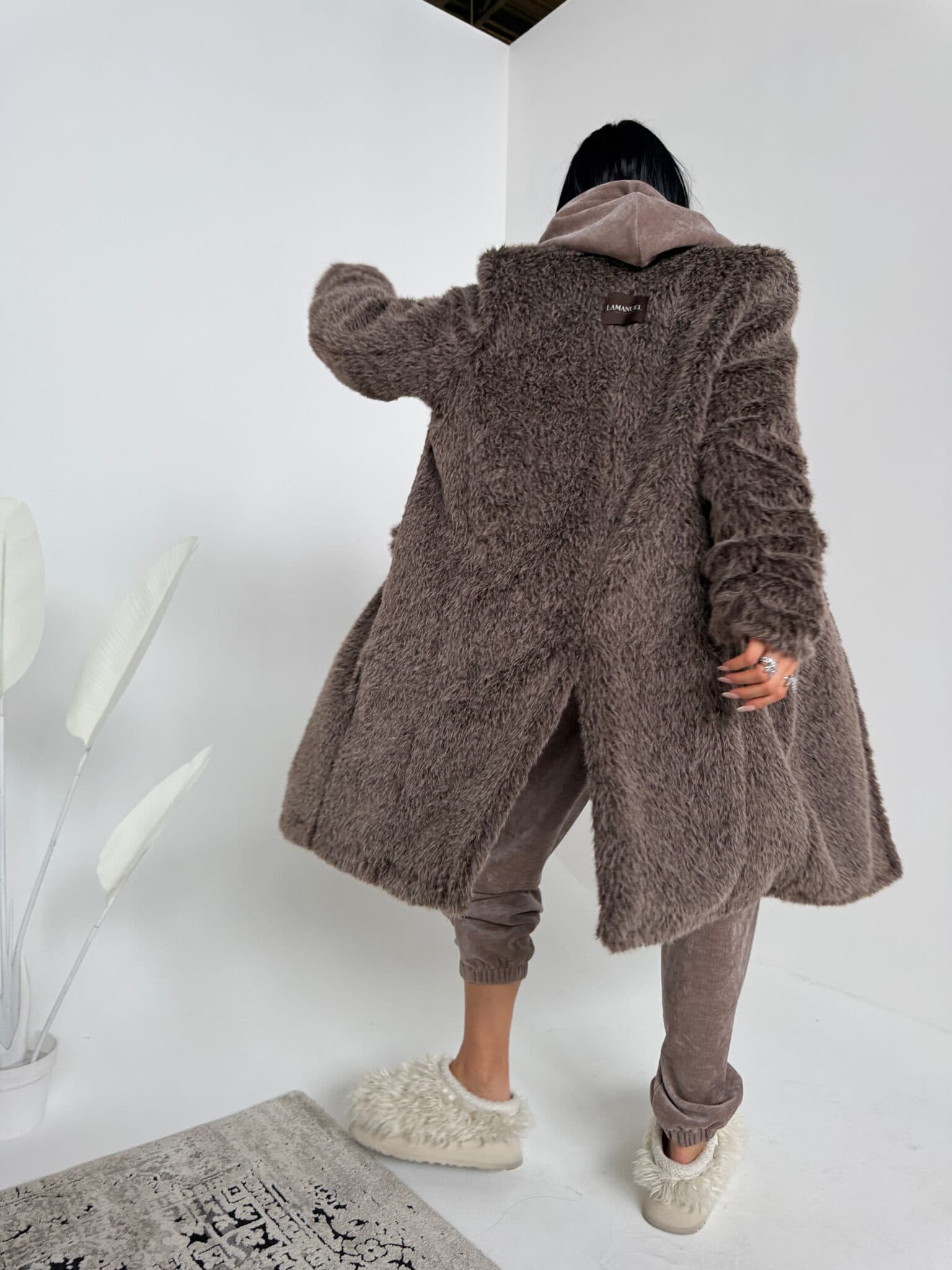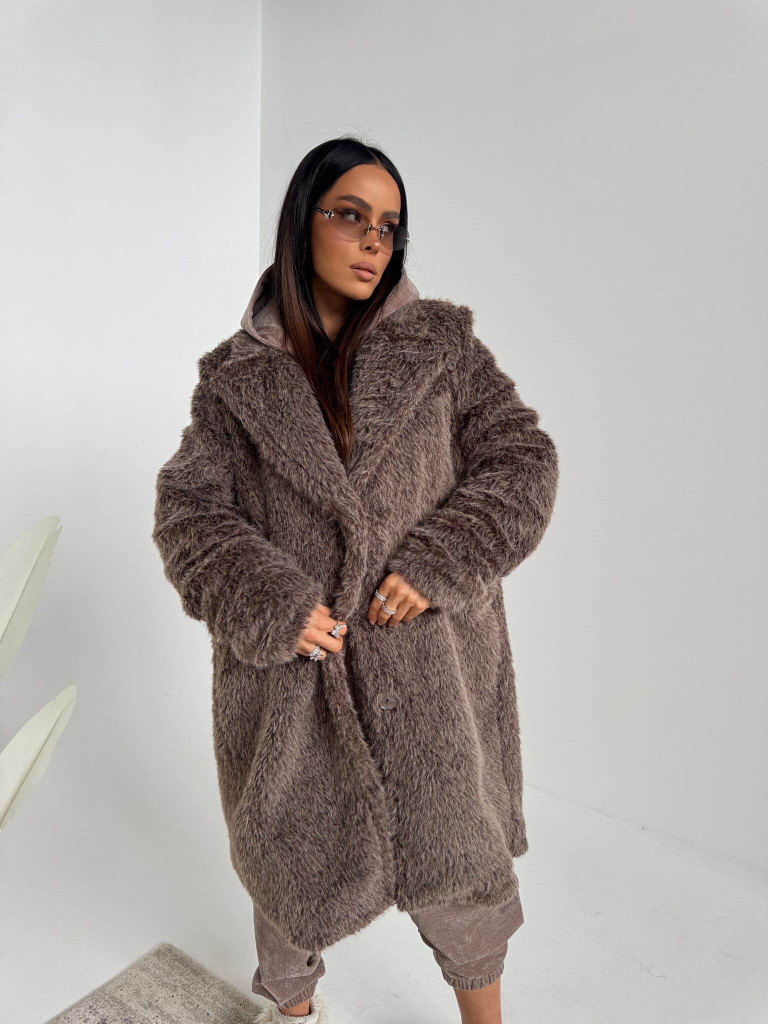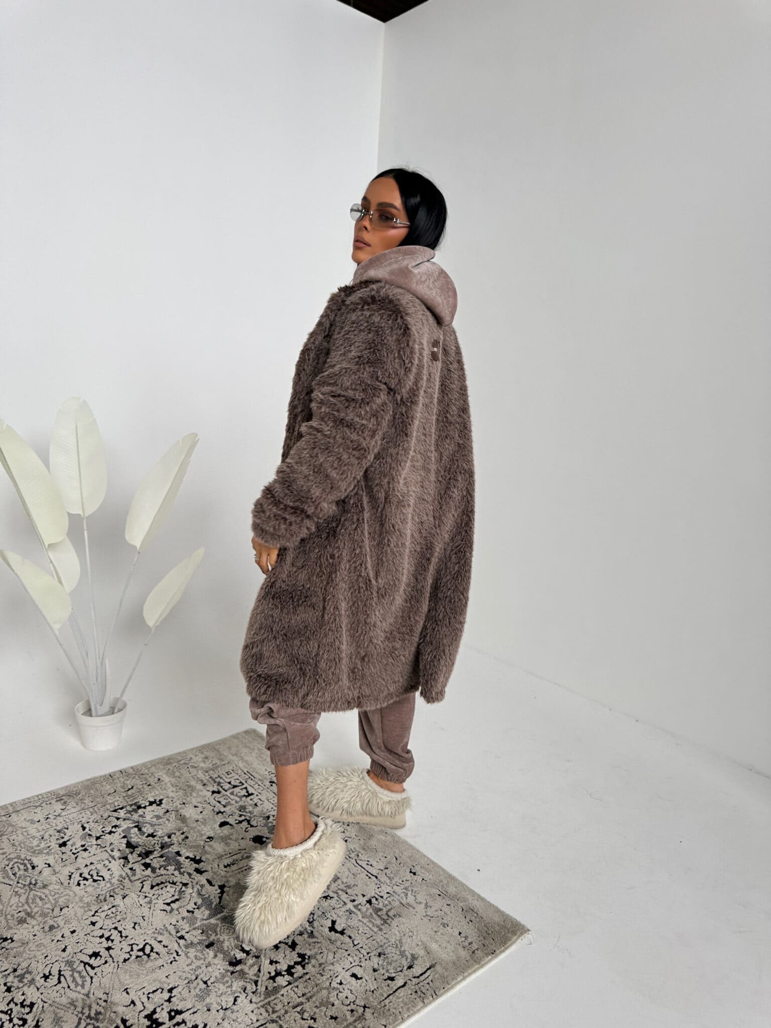 Ciepły, puszysty, spektakularny – ten płaszcz to zimowy statement piece, który łączy wygodę i styl na najwyższym poziomie. Wykonany z wyjątkowo mięsistego i miękkiego materiału typu miś, który od razu otula jak ciepły koc. Długość do kolan, luźny krój i podkreślone ramiona nadają mu modowego charakteru, a detal w postaci naszywki z logo z tyłu dodaje streetowego sznytu. Posiada umarszczone rękawy. To model, który sprawdzi się wszędzie: założysz go na spacer po mieście, wypad na kawę, zimowy city break czy nawet na luźne spotkanie z przyjaciółmi w stylu après-ski. Idealny do botków, kozaków, sneakersów – pasuje zarówno do joggerów, jak i dopasowanej sukienki. Stylowa alternatywa dla klasycznego płaszcza – komfort termiczny i modowy efekt gwarantowane.Skład: 100% poliester