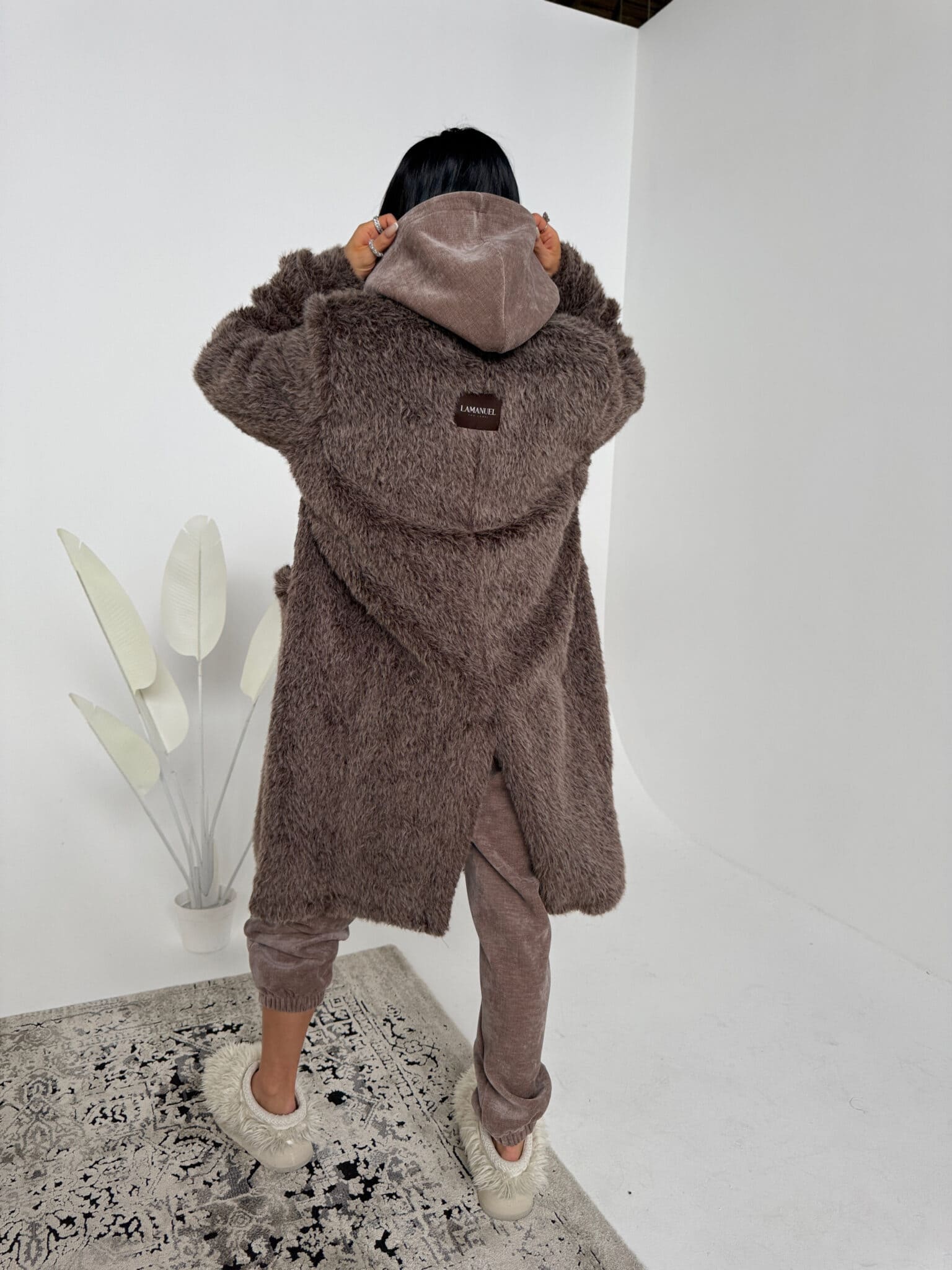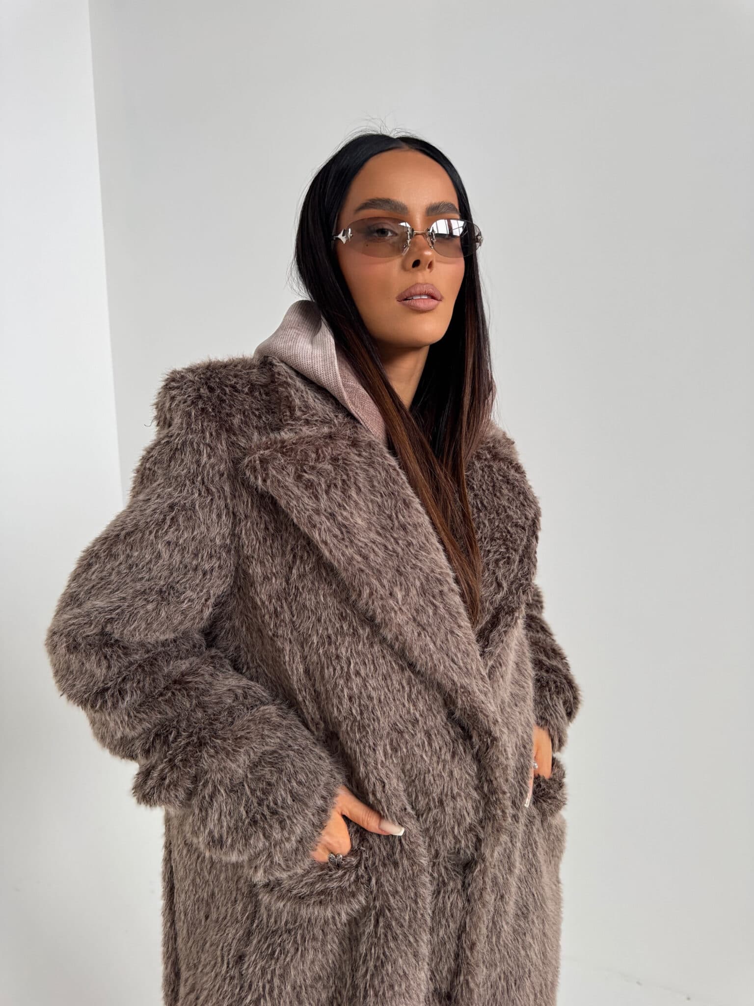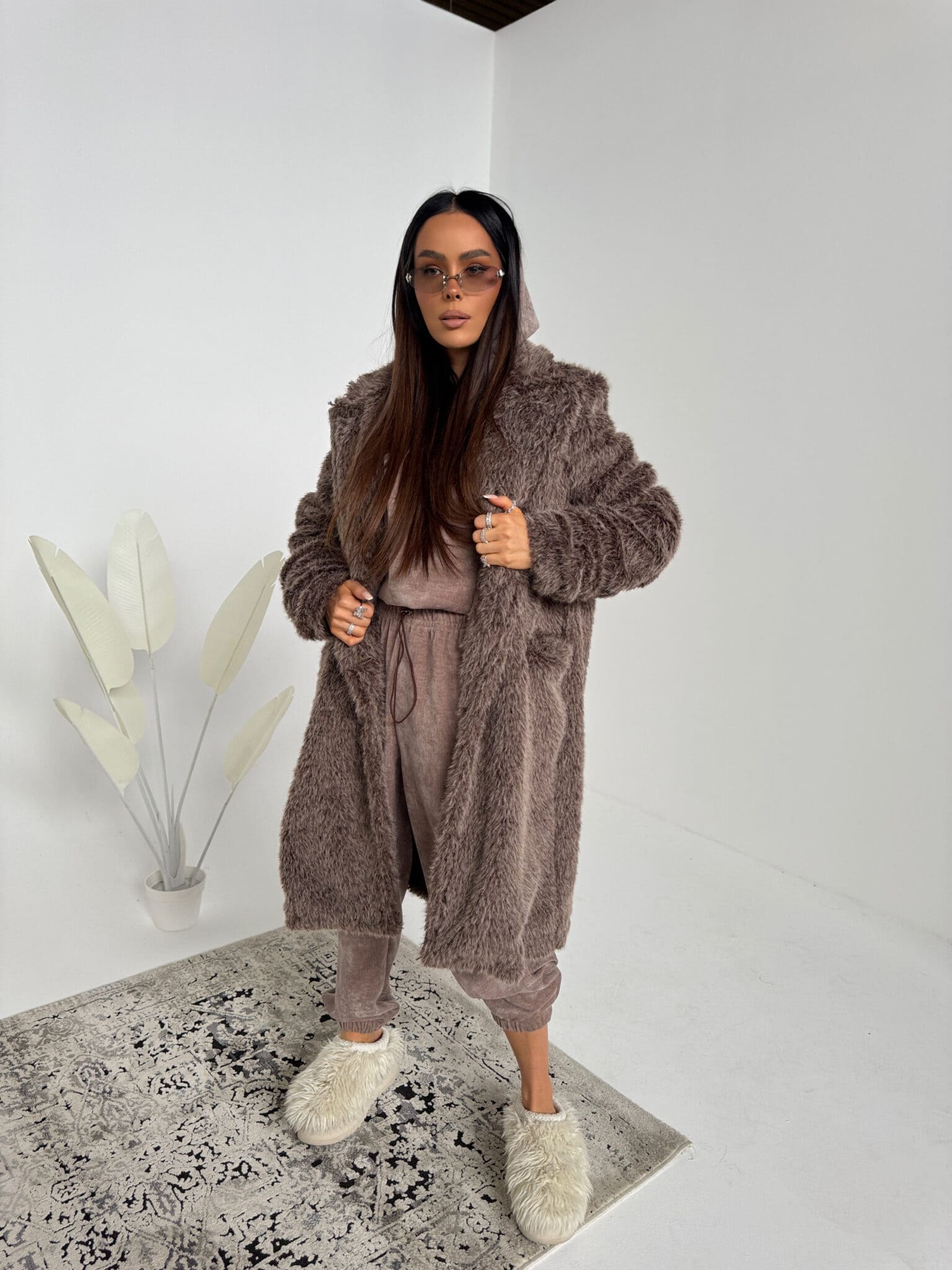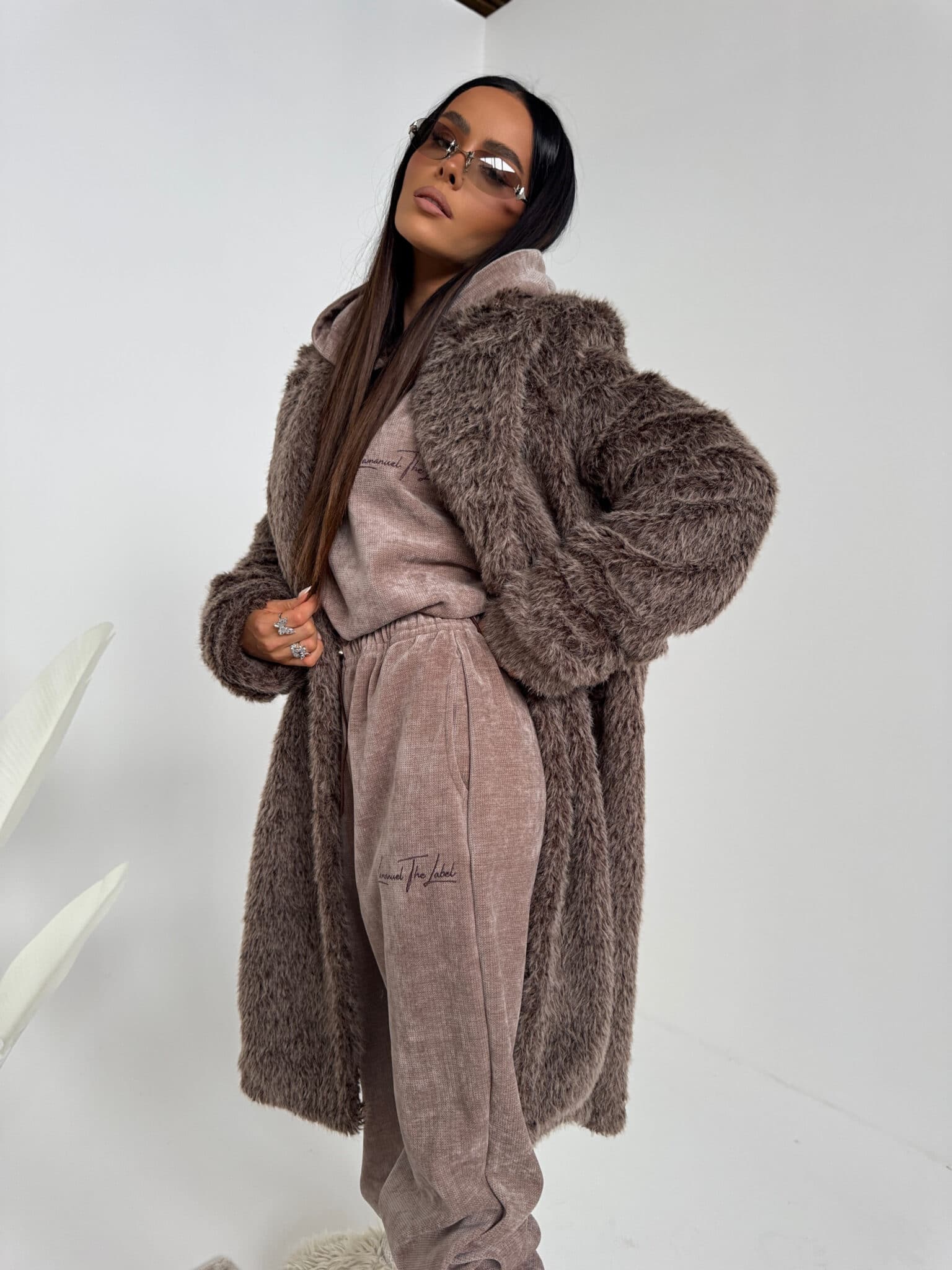 Ciepły, puszysty, spektakularny – ten płaszcz to zimowy statement piece, który łączy wygodę i styl na najwyższym poziomie. Wykonany z wyjątkowo mięsistego i miękkiego materiału typu miś, który od razu otula jak ciepły koc. Długość do kolan, luźny krój i podkreślone ramiona nadają mu modowego charakteru, a detal w postaci naszywki z logo z tyłu dodaje streetowego sznytu. Posiada umarszczone rękawy. To model, który sprawdzi się wszędzie: założysz go na spacer po mieście, wypad na kawę, zimowy city break czy nawet na luźne spotkanie z przyjaciółmi w stylu après-ski. Idealny do botków, kozaków, sneakersów – pasuje zarówno do joggerów, jak i dopasowanej sukienki. Stylowa alternatywa dla klasycznego płaszcza – komfort termiczny i modowy efekt gwarantowane.Skład: 100% poliester