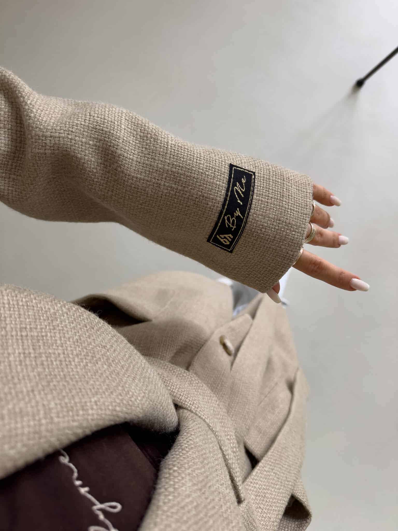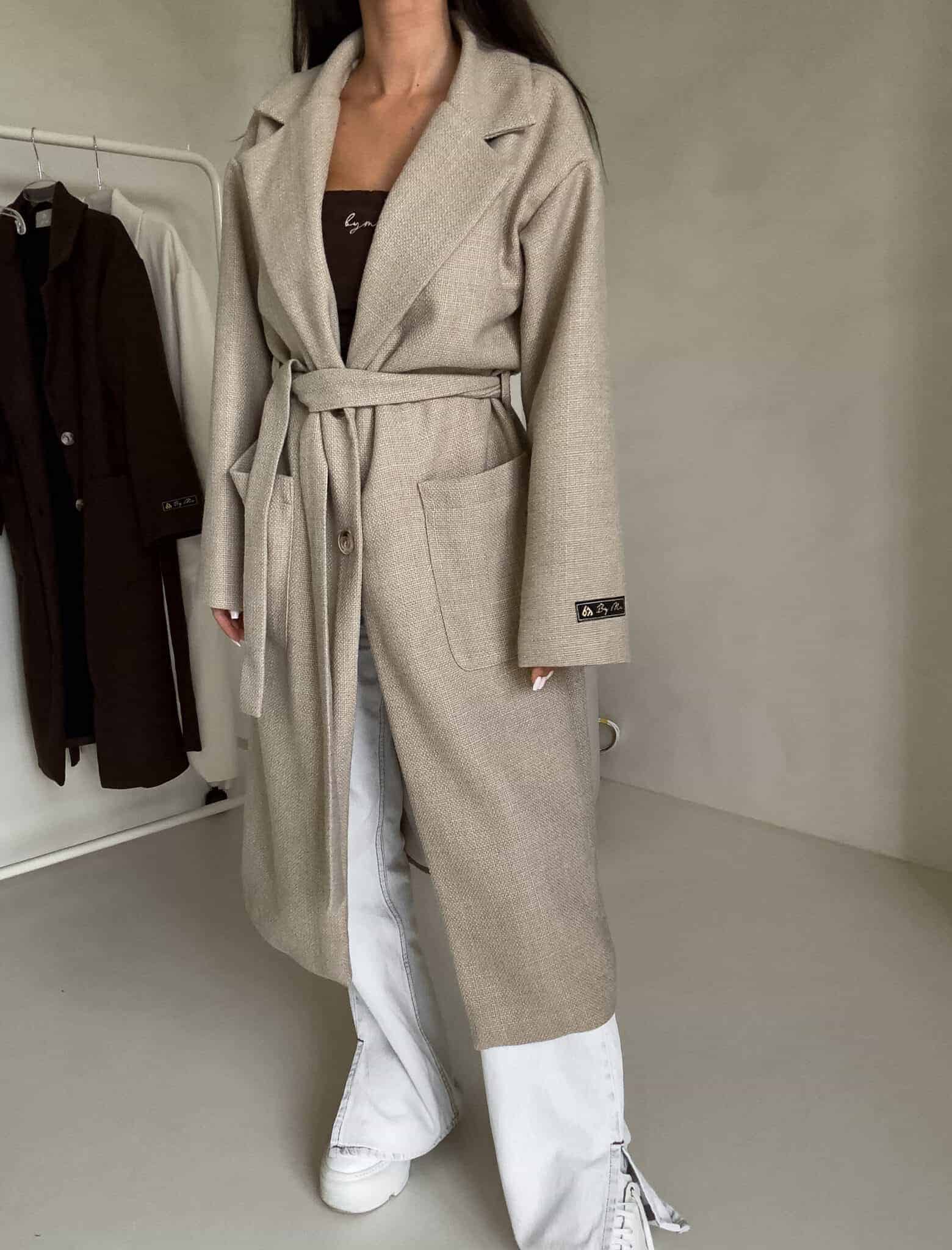 Model wyposażony jest w szeroki, klasyczny kołnierz z klapami. Zapięcie na pojedynczy guzik na wysokości talii oraz dołączony pasek. Na przodzie znajdują się duże, naszywane kieszenie. Dodatkowym akcentem jest naszywka z logo umieszczona na rękawie.