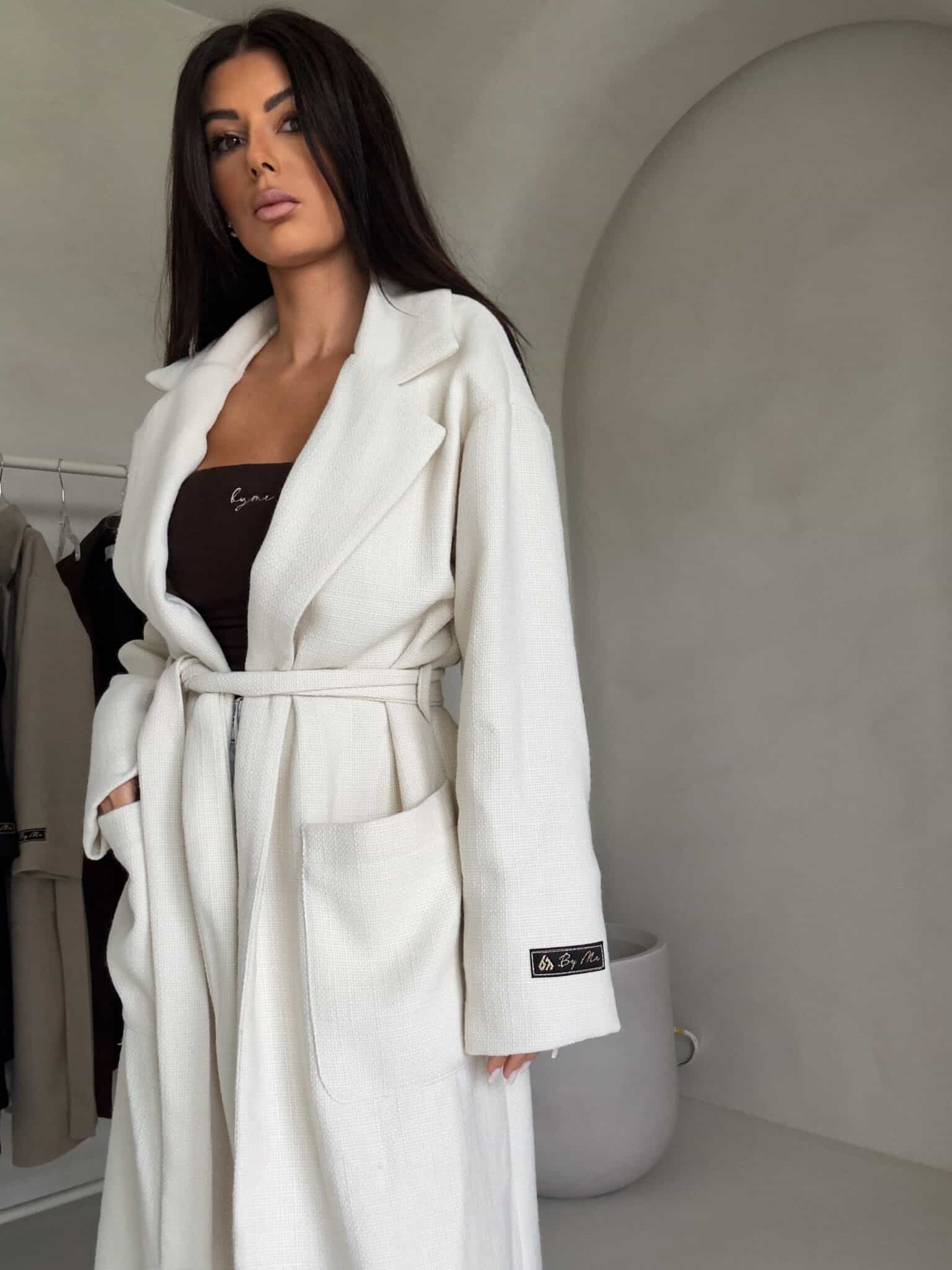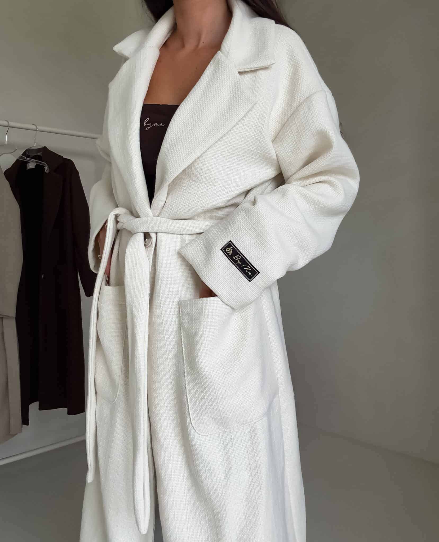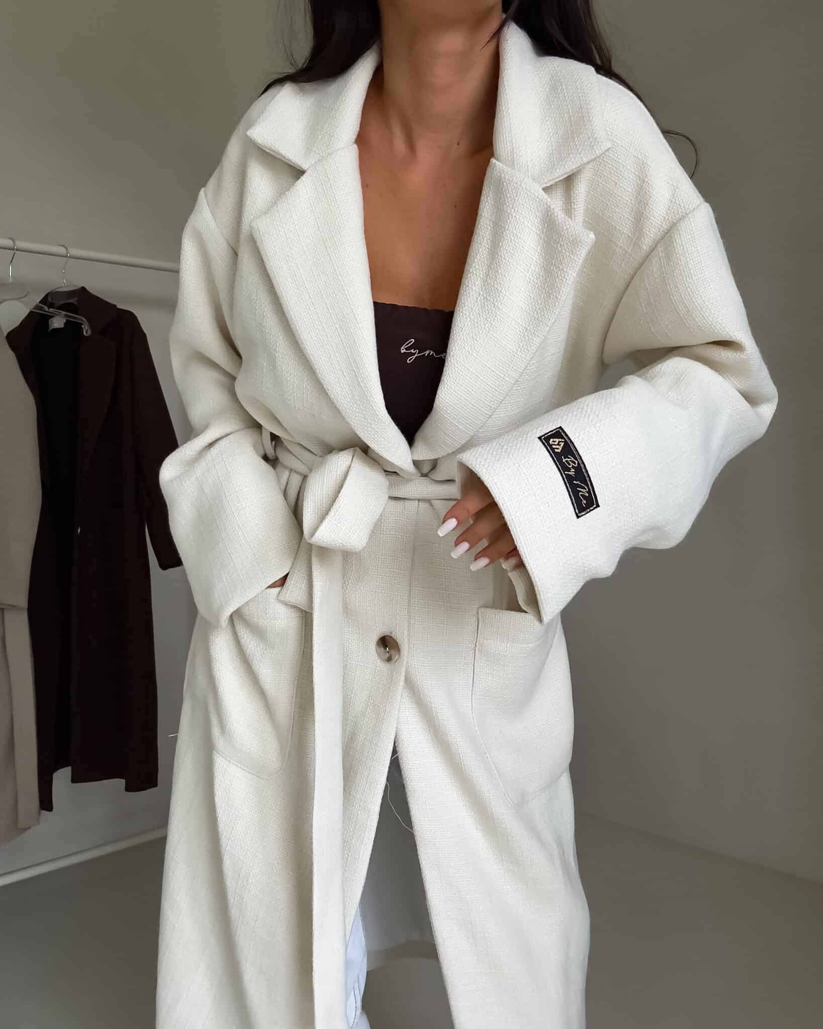 Model wyposażony jest w szeroki, klasyczny kołnierz z klapami. Zapięcie na pojedynczy guzik na wysokości talii oraz dołączony pasek. Na przodzie znajdują się duże, naszywane kieszenie. Dodatkowym akcentem jest naszywka z logo umieszczona na rękawie.