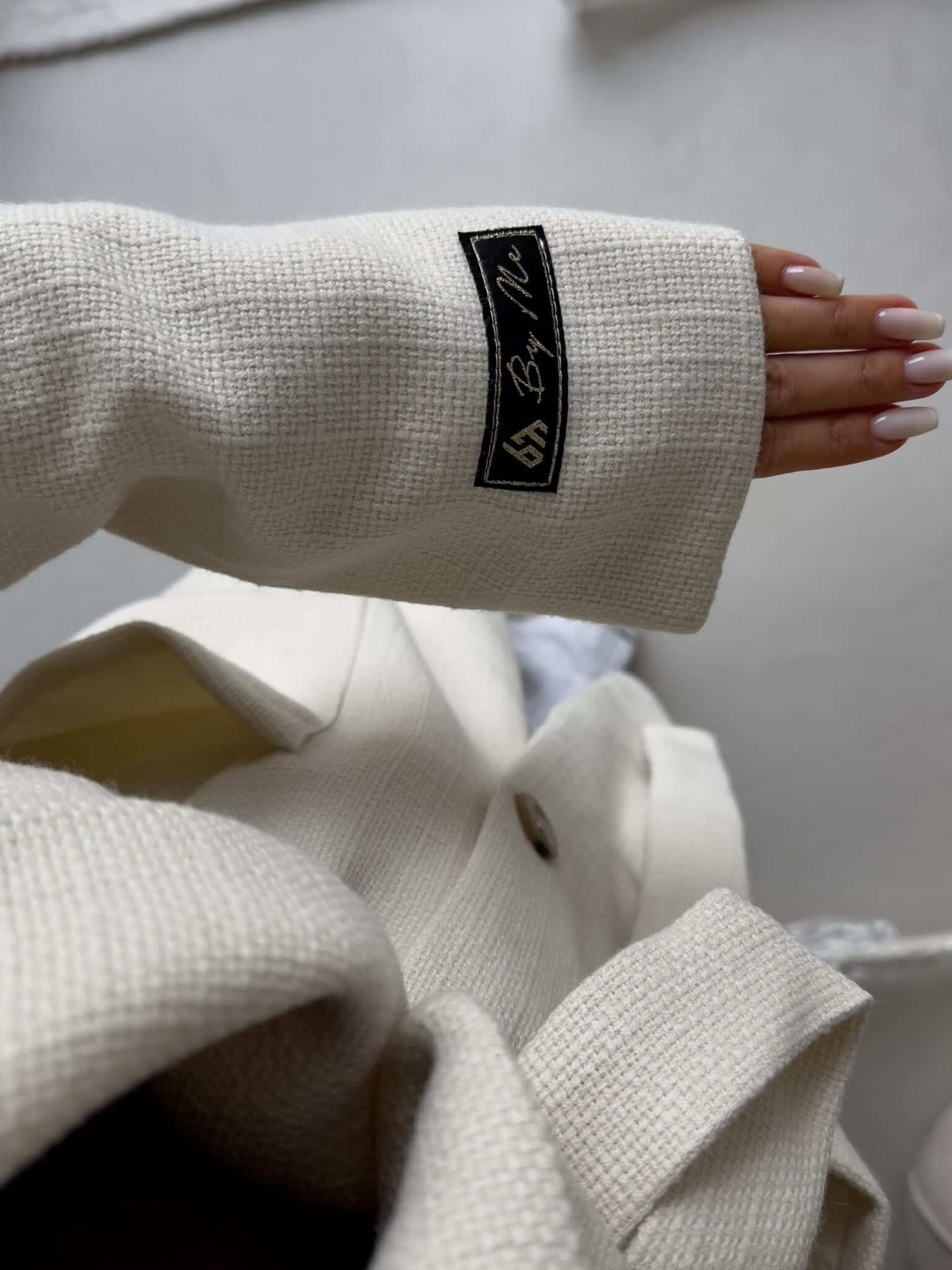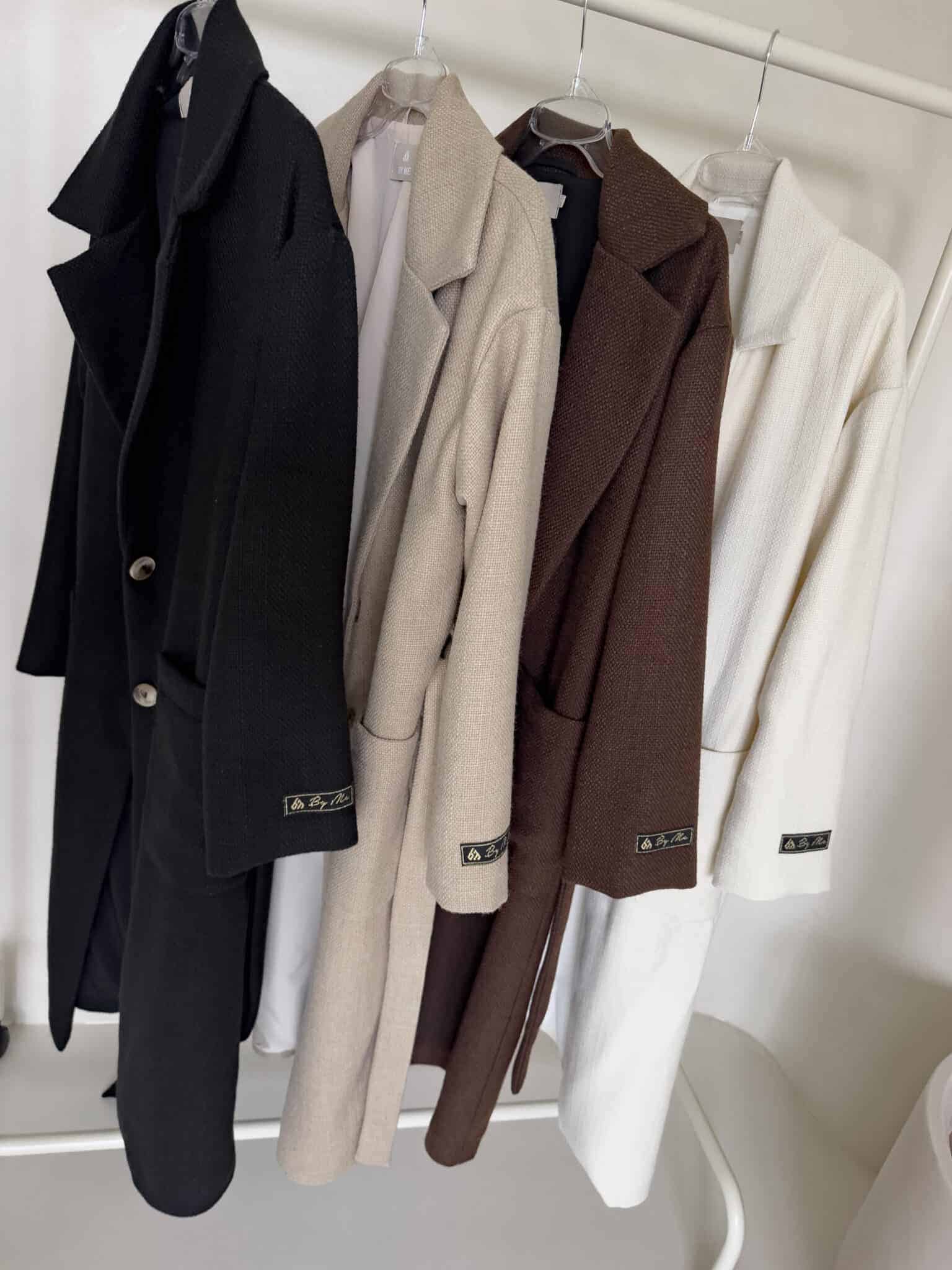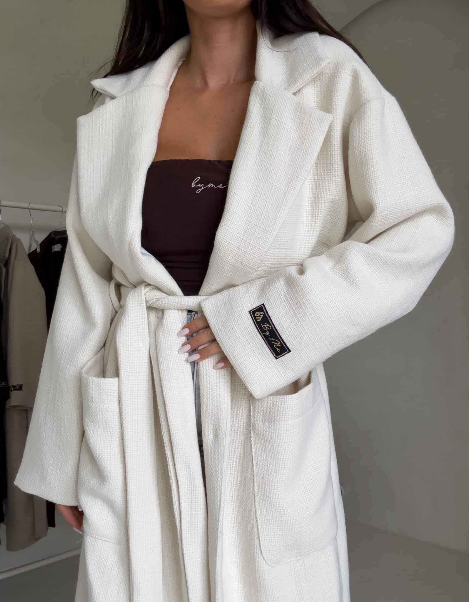 Model wyposażony jest w szeroki, klasyczny kołnierz z klapami. Zapięcie na pojedynczy guzik na wysokości talii oraz dołączony pasek. Na przodzie znajdują się duże, naszywane kieszenie. Dodatkowym akcentem jest naszywka z logo umieszczona na rękawie.