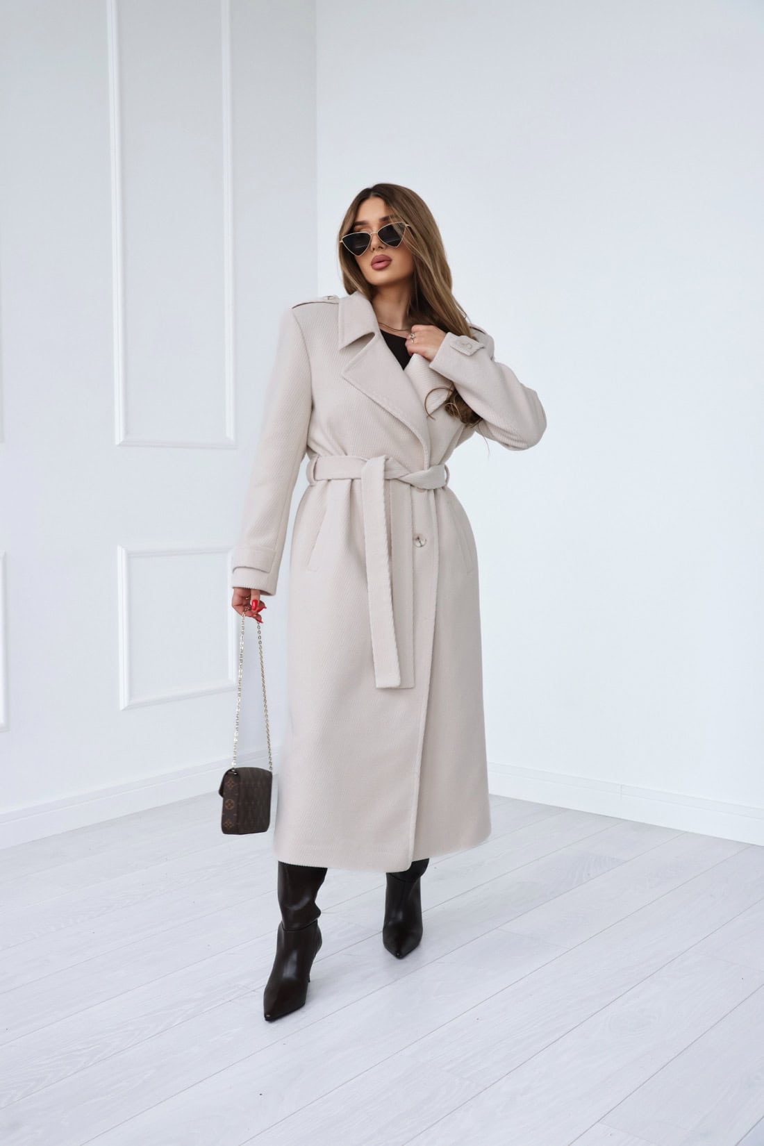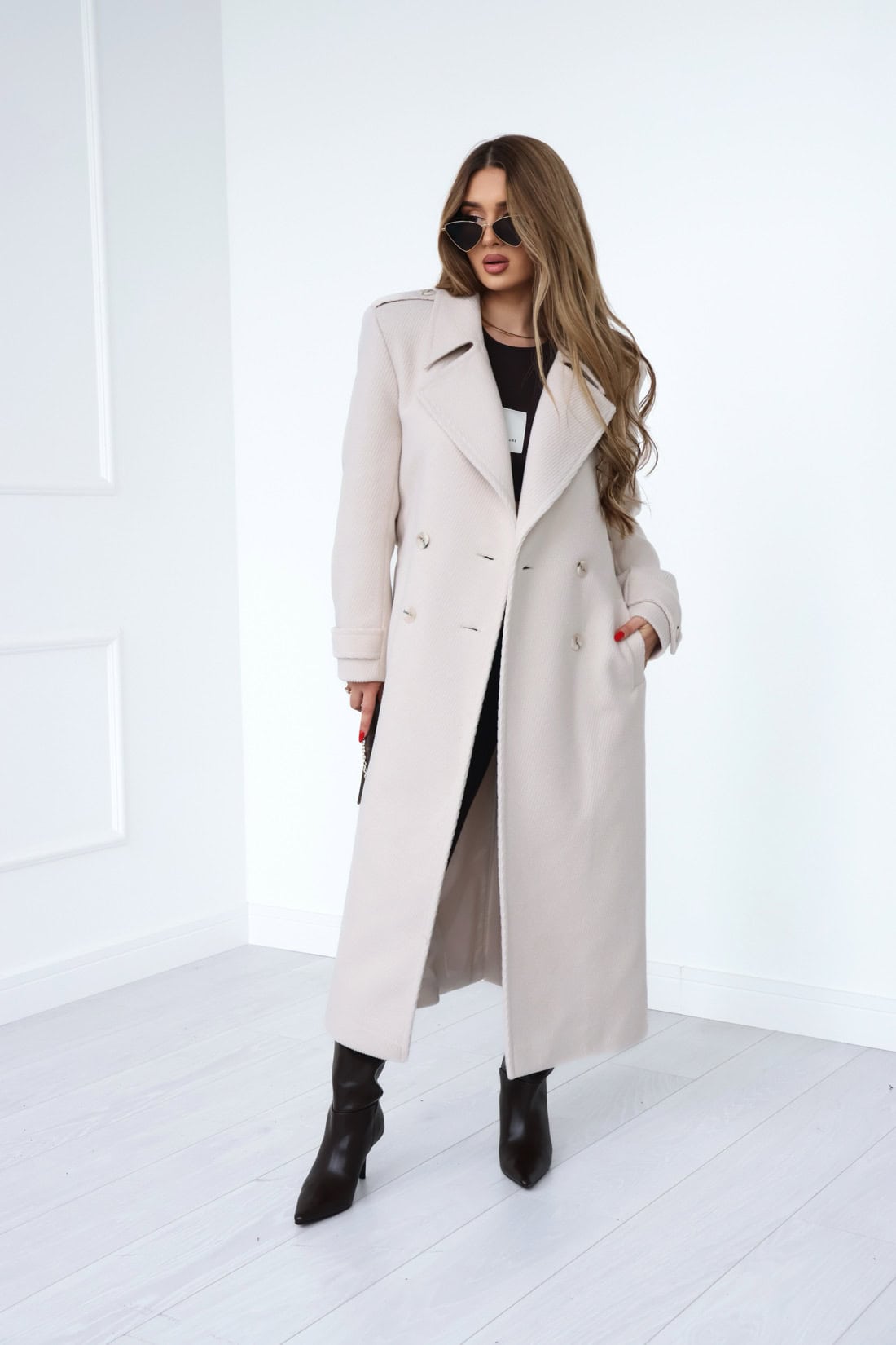 Opis produktu: Długi elegancki płaszcz z .Dwurzędowy, zapinany na guziki. Posiada kieszenie po bokach. Ozdobna bawełniana naszywka z logo marki BG Brandenburg Couture naszyta na karczku. Dodatkowo wysokie poduszki w ramionach dodają szyku. Płaszcz na podszewce.