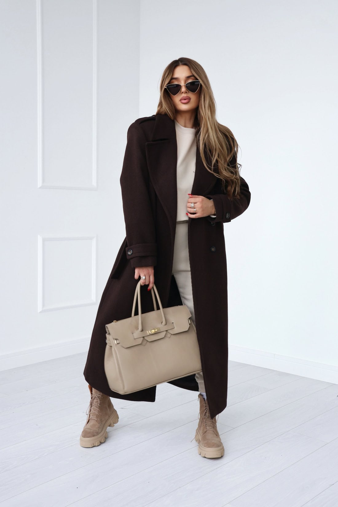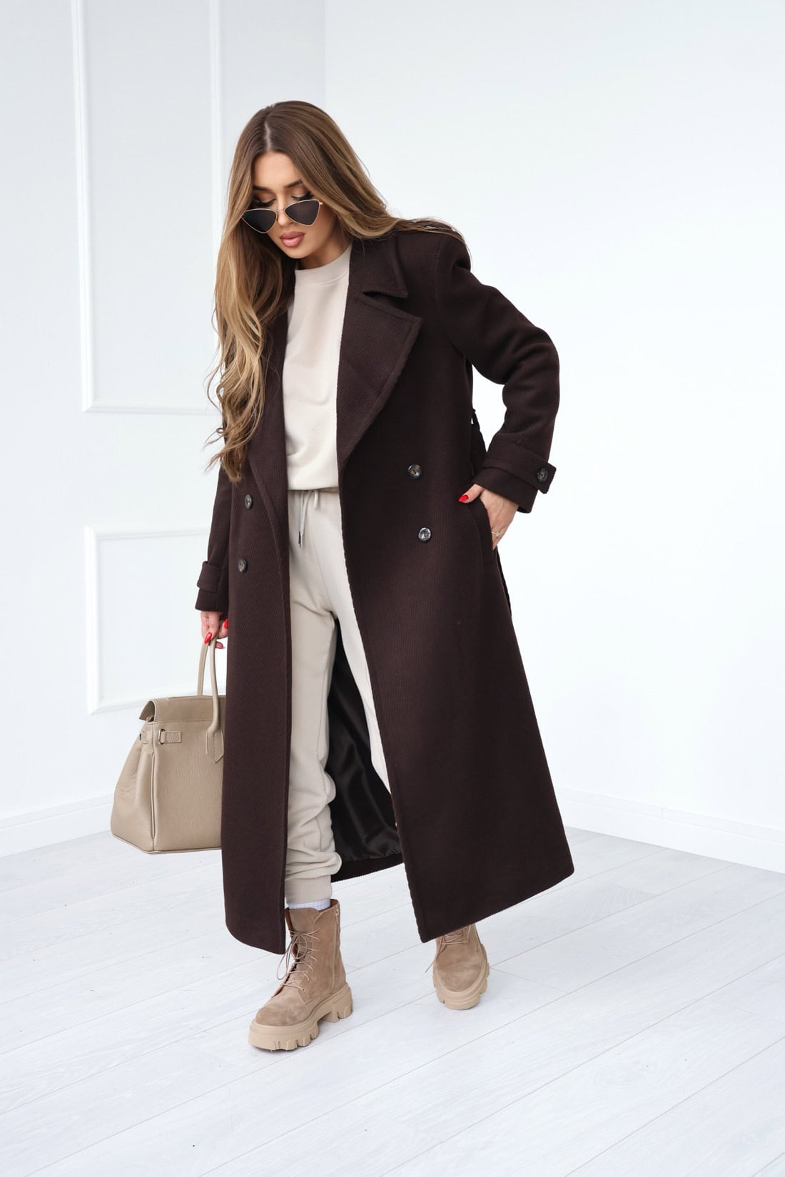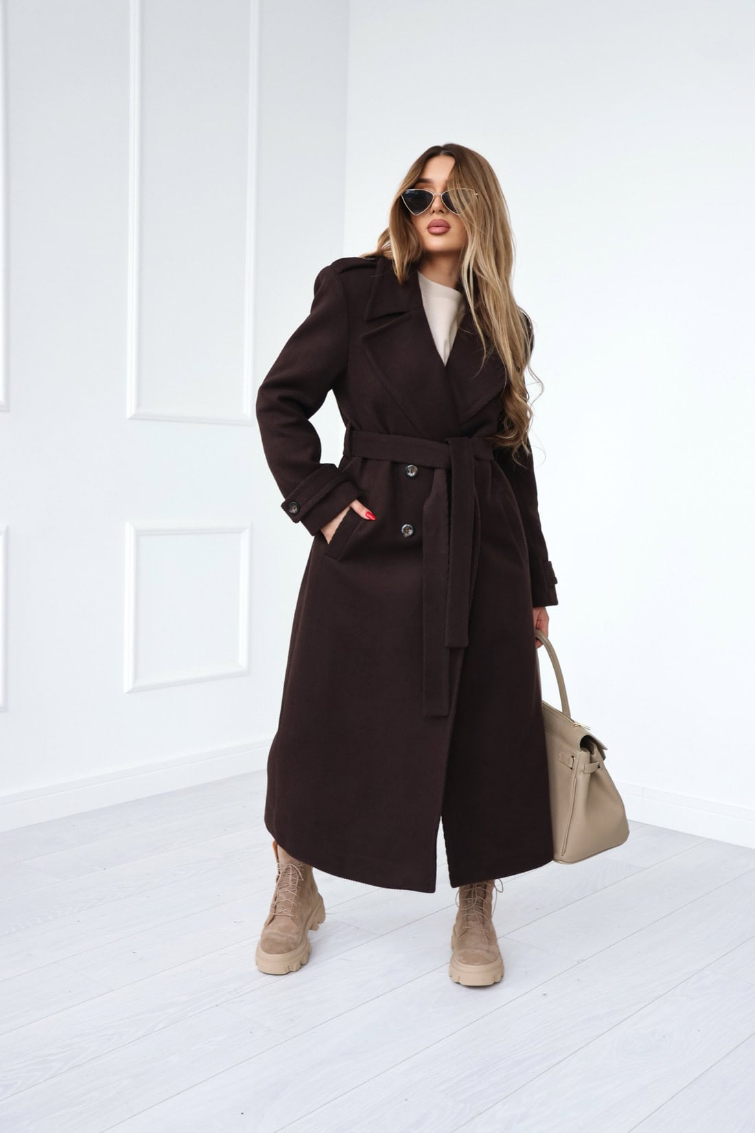 Opis produktu: Długi elegancki płaszcz z .Dwurzędowy, zapinany na guziki. Posiada kieszenie po bokach. Ozdobna bawełniana naszywka z logo marki BG Brandenburg Couture naszyta na karczku. Dodatkowo wysokie poduszki w ramionach dodają szyku. Płaszcz na podszewce.
