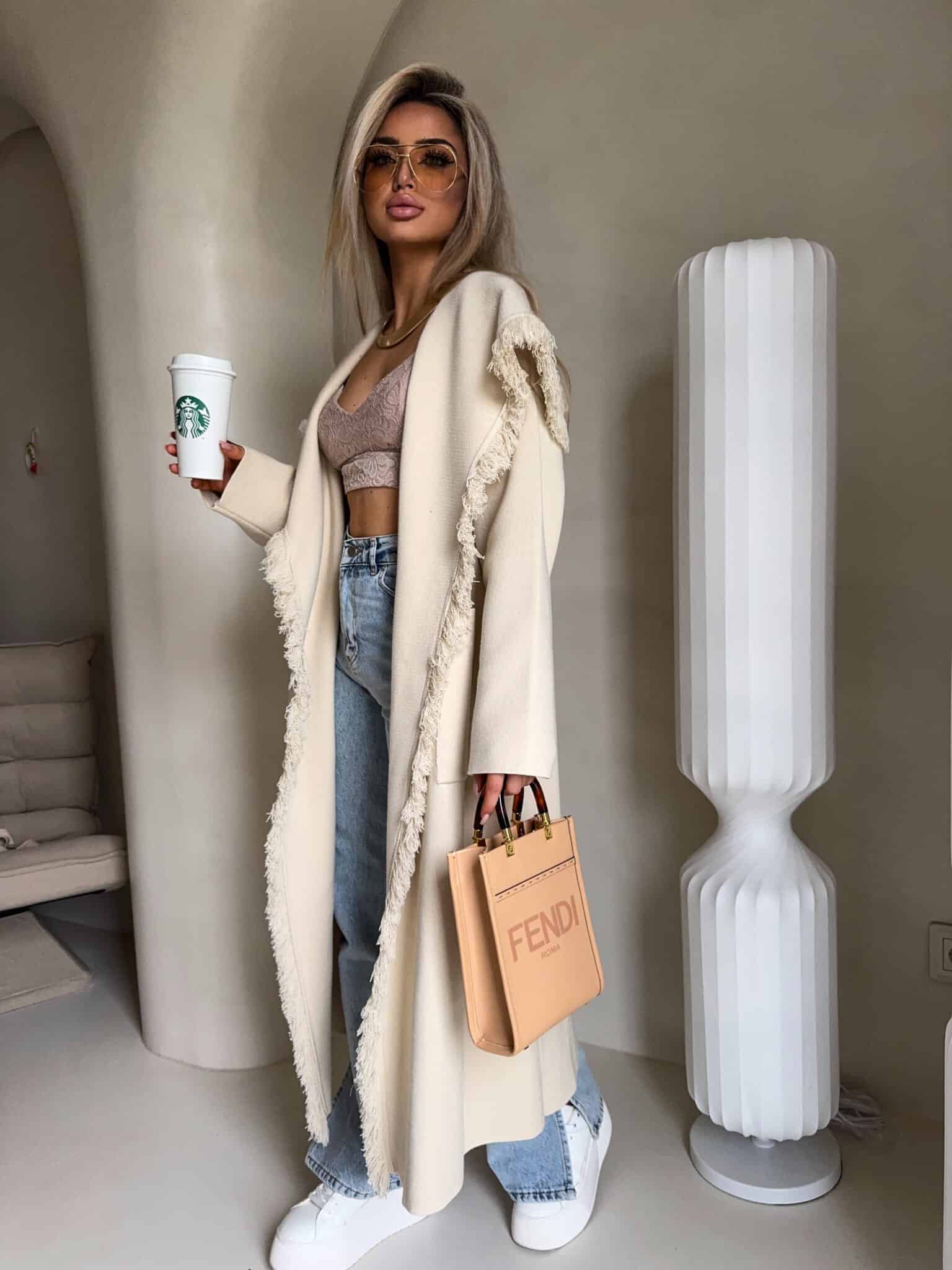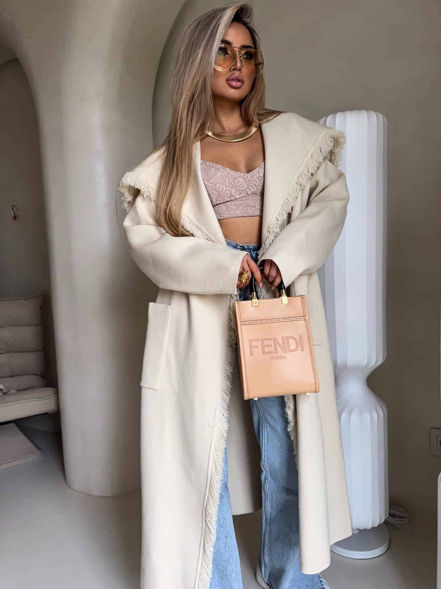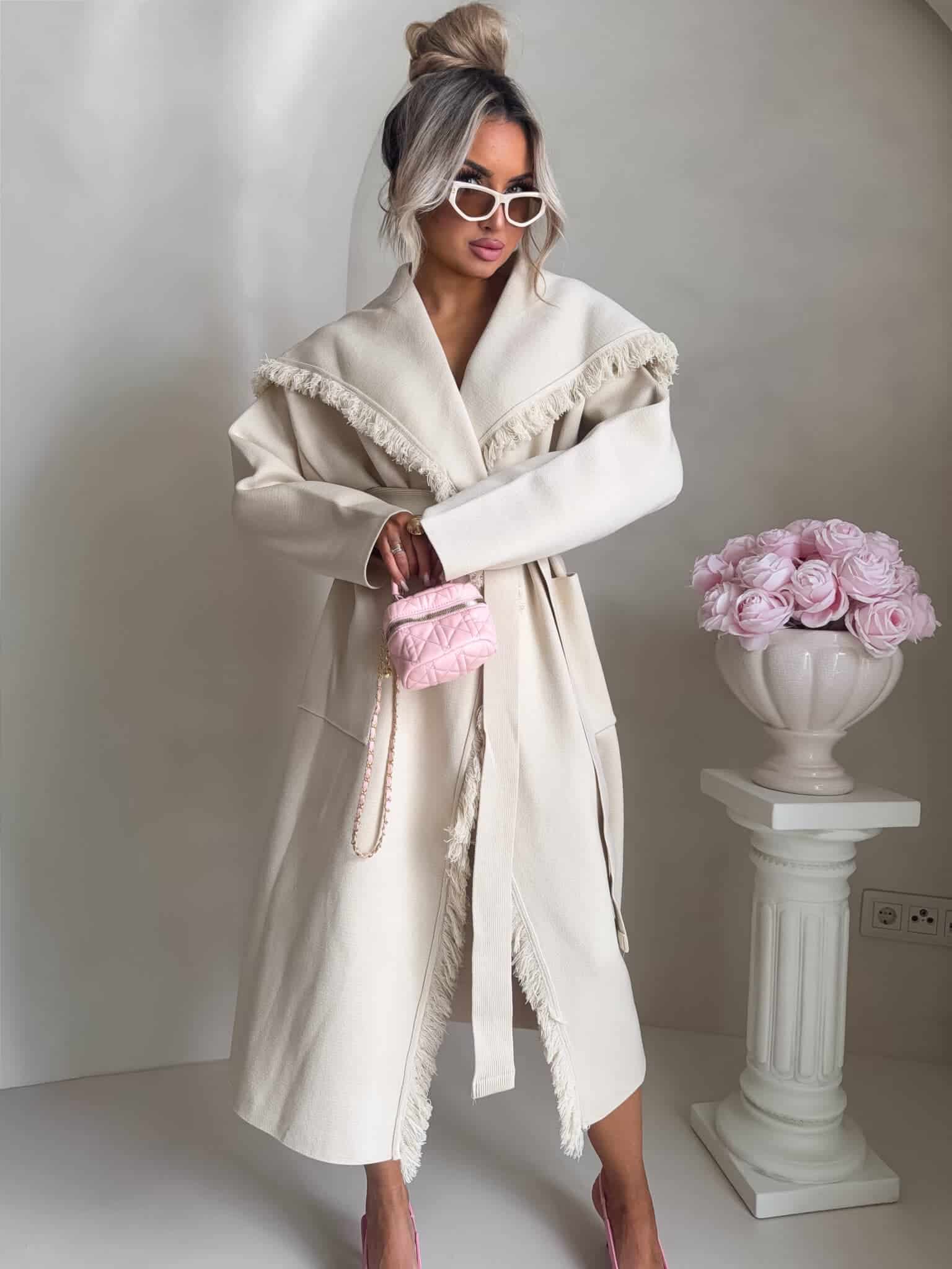 Płaszcz DIVA to model o lekko oversize’owym kroju, wiązany w pasie szerokim paskiem, który pięknie podkreśla talię i pozwala dopasować sylwetkę do własnych preferencji. Długość sięgająca za kolano. Szeroki, opadający kołnierz został ozdobiony dekoracyjnymi strzępieniami, które pojawiają się również wzdłuż zapięcia oraz na dole płaszcza. Po bokach znajdują się praktyczne, wpuszczane kieszenie.