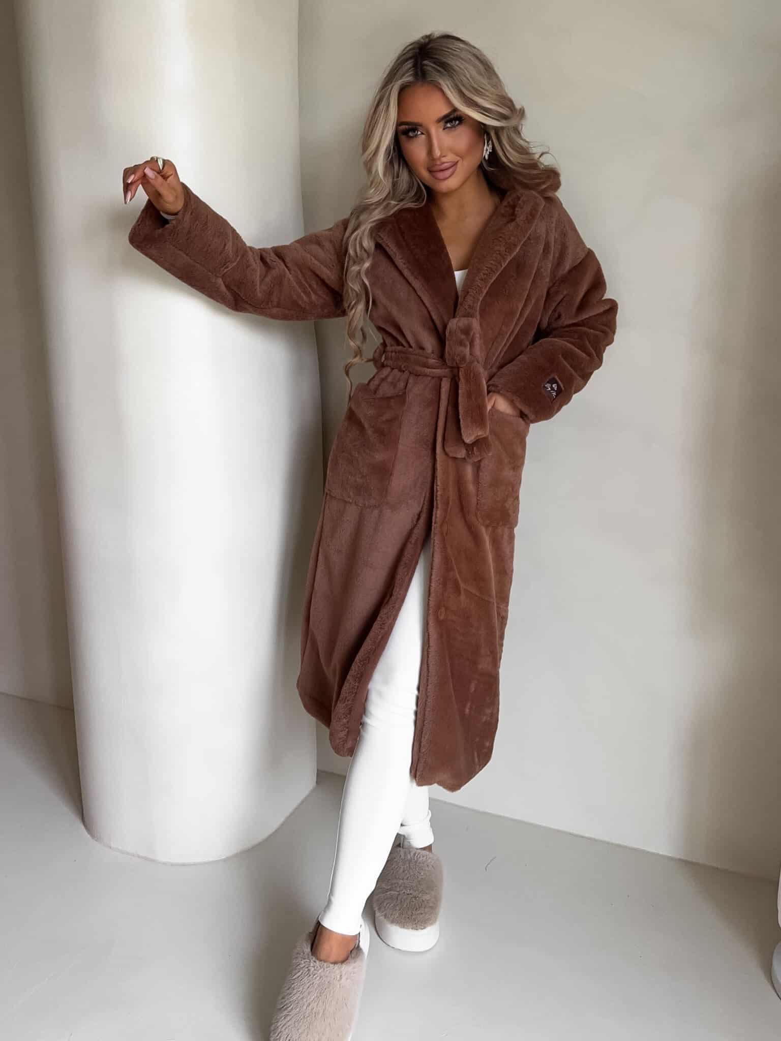 Ciepły płaszcz z podszewką, posiada kieszenie. Zapinany na guziki. Na lewym rękawie naszywka z logo By Me.